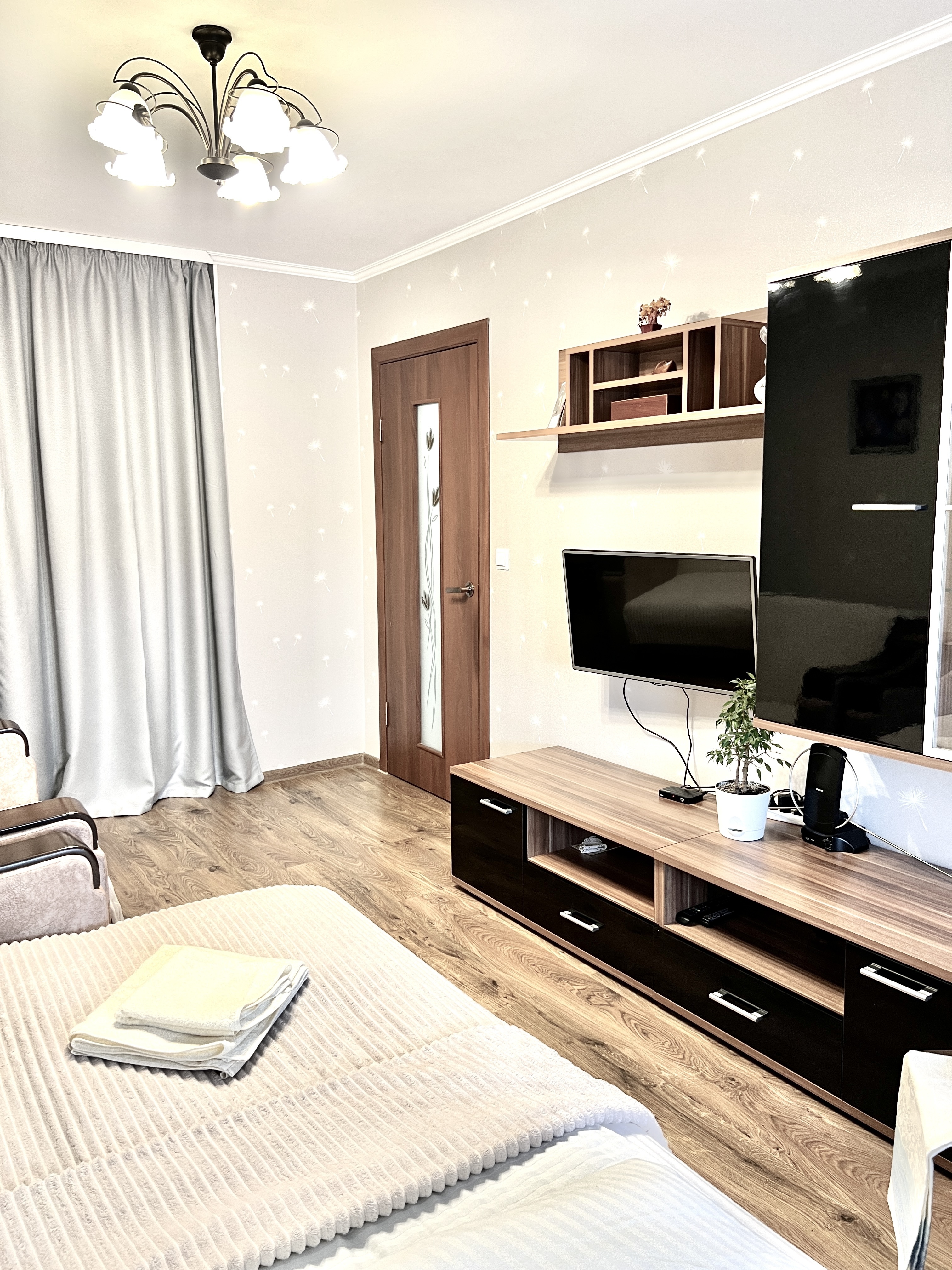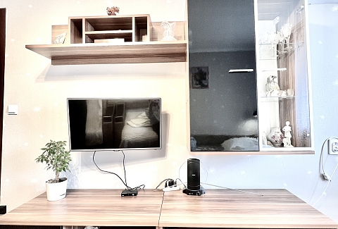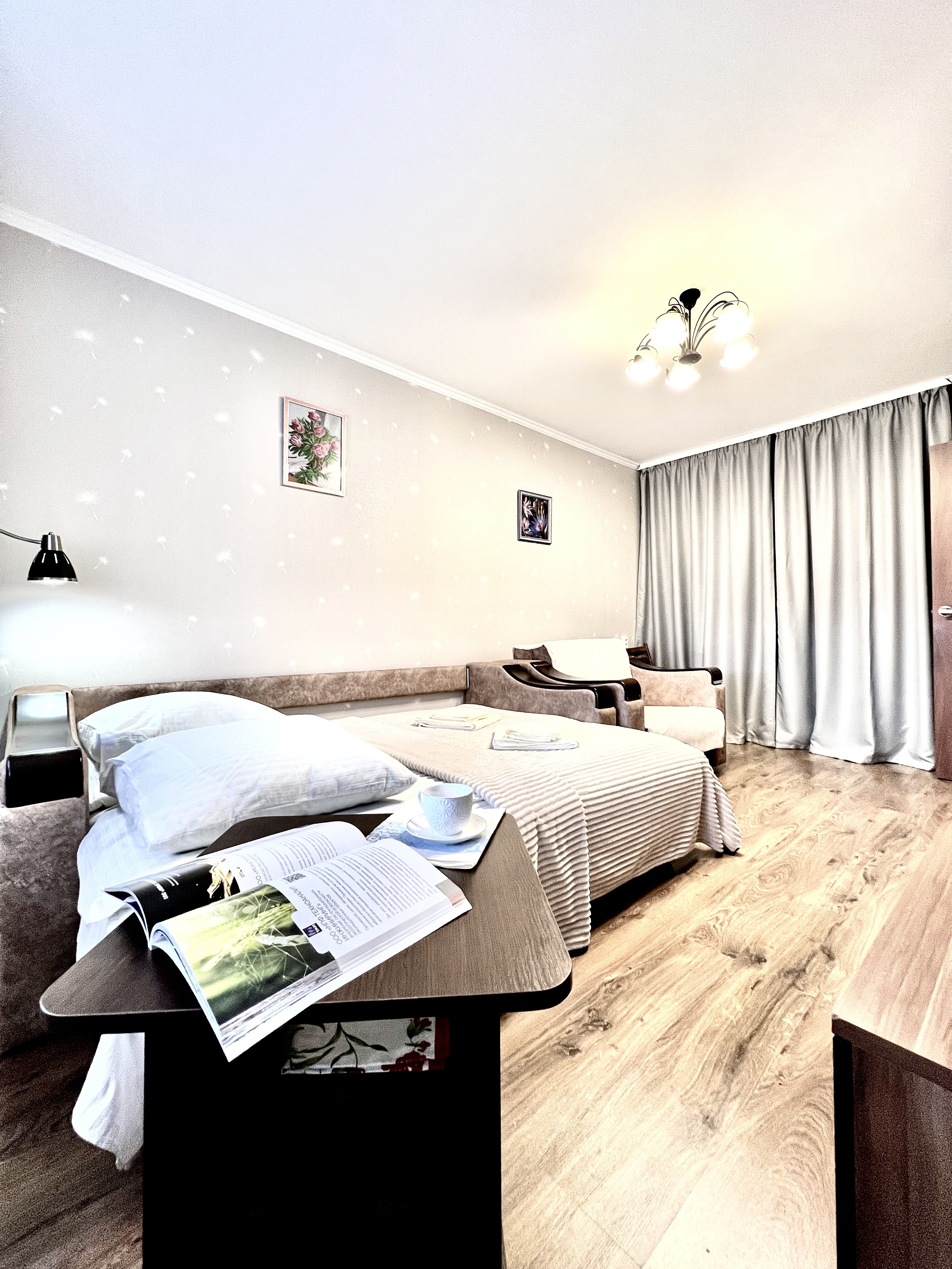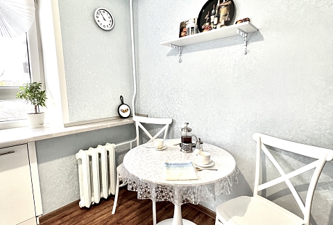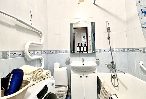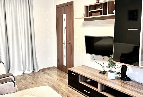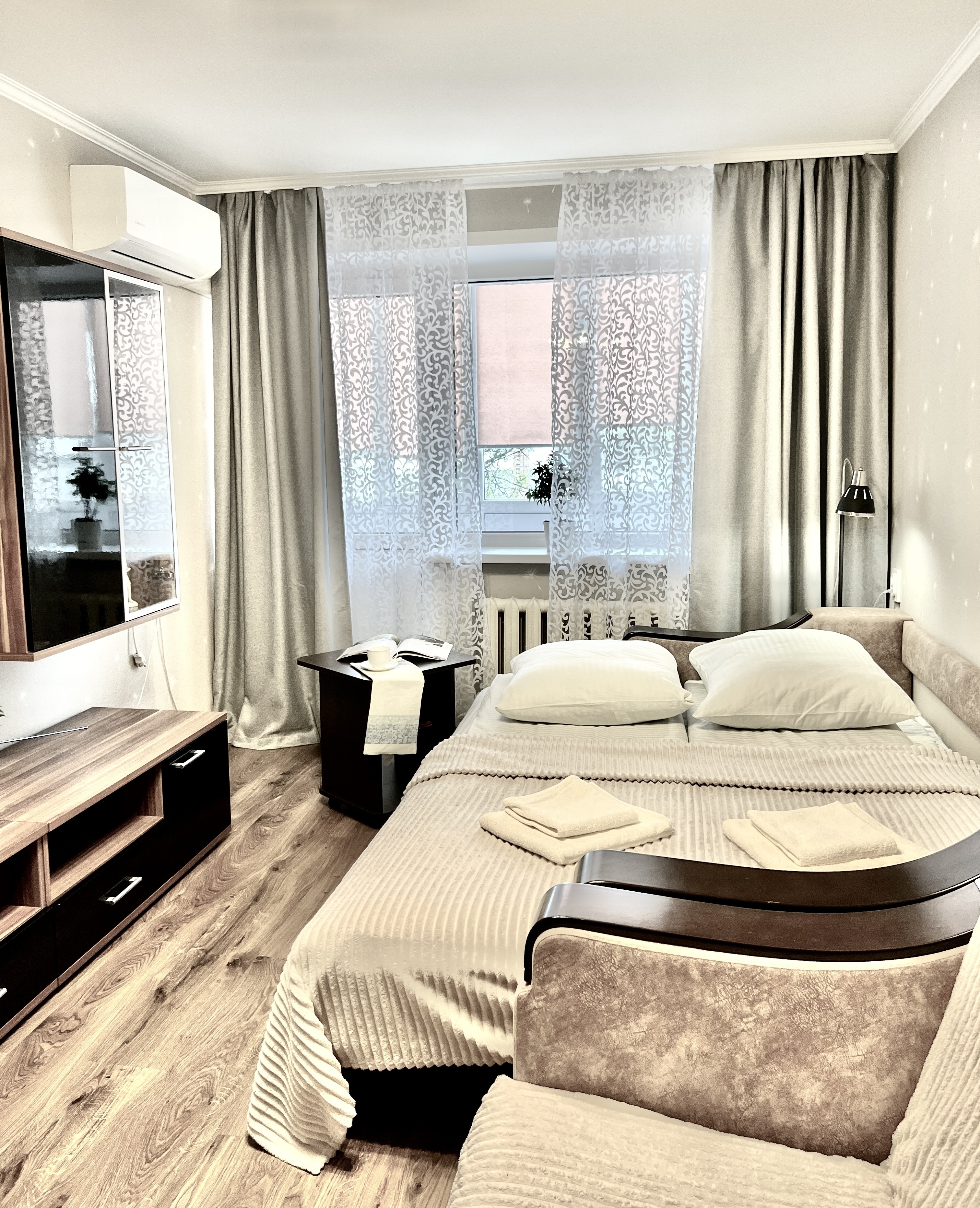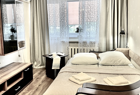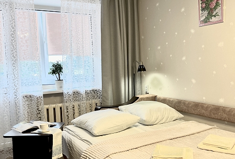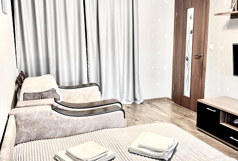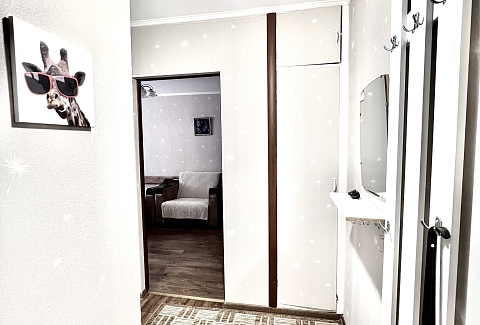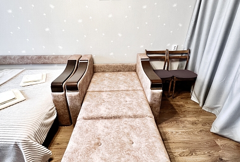 В номере: вешалка, зеркало, кресло-кровать, кровать двуспальная, стол, стулья, шкаф, кондиционер, микроволновая печь, плита газовая, стиральная машина, телевизор, утюг, холодильник, чайный набор посуды, электрочайник
