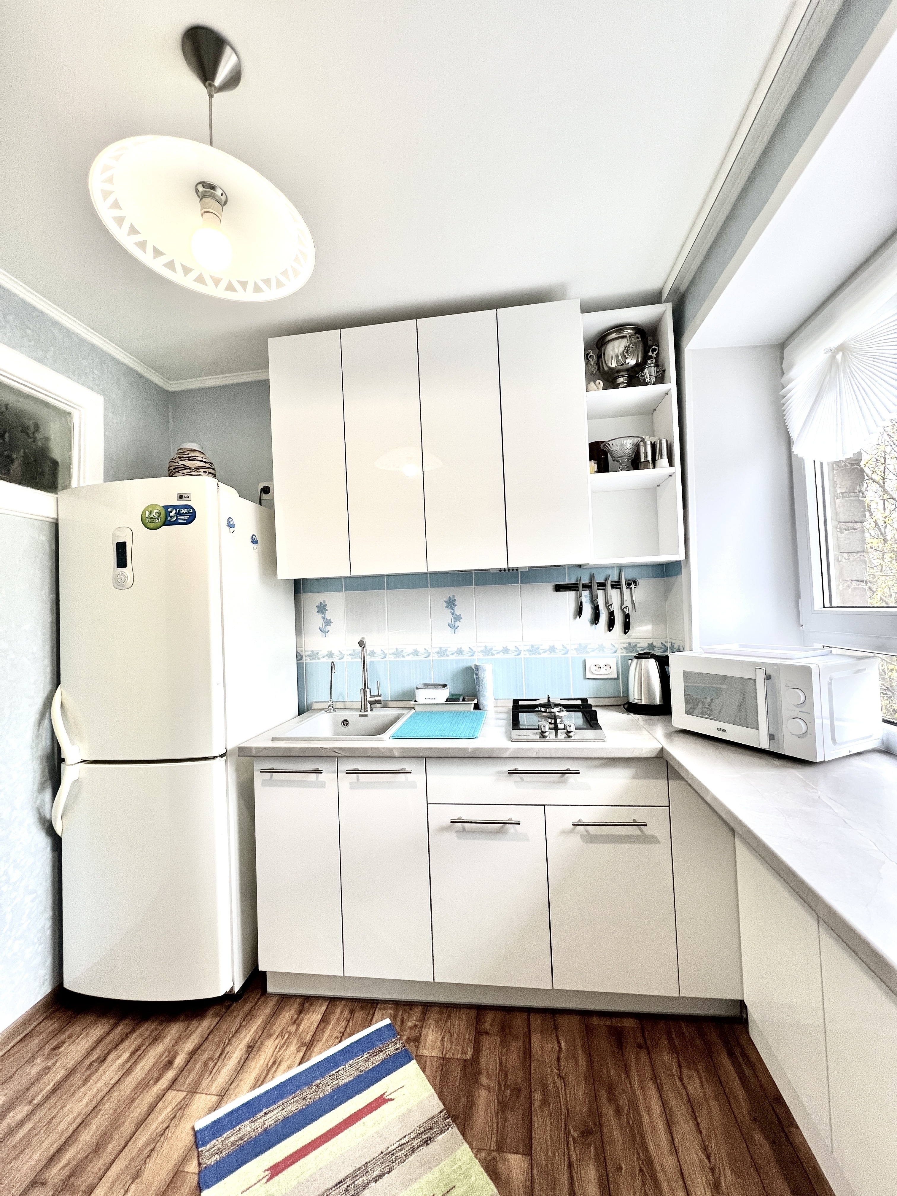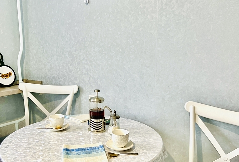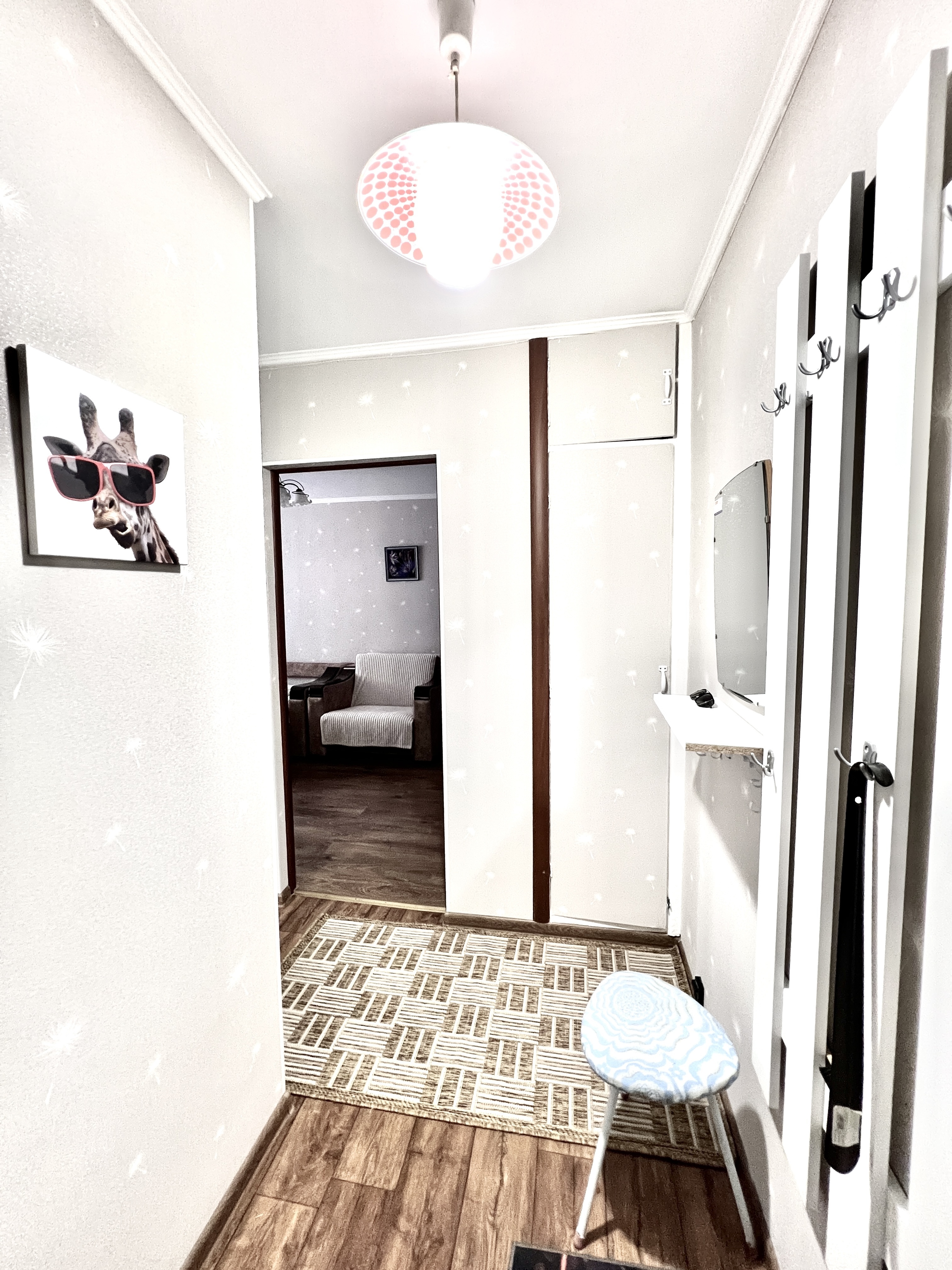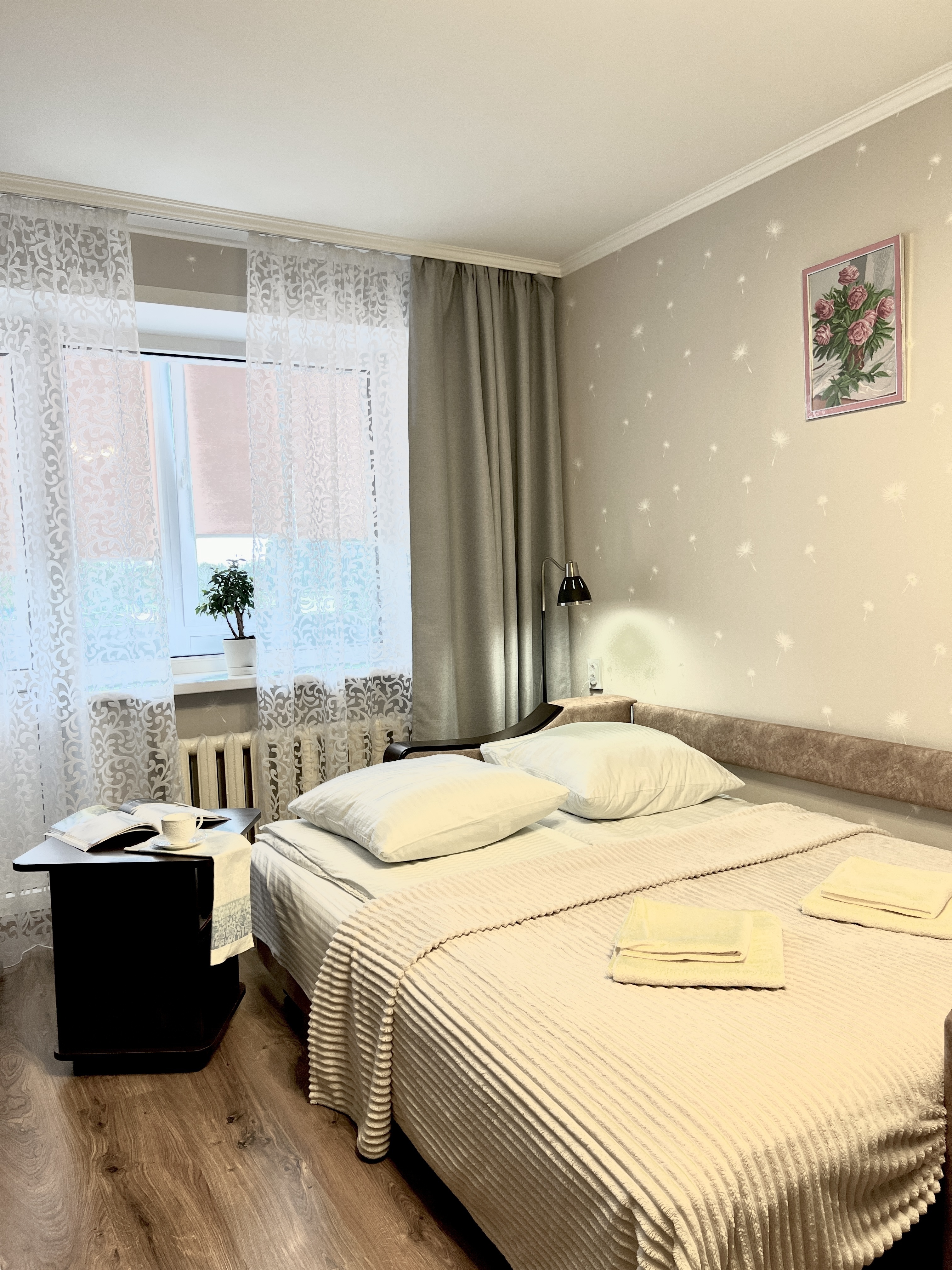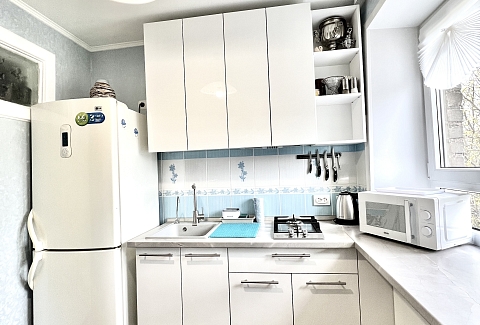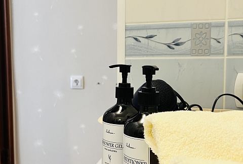 В номере: вешалка, зеркало, кресло-кровать, кровать двуспальная, стол, стулья, шкаф, кондиционер, микроволновая печь, плита газовая, стиральная машина, телевизор, утюг, холодильник, чайный набор посуды, электрочайник