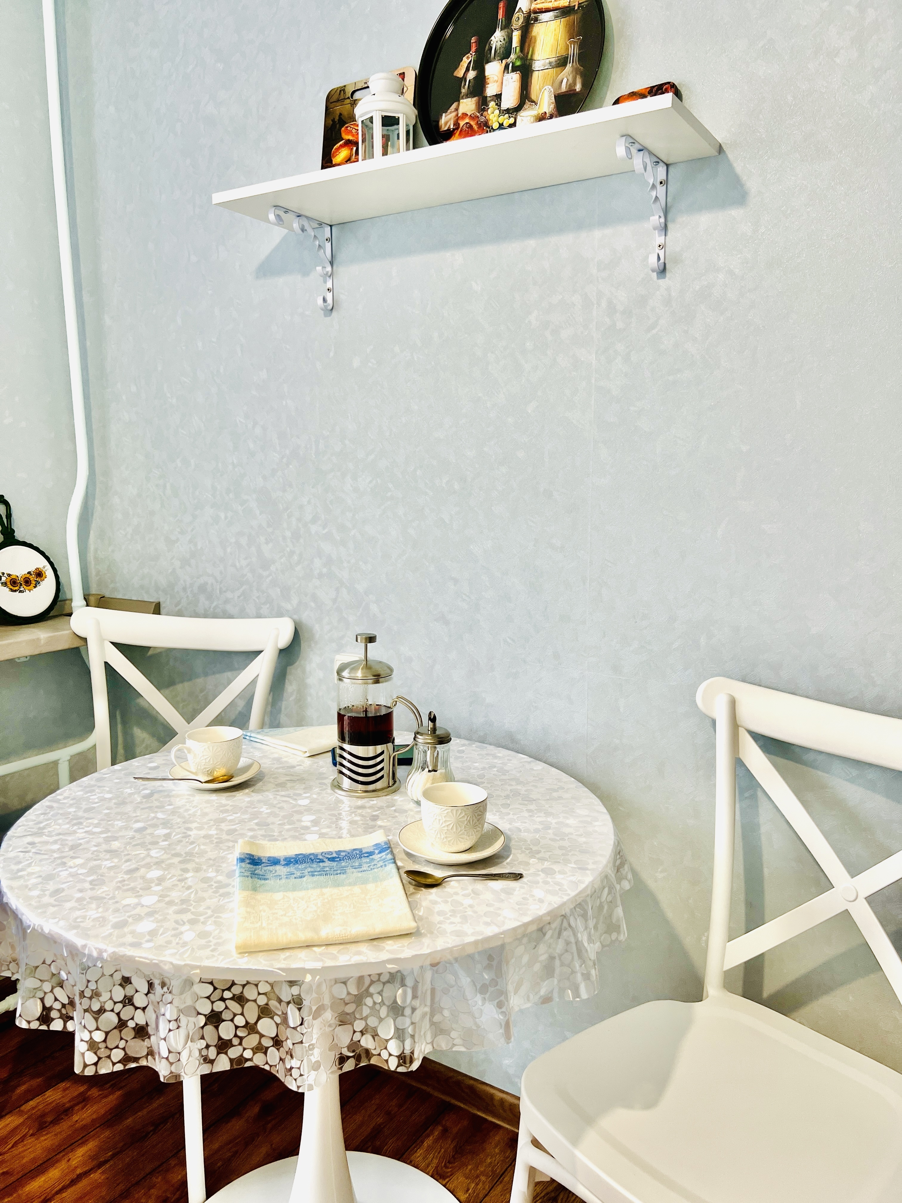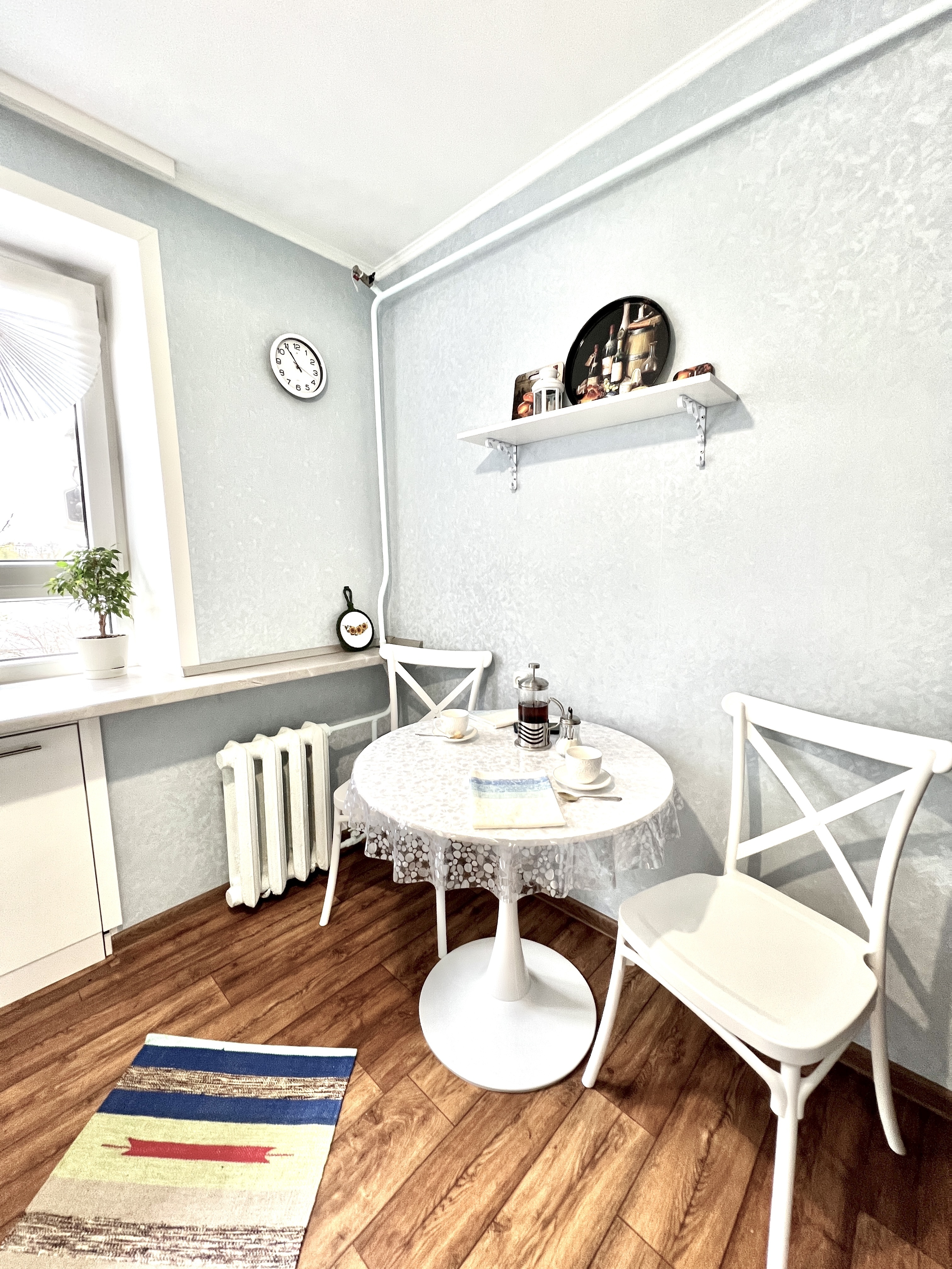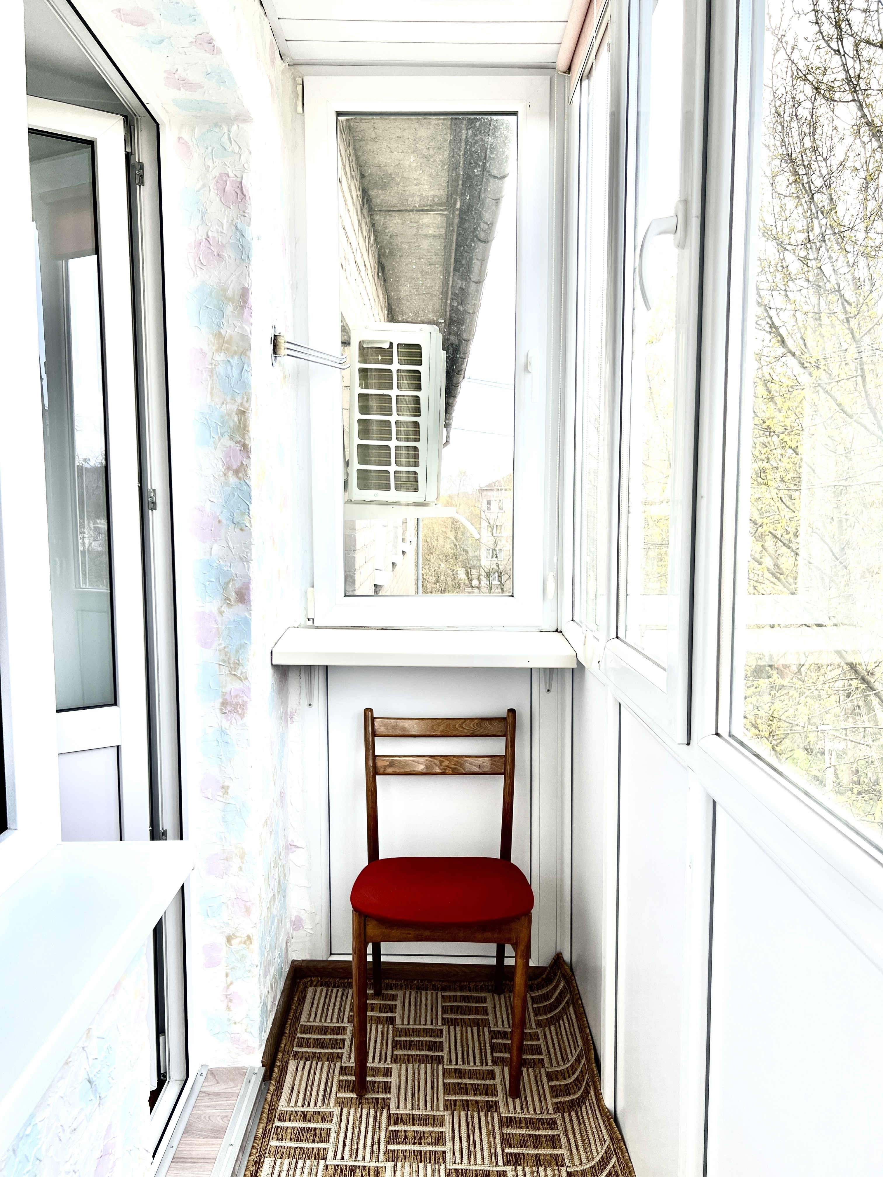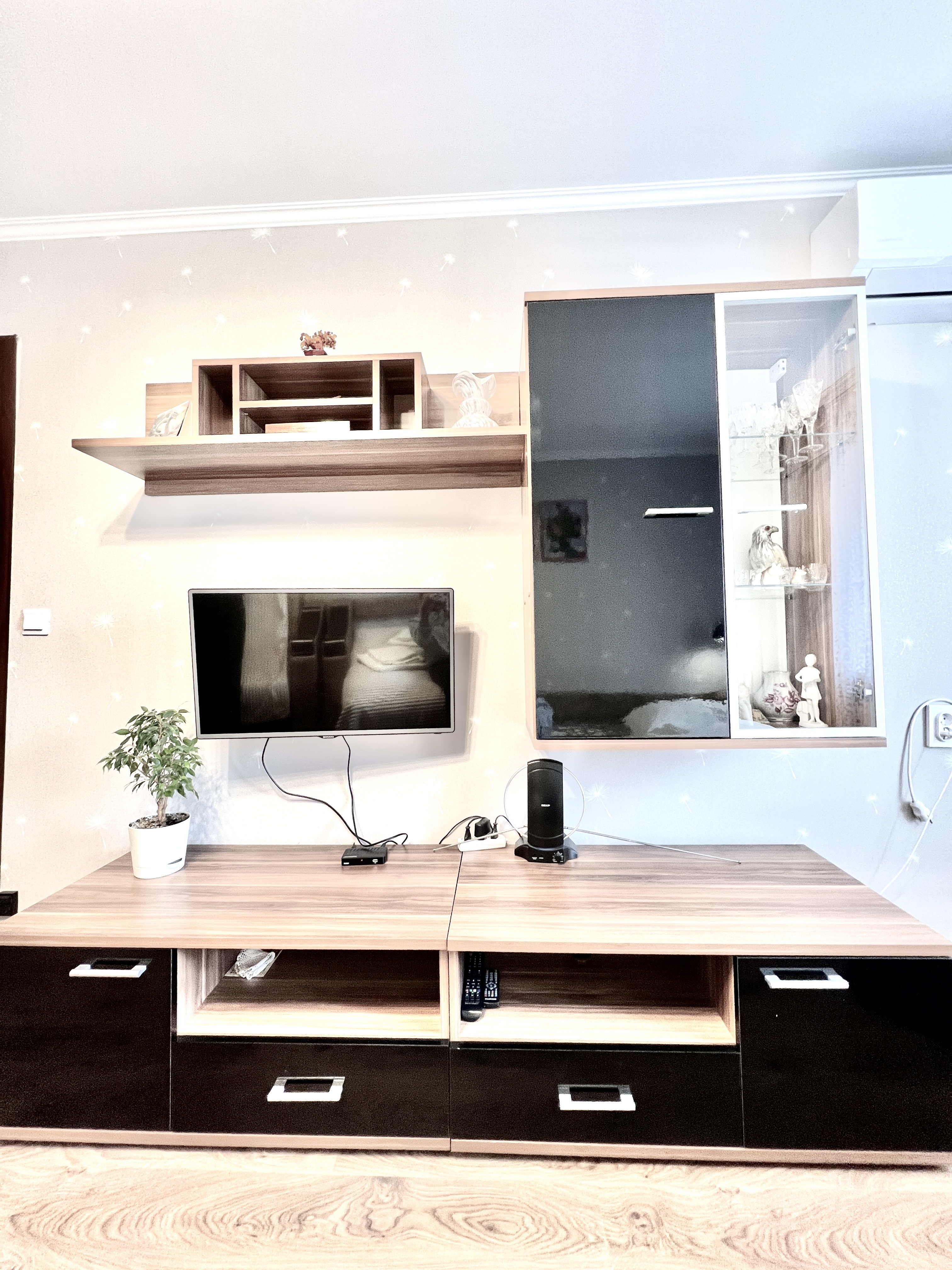 В номере: вешалка, зеркало, кресло-кровать, кровать двуспальная, стол, стулья, шкаф, кондиционер, микроволновая печь, плита газовая, стиральная машина, телевизор, утюг, холодильник, чайный набор посуды, электрочайник