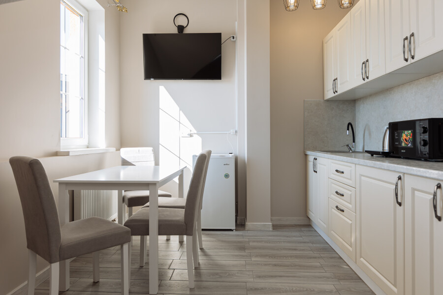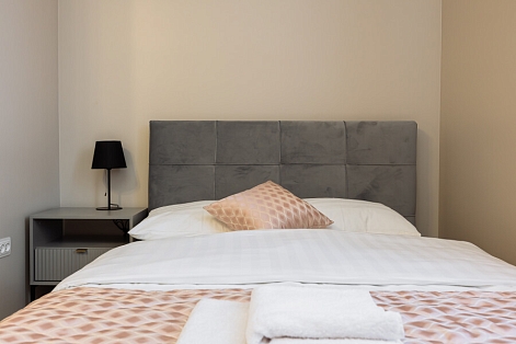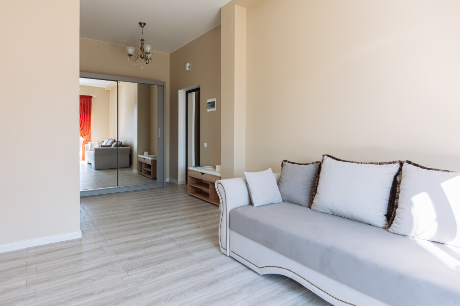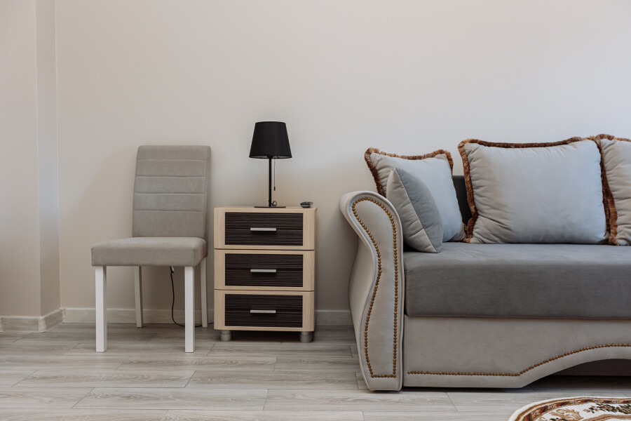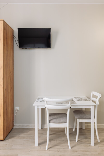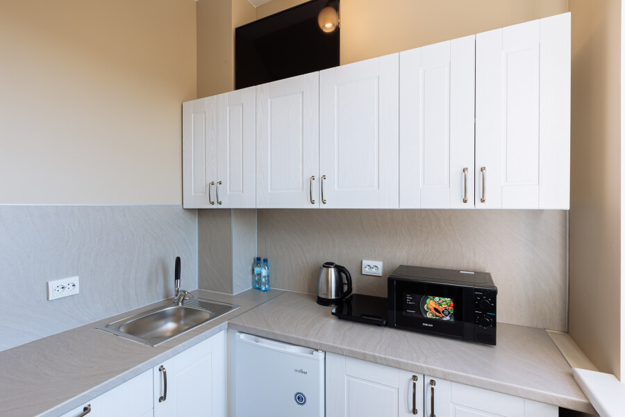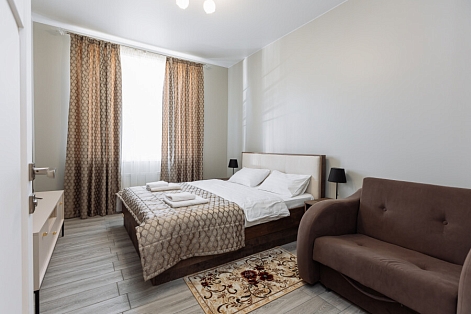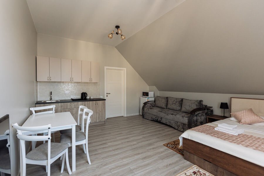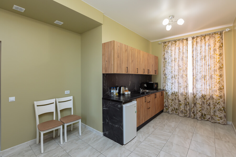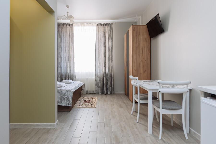В номере: вешалка, диван, зеркало, кровать двуспальная, прикроватные тумбочки, стол, стулья, шкаф, вентилятор, микроволновая печь, мини-холодильник, набор посуды, плита электрическая, телевизор ЖК, телефон, электрочайник