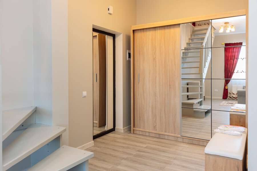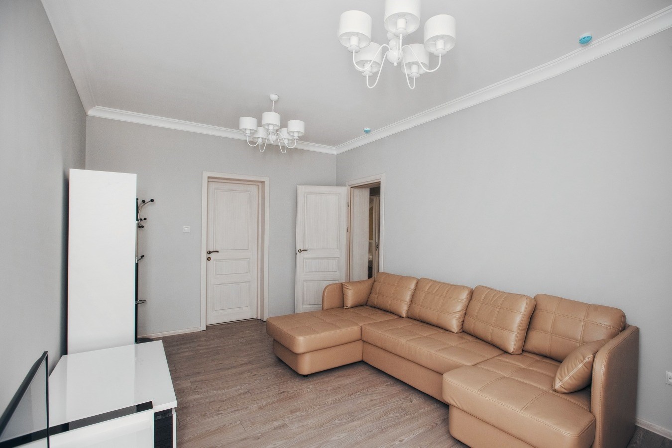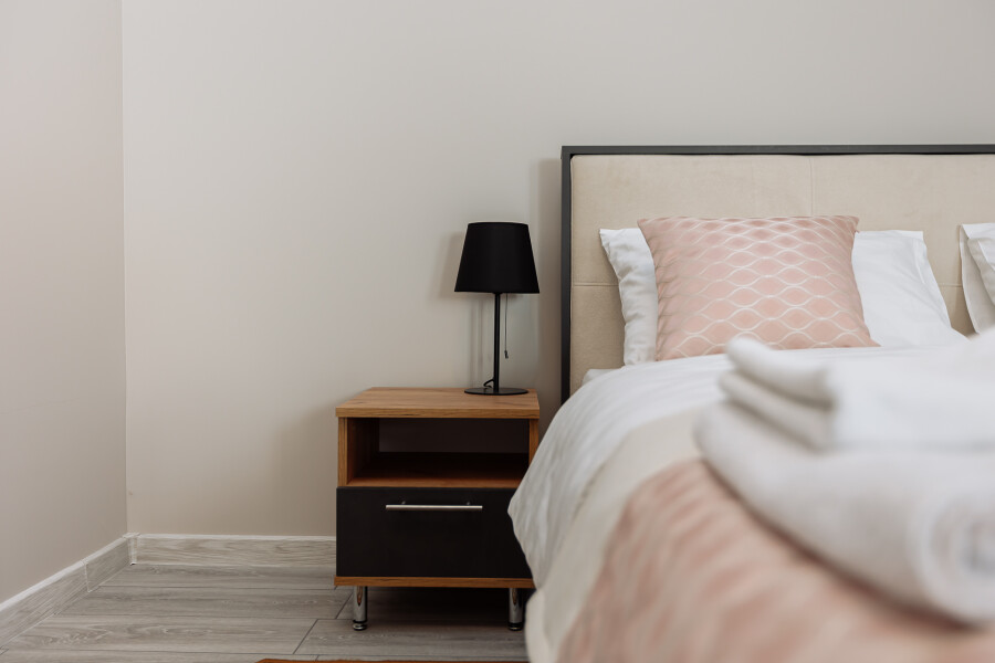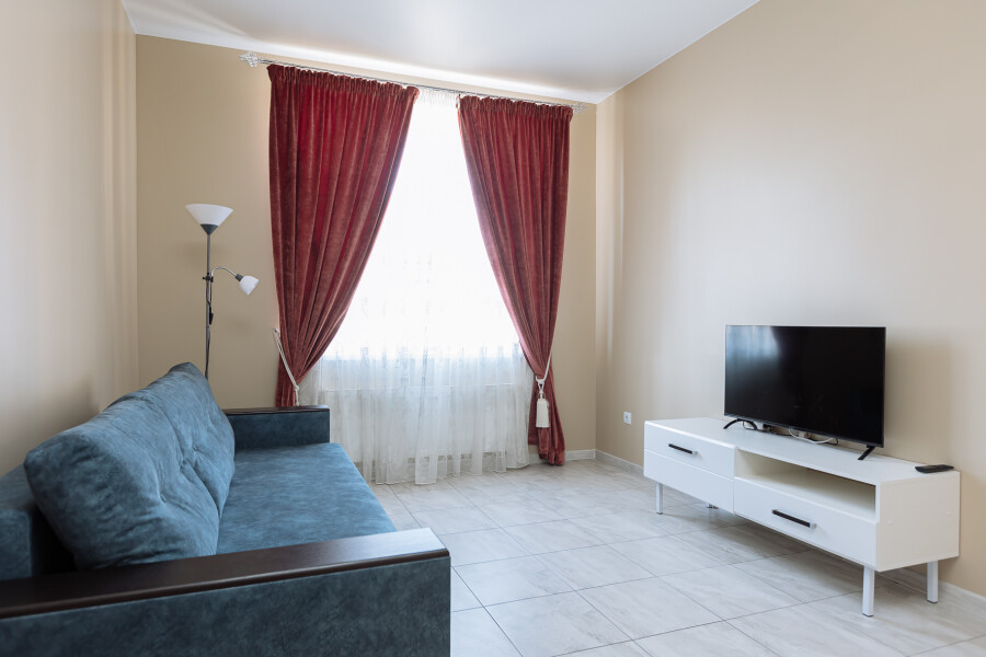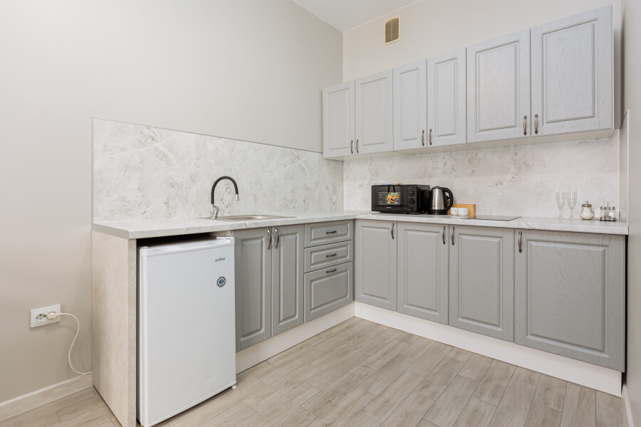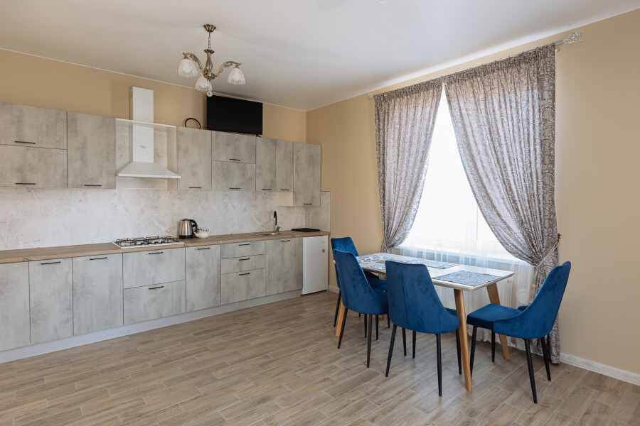 В номере: вешалка, диван, зеркало, кровать двуспальная, прикроватные тумбочки, стол, стулья, шкаф, вентилятор, микроволновая печь, мини-холодильник, набор посуды, плита электрическая, телевизор ЖК, телефон, электрочайник