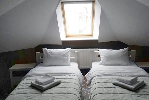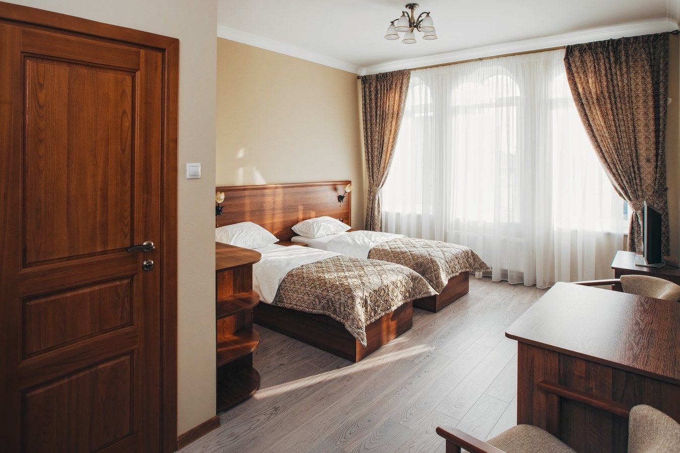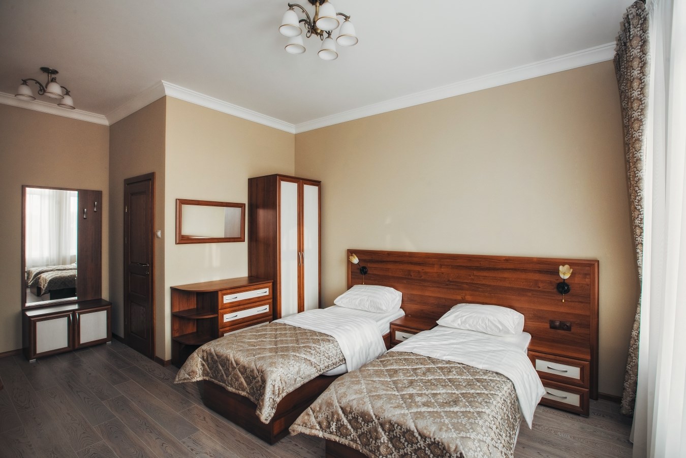 В номере: вешалка, зеркало, комод, кровати односпальные, прикроватные тумбочки, стол, столик журнальный, стулья, тумба под телевизор, шкаф, мини-холодильник, телевизор ЖК