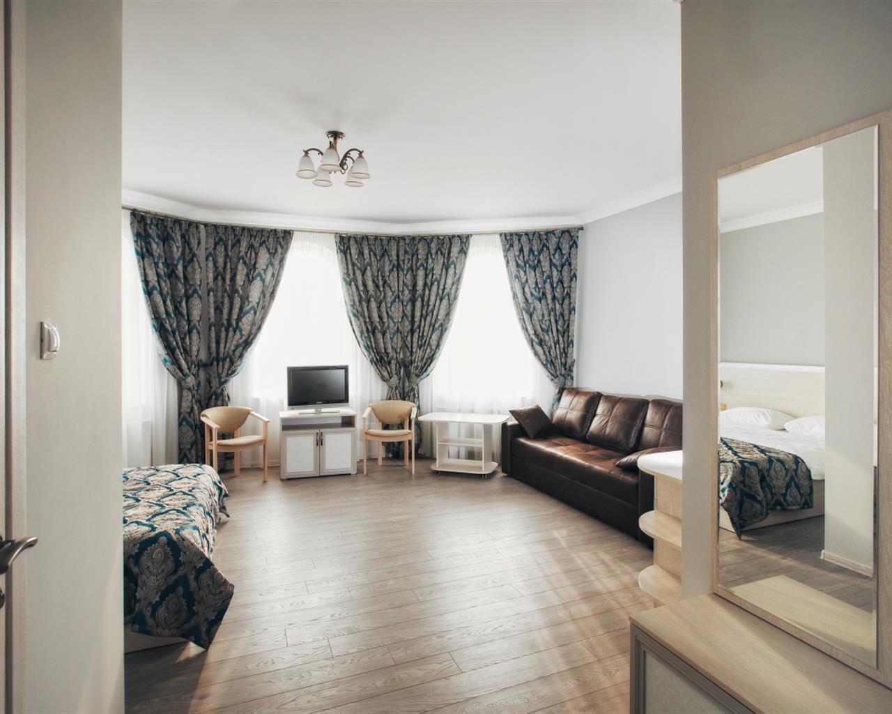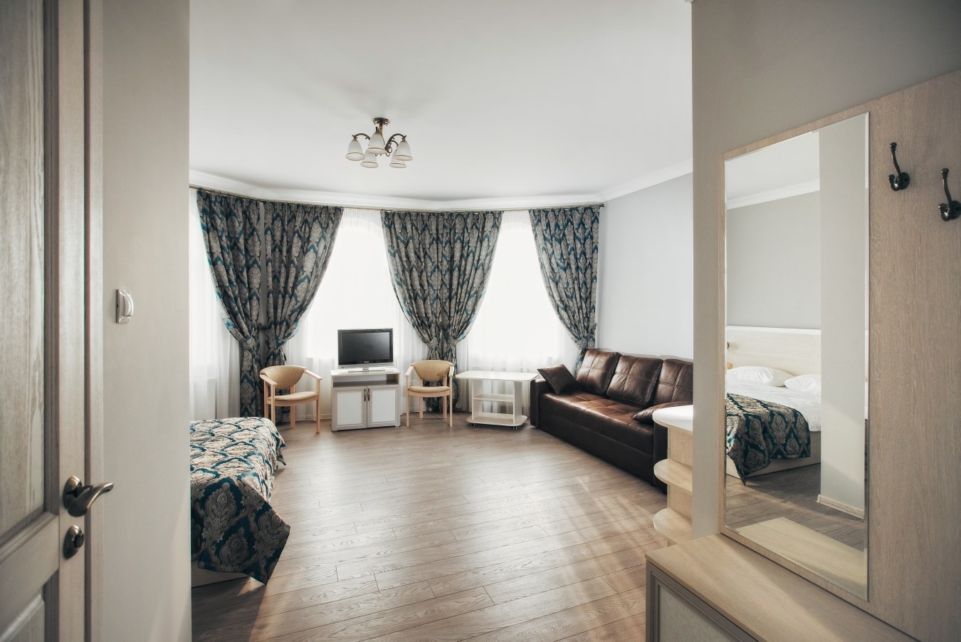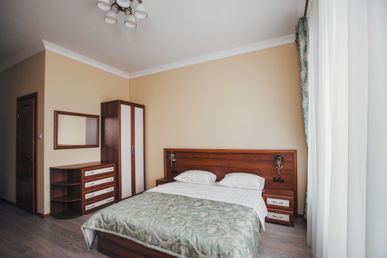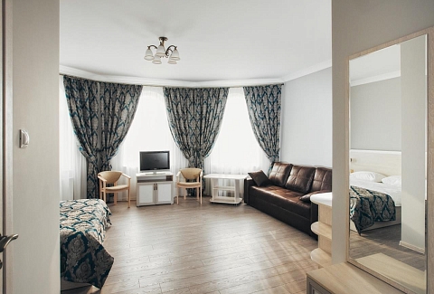 В номере: вешалка, диван раскладной, зеркало, комод, кровать двуспальная, прикроватные тумбочки, стол, столик журнальный, столик туалетный, стулья, тумба под телевизор, шкаф, вентилятор, мини-холодильник, телевизор ЖК, холодильник