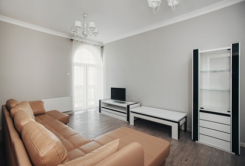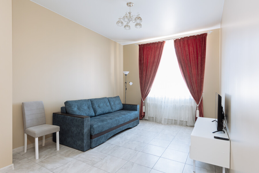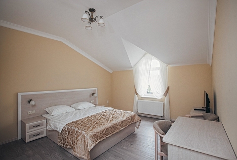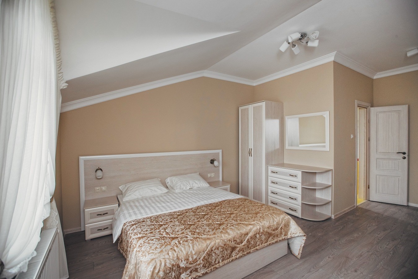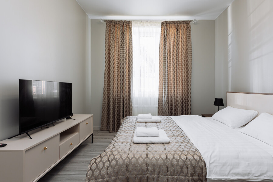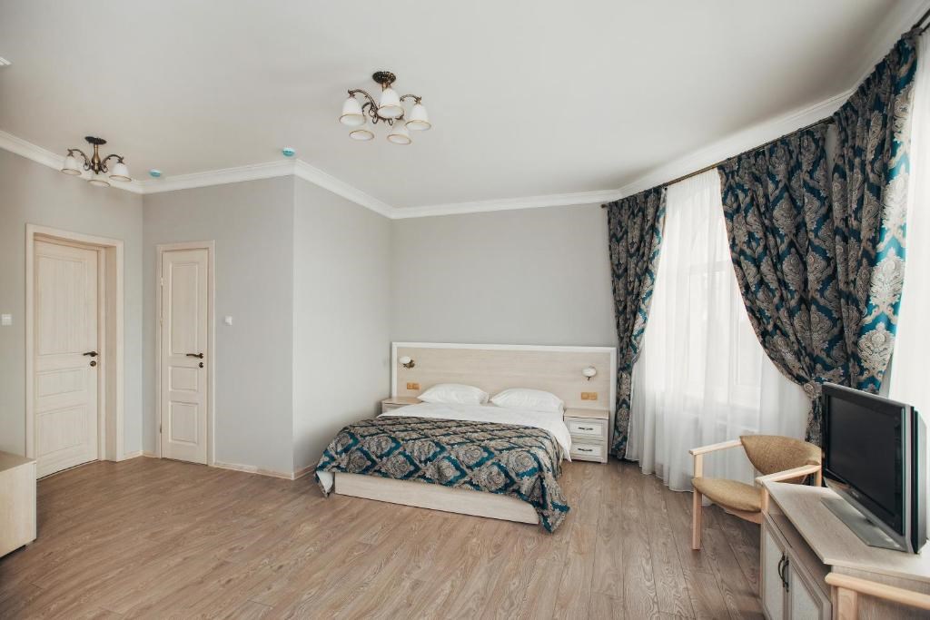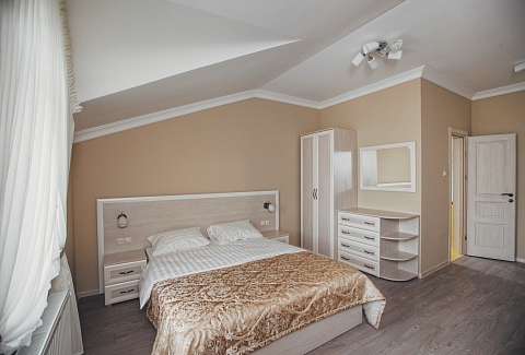 В номере: вешалка, диван раскладной, зеркало, комод, кровать двуспальная, прикроватные тумбочки, стол, столик журнальный, столик туалетный, стулья, тумба под телевизор, шкаф, вентилятор, мини-холодильник, телевизор ЖК, холодильник