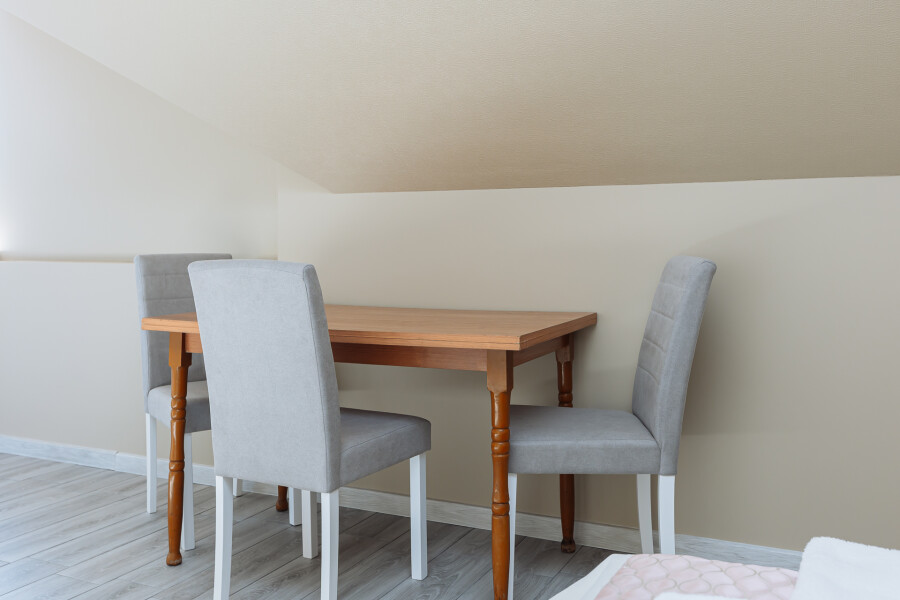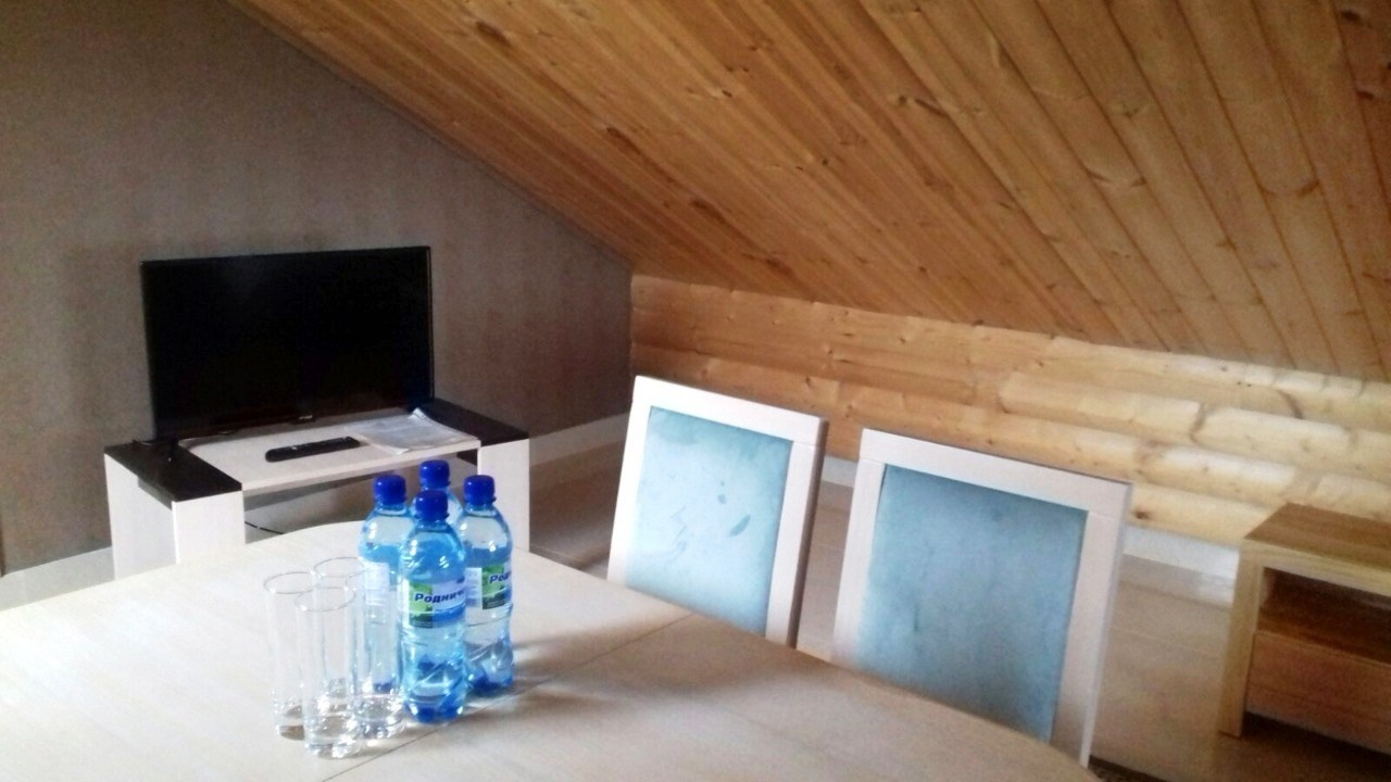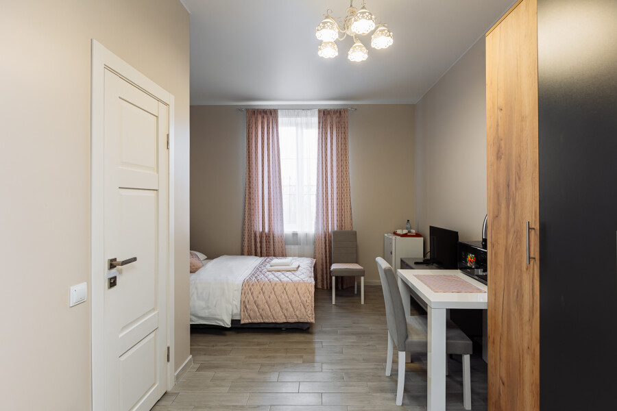 В номере: вешалка, зеркало, кровать двуспальная, прикроватные тумбочки, стол, стулья, шкаф, вентилятор, мини-холодильник, плита электрическая, телевизор ЖК, телефон, утюг, электрочайник