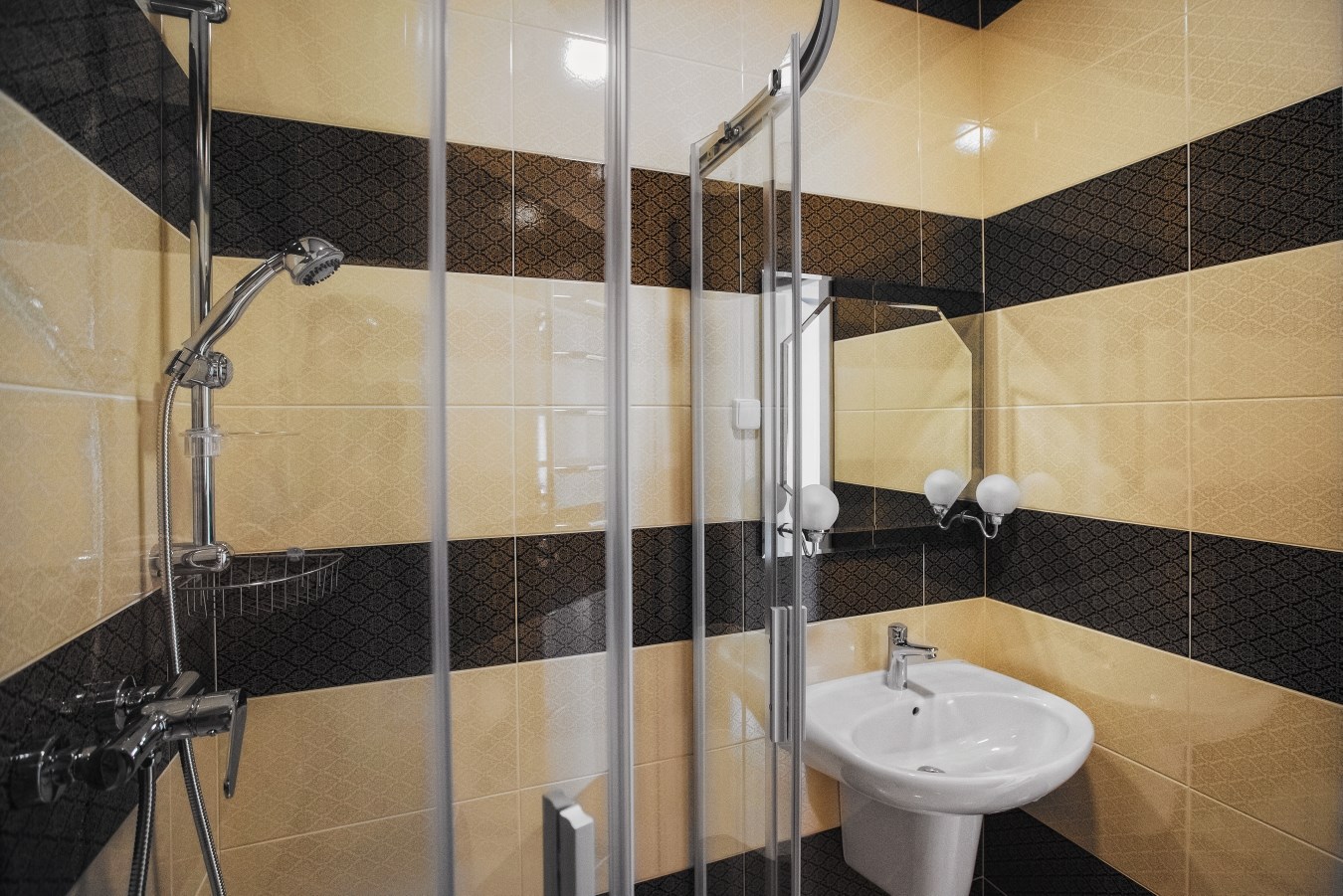 Санузел: с душевой кабиной, тапочки, туалетные принадлежности, фен, халат