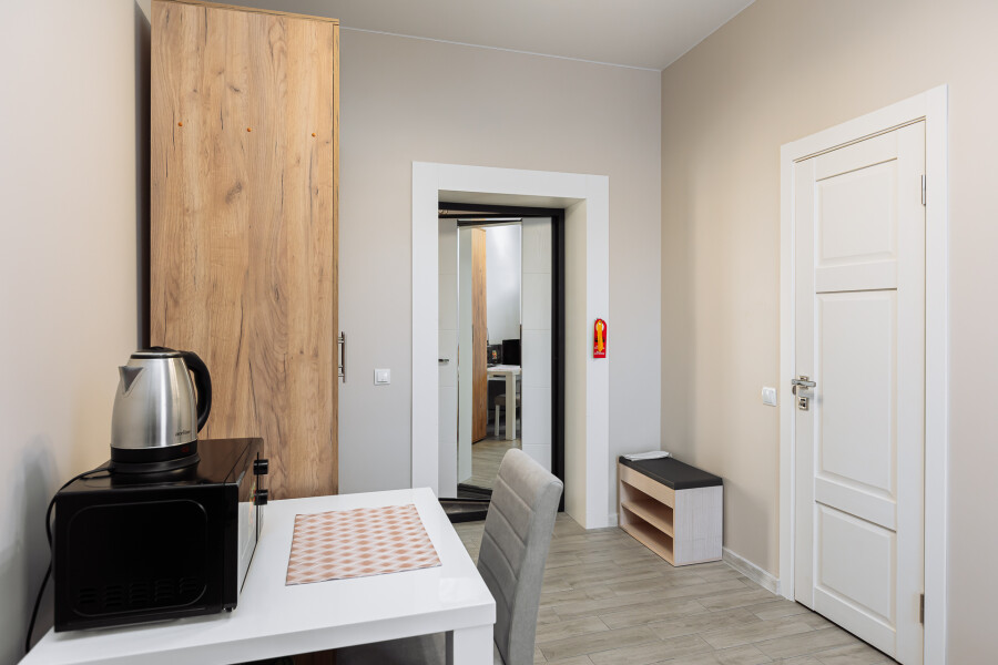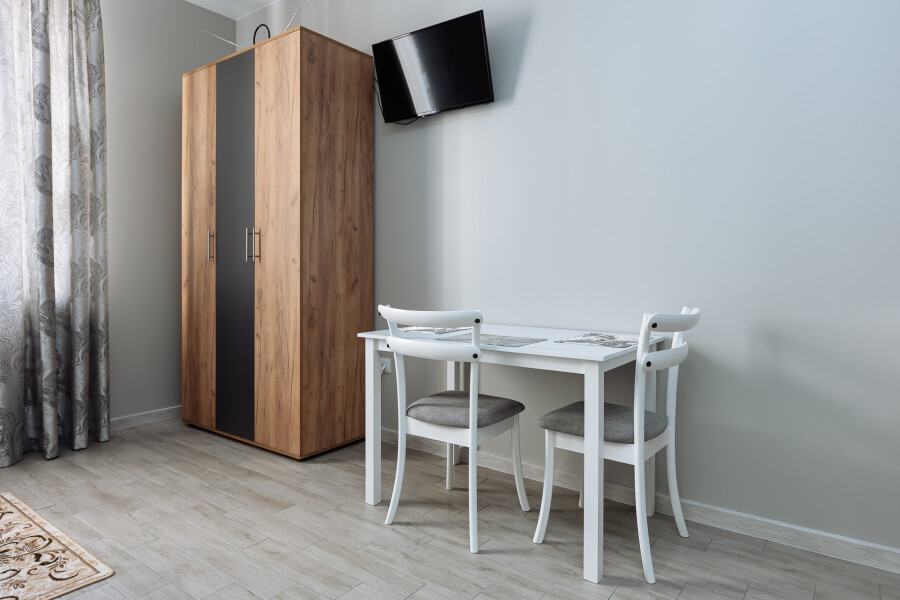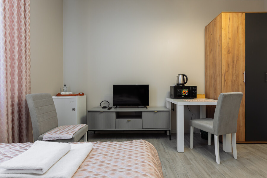 В номере: вешалка, зеркало, кровать односпальная, прикроватная тумбочка, стол, стулья, шкаф, вентилятор, микроволновая печь, набор посуды, телевизор ЖК, телефон, электрочайник