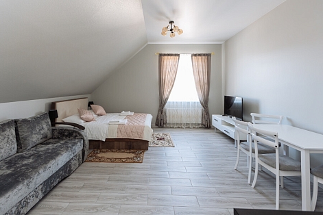В номере: вешалка, диван раскладной, зеркало, комод, кровать двуспальная, прикроватные тумбочки, стол, столик журнальный, стулья, вентилятор, мини-холодильник, телевизор ЖК, телефон, утюг