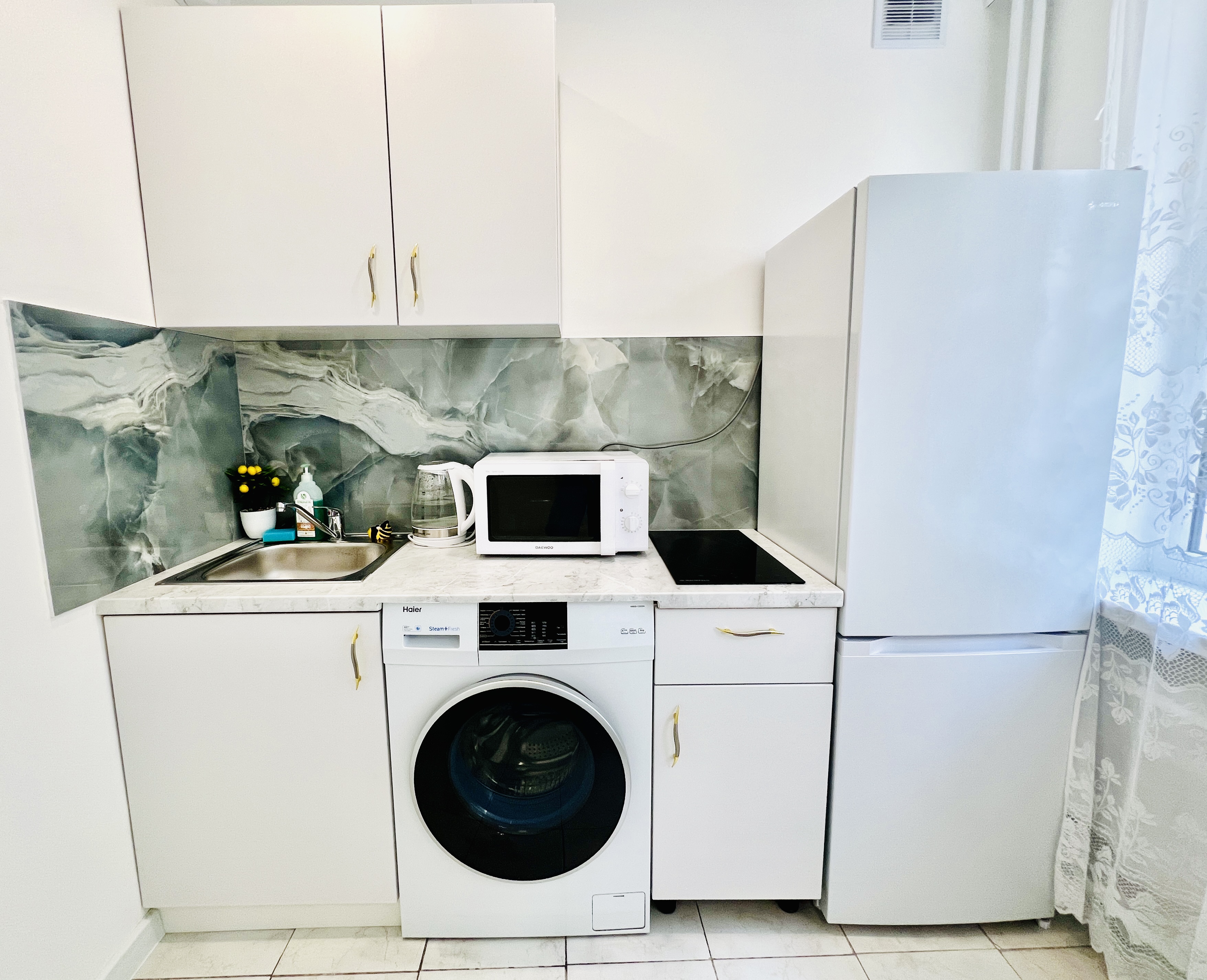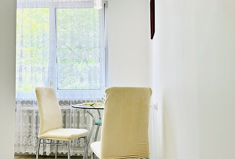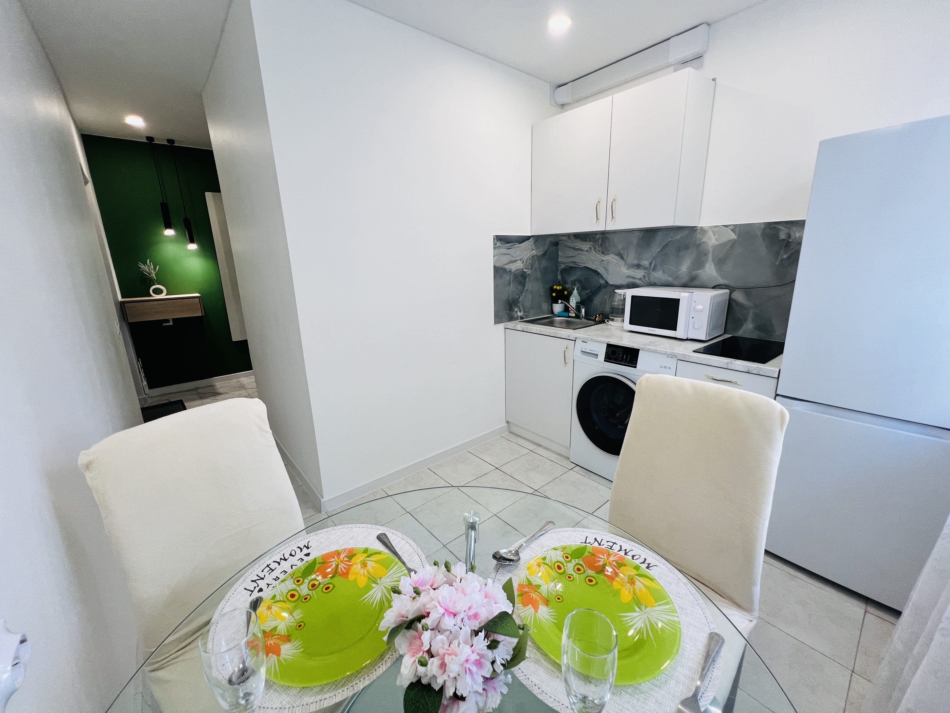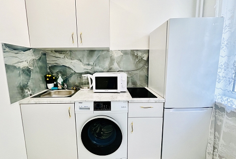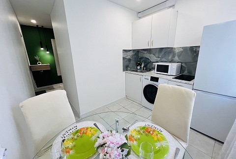 В номере: вешалка, зеркало, кровать двуспальная, стол, стулья, шкаф, гладильная доска, микроволновая печь, мини-холодильник, набор посуды, плита электрическая, стиральная машина, сушилка для белья, телевизор ЖК, утюг, холодильник, чайный набор посуды, электрочайник