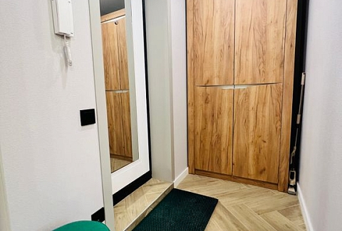 В номере: вешалка, диван, зеркало, кровать двуспальная, прикроватные тумбочки, стол, стулья, шкаф, гладильная доска, духовой шкаф, кондиционер, микроволновая печь, мини-холодильник, набор посуды, плита электрическая, стиральная машина, сушилка для белья, телевизор ЖК, утюг, чайный набор посуды, электрочайник