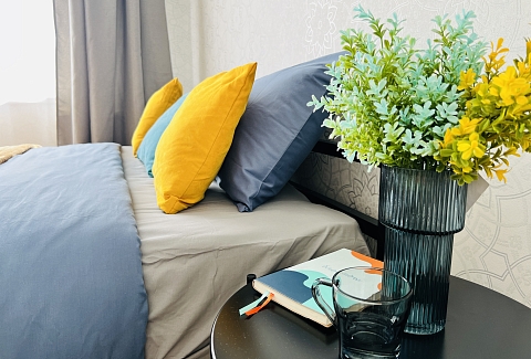 В номере: вешалка, зеркало, кровать двуспальная, прикроватные тумбочки, стол, стулья, шкаф, гладильная доска, кондиционер, микроволновая печь, набор посуды, плита электрическая, стиральная машина, сушилка для белья, телевизор ЖК, утюг, холодильник, чайный набор посуды, электрочайник