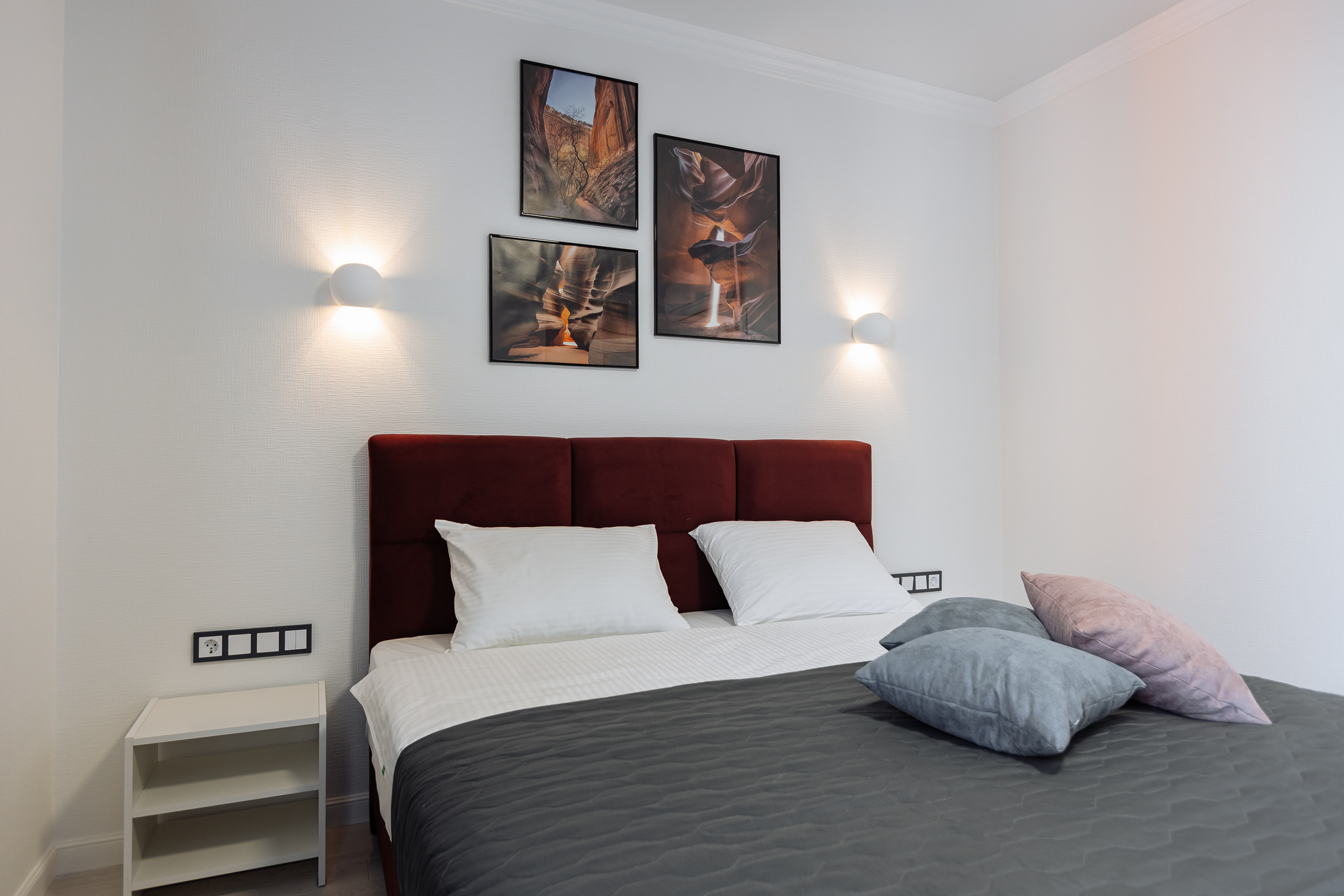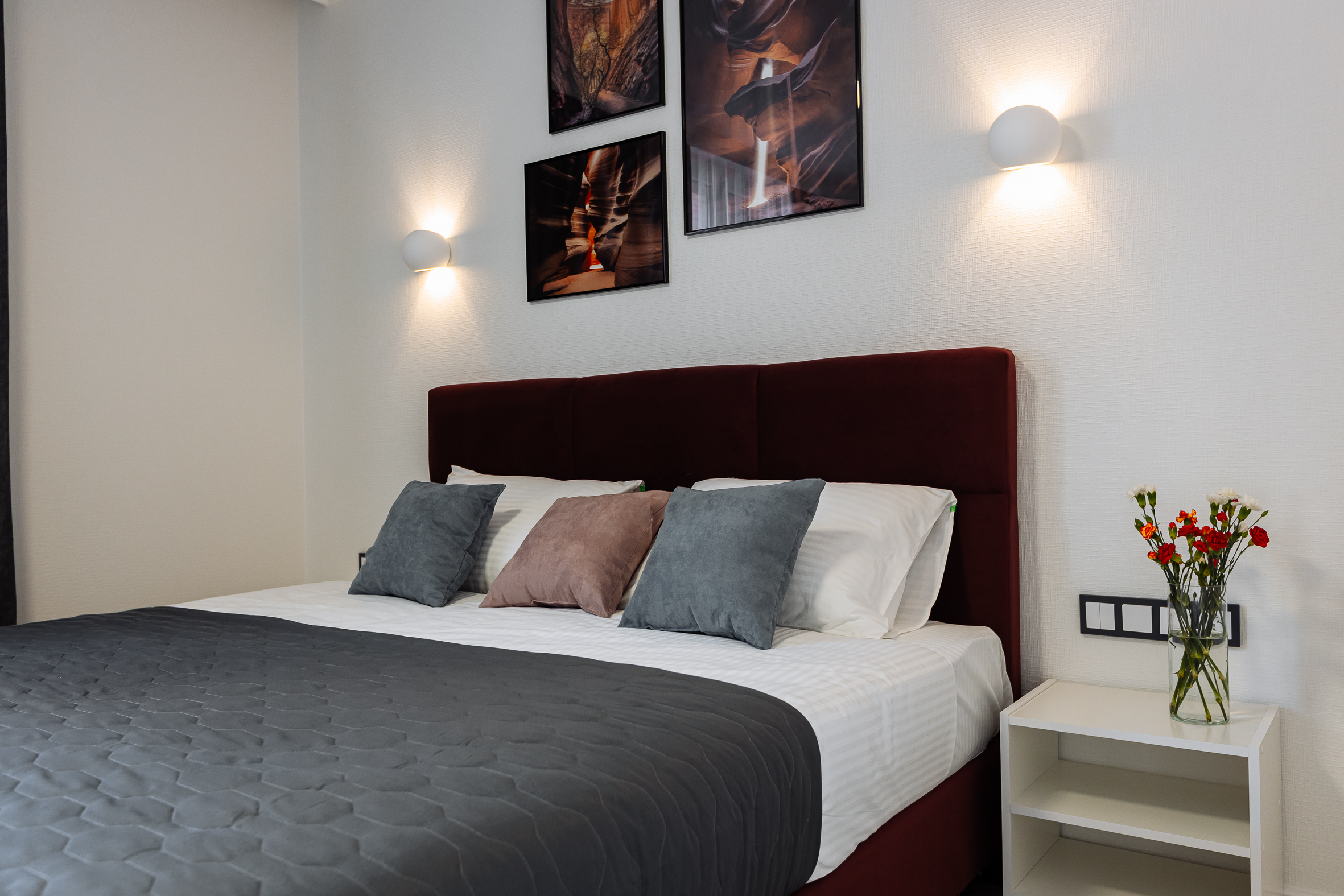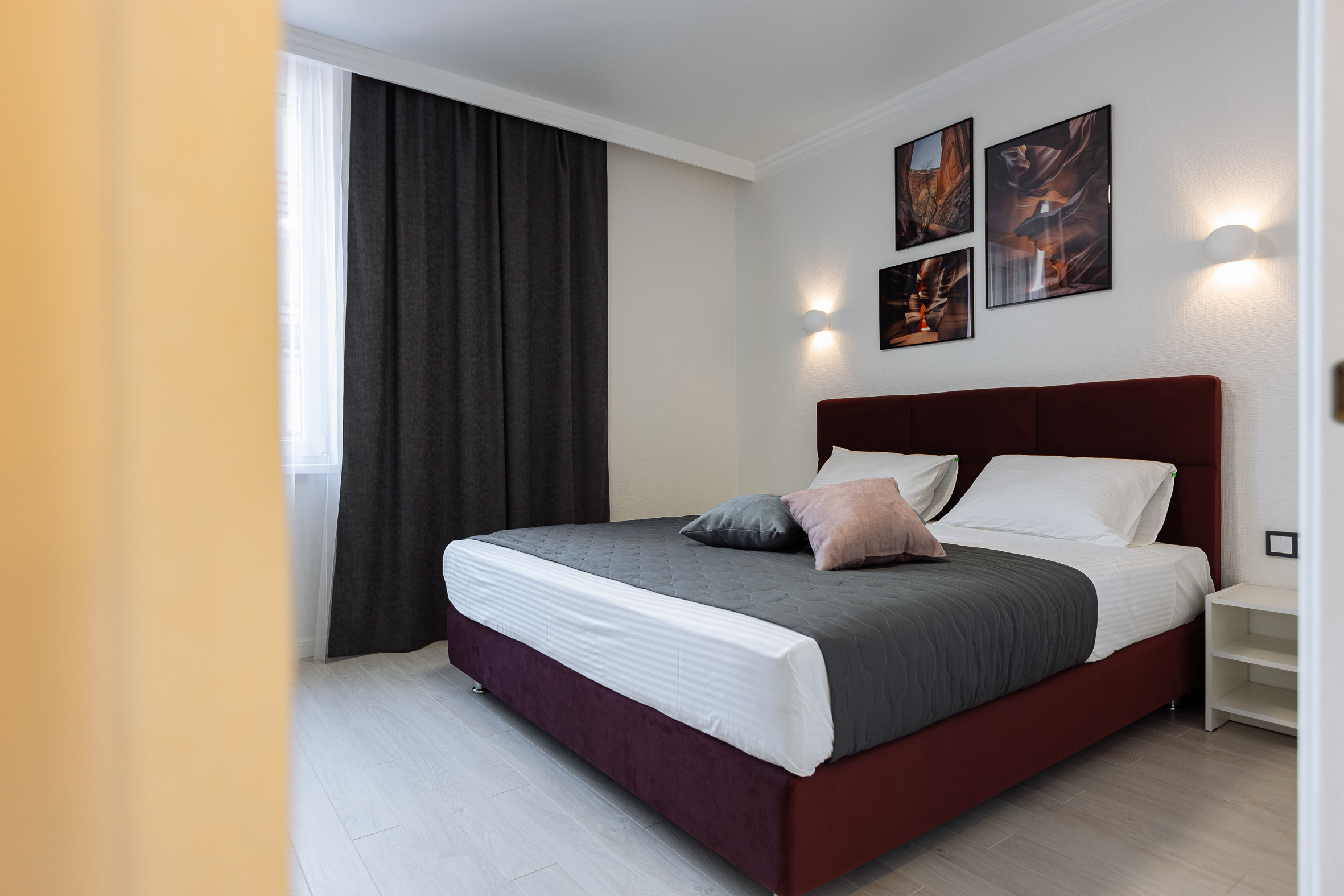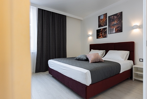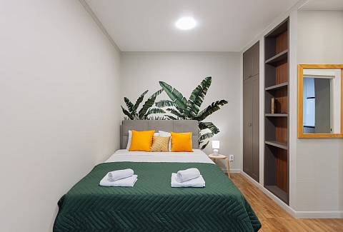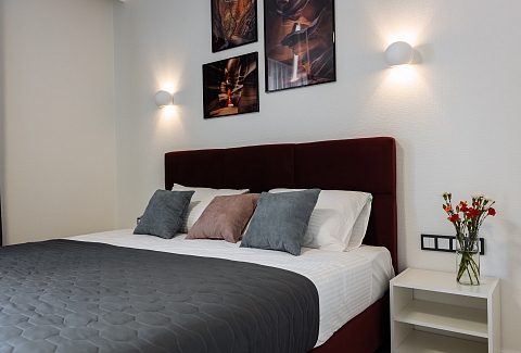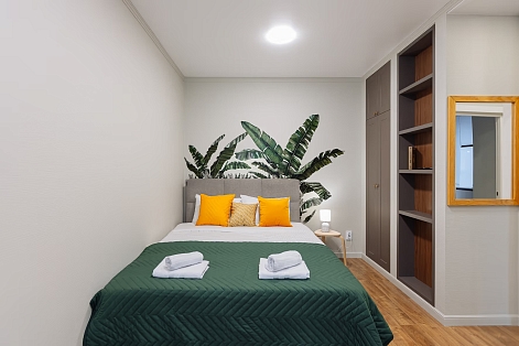 В номере: диван, зеркало, кровать двуспальная, прикроватные тумбочки, стол, стулья, шкаф, гладильная доска, кондиционер, микроволновая печь, набор посуды, плита газовая, стиральная машина, сушилка для белья, телевизор ЖК, утюг, холодильник, чайный набор посуды, электрочайник