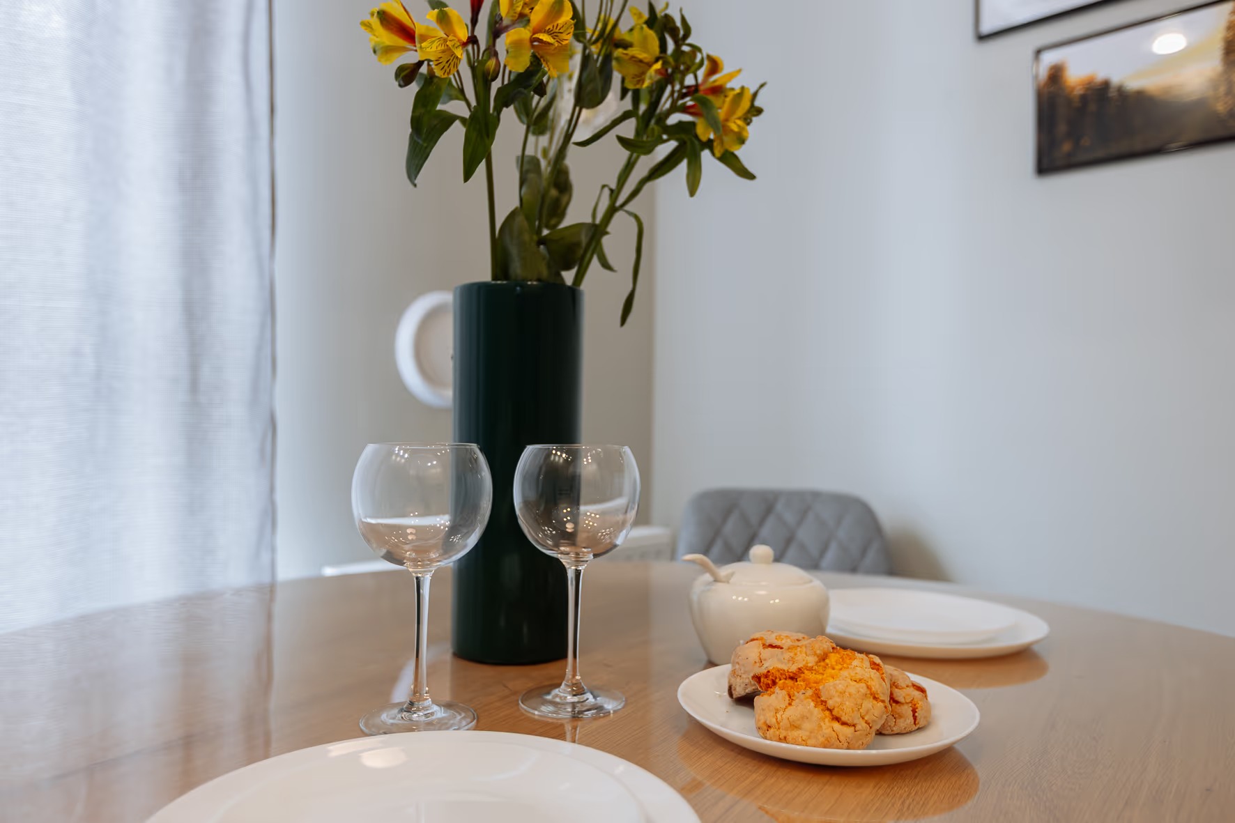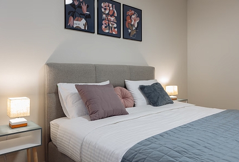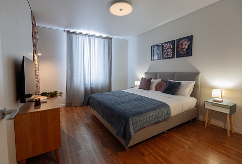 В номере: зеркало, кровать двуспальная, прикроватные тумбочки, стол, стулья, шкаф, гладильная доска, кондиционер, микроволновая печь, набор посуды, плита газовая, стиральная машина, сушилка для белья, телевизор ЖК, утюг, холодильник, чайный набор посуды, электрочайник