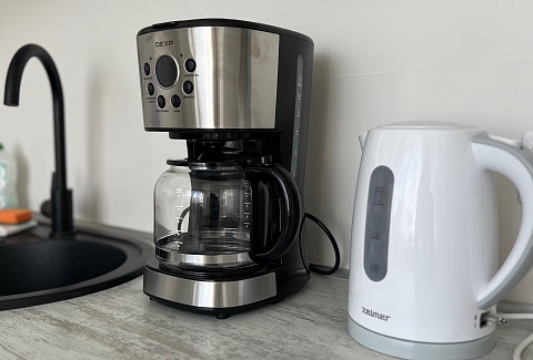 В номере: диван, зеркало, кровать двуспальная, прикроватные тумбочки, стол, стулья, шкаф, гладильная доска, кондиционер, микроволновая печь, набор посуды, плита газовая, стиральная машина, сушилка для белья, телевизор ЖК, утюг, холодильник, чайный набор посуды, электрочайник