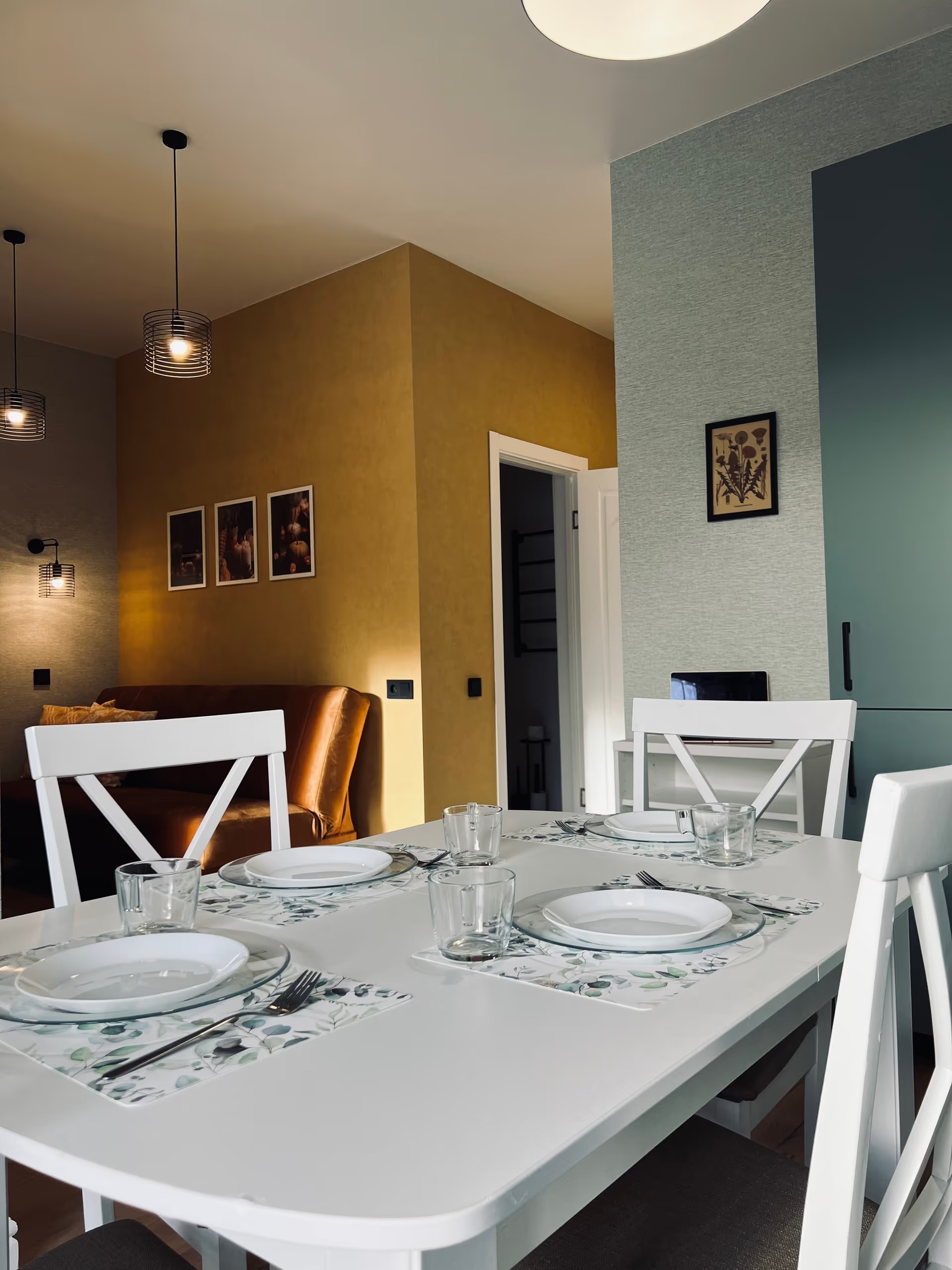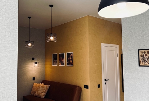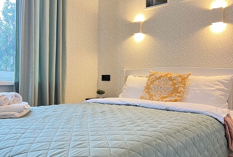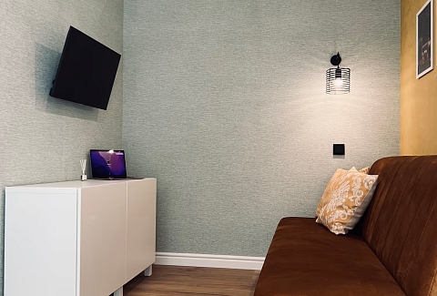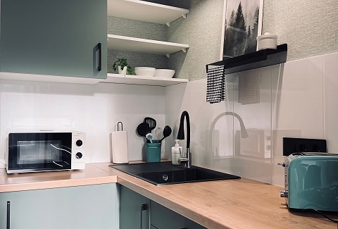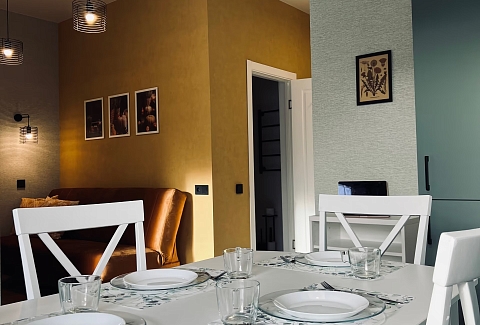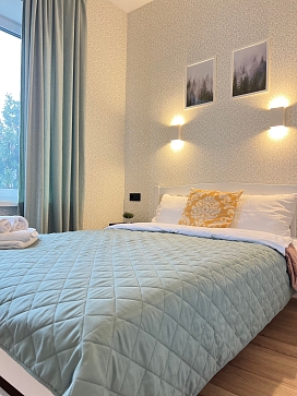 В номере: вешалка, диван, зеркало, кровать двуспальная, прикроватные тумбочки, стол, стулья, шкаф, гладильная доска, кондиционер, микроволновая печь, набор посуды, плита газовая, стиральная машина, сушилка для белья, телевизор ЖК, утюг, холодильник, чайный набор посуды, электрочайник