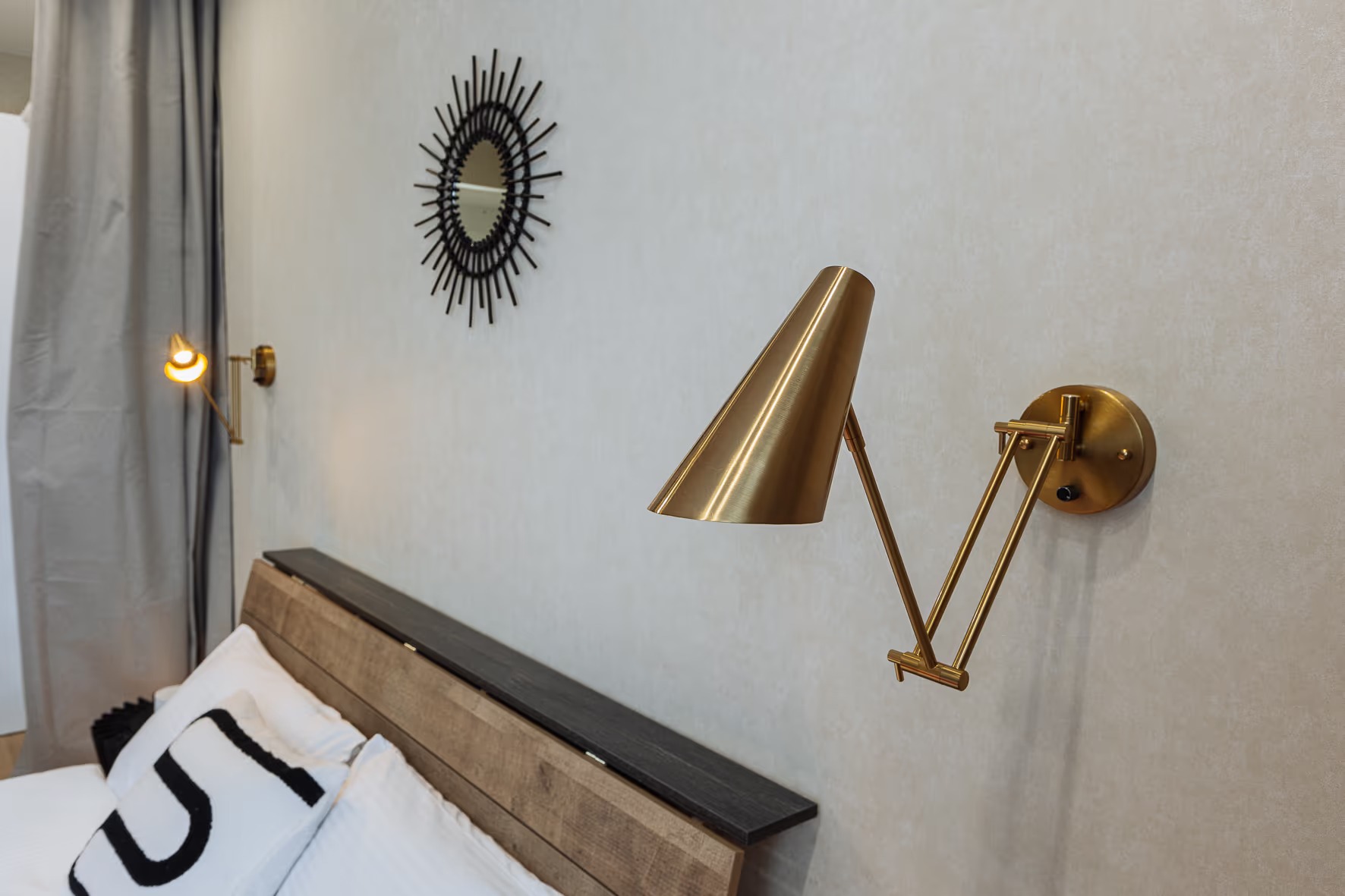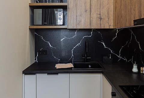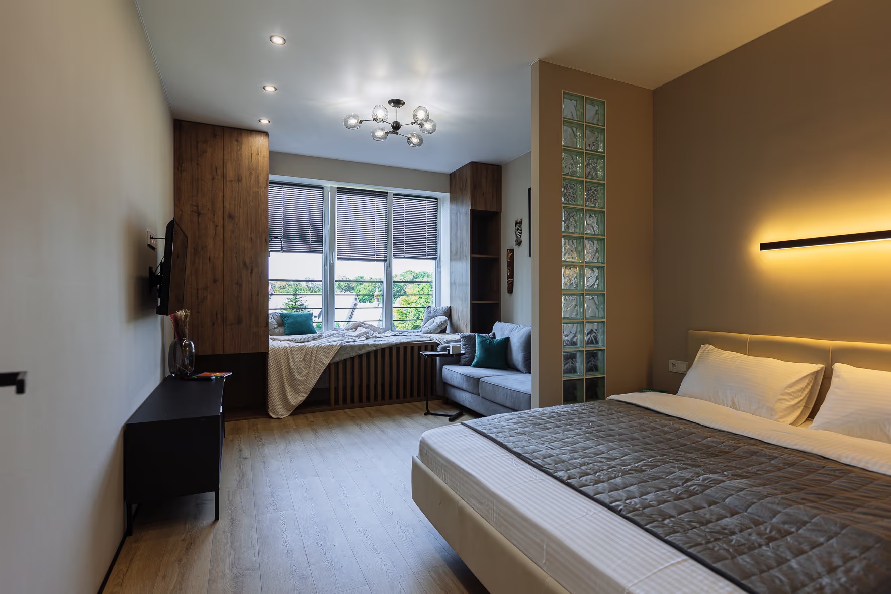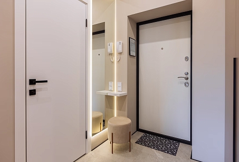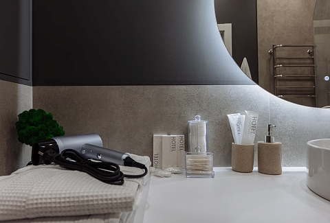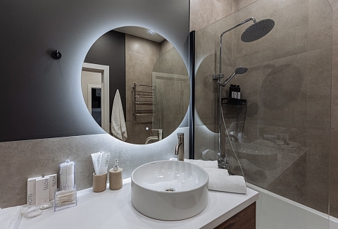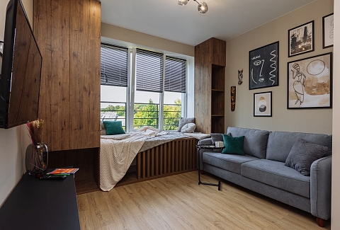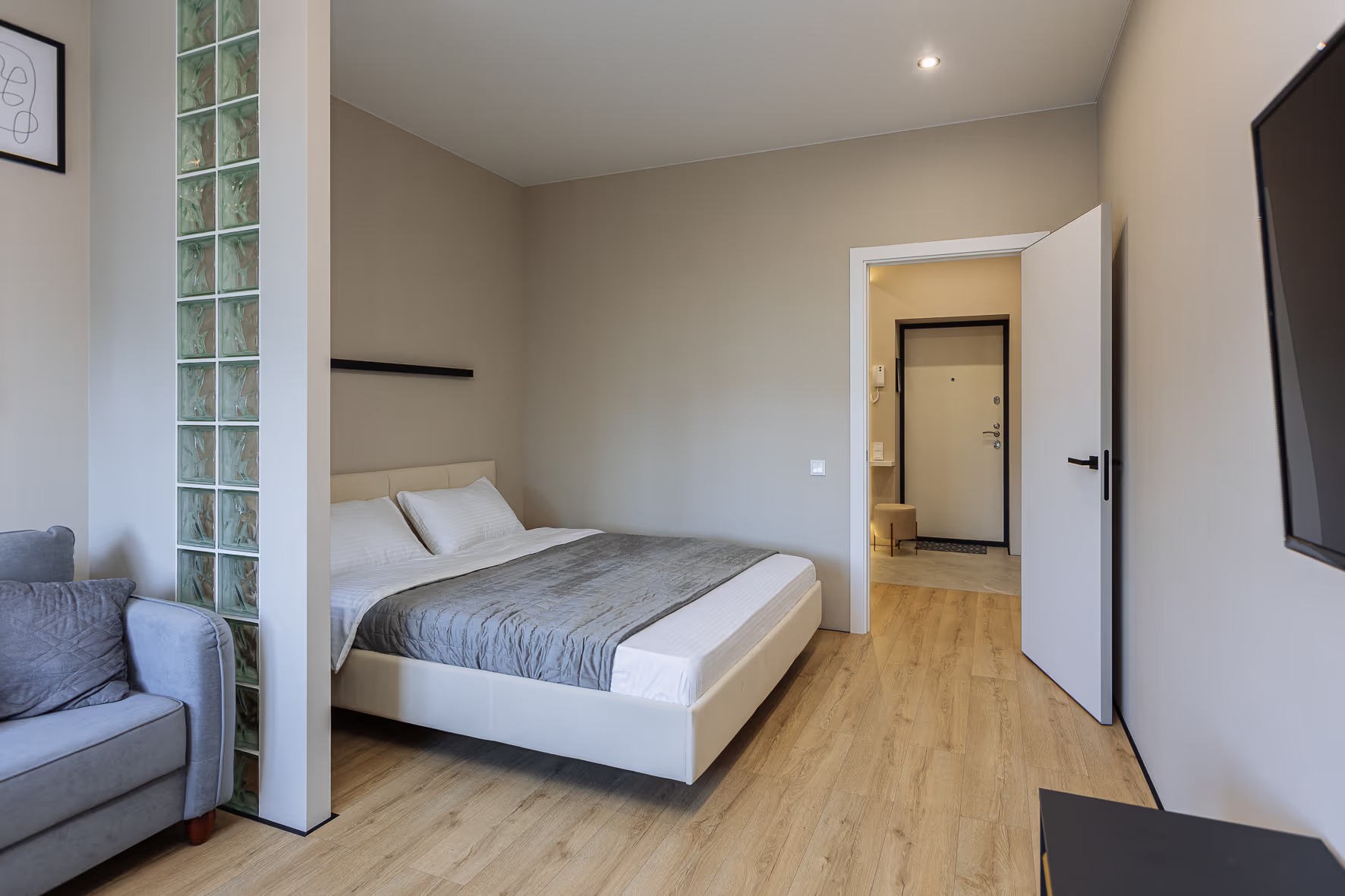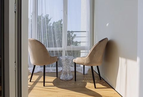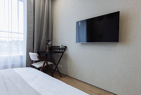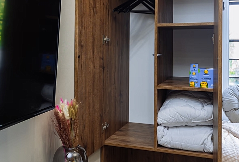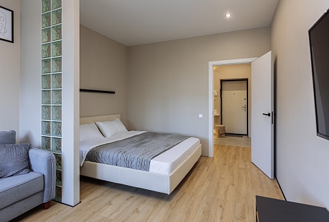В номере: вешалка, диван, зеркало, кровать двуспальная, прикроватные тумбочки, стол, стулья, шкаф, гладильная доска, кондиционер, микроволновая печь, мини-холодильник, набор посуды, плита газовая, плита электрическая, стиральная машина, сушилка для белья, телевизор ЖК, утюг, чайный набор посуды, электрочайник