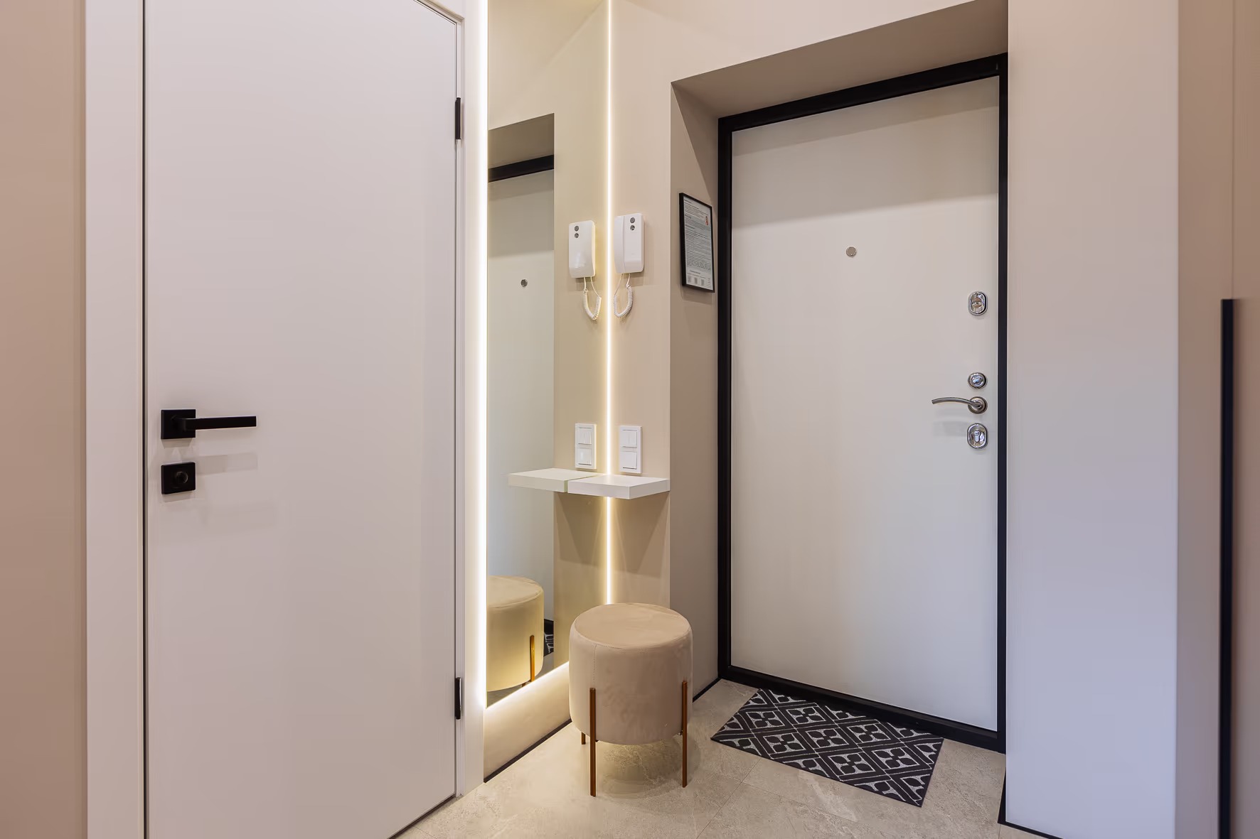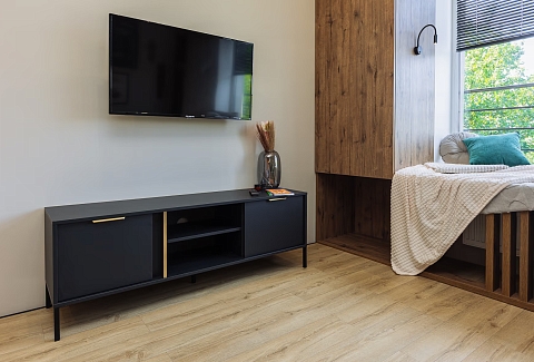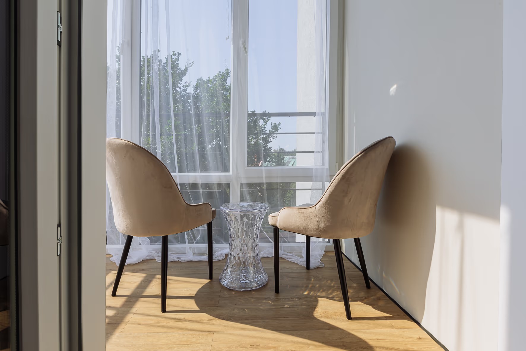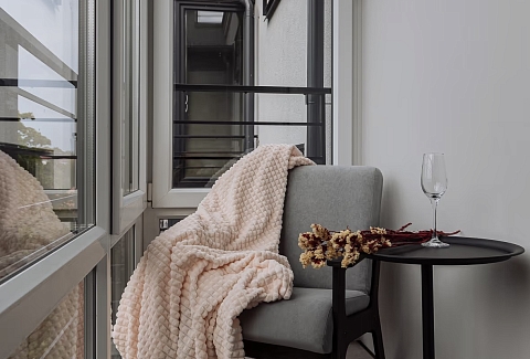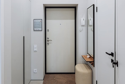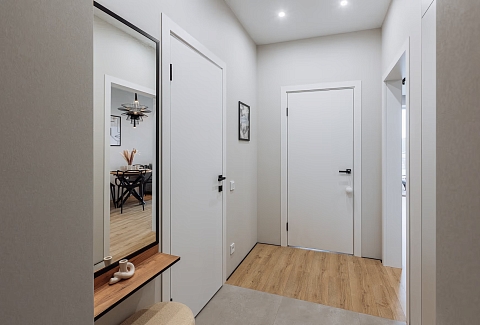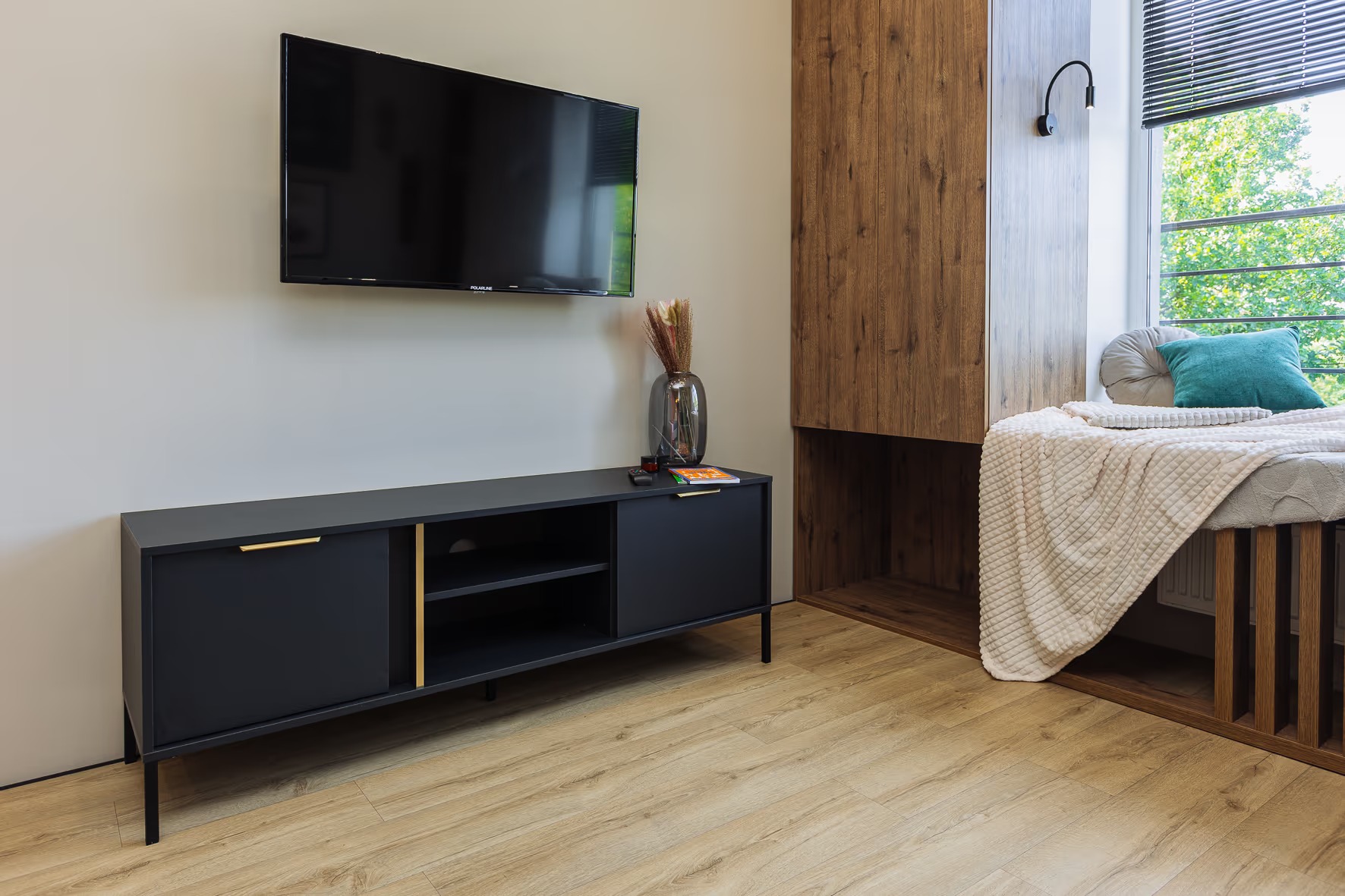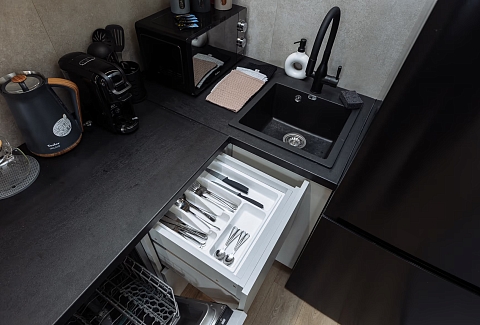 В номере: вешалка, диван, зеркало, кровать двуспальная, прикроватные тумбочки, стол, стулья, шкаф, гладильная доска, кондиционер, микроволновая печь, мини-холодильник, набор посуды, плита газовая, плита электрическая, стиральная машина, сушилка для белья, телевизор ЖК, утюг, чайный набор посуды, электрочайник