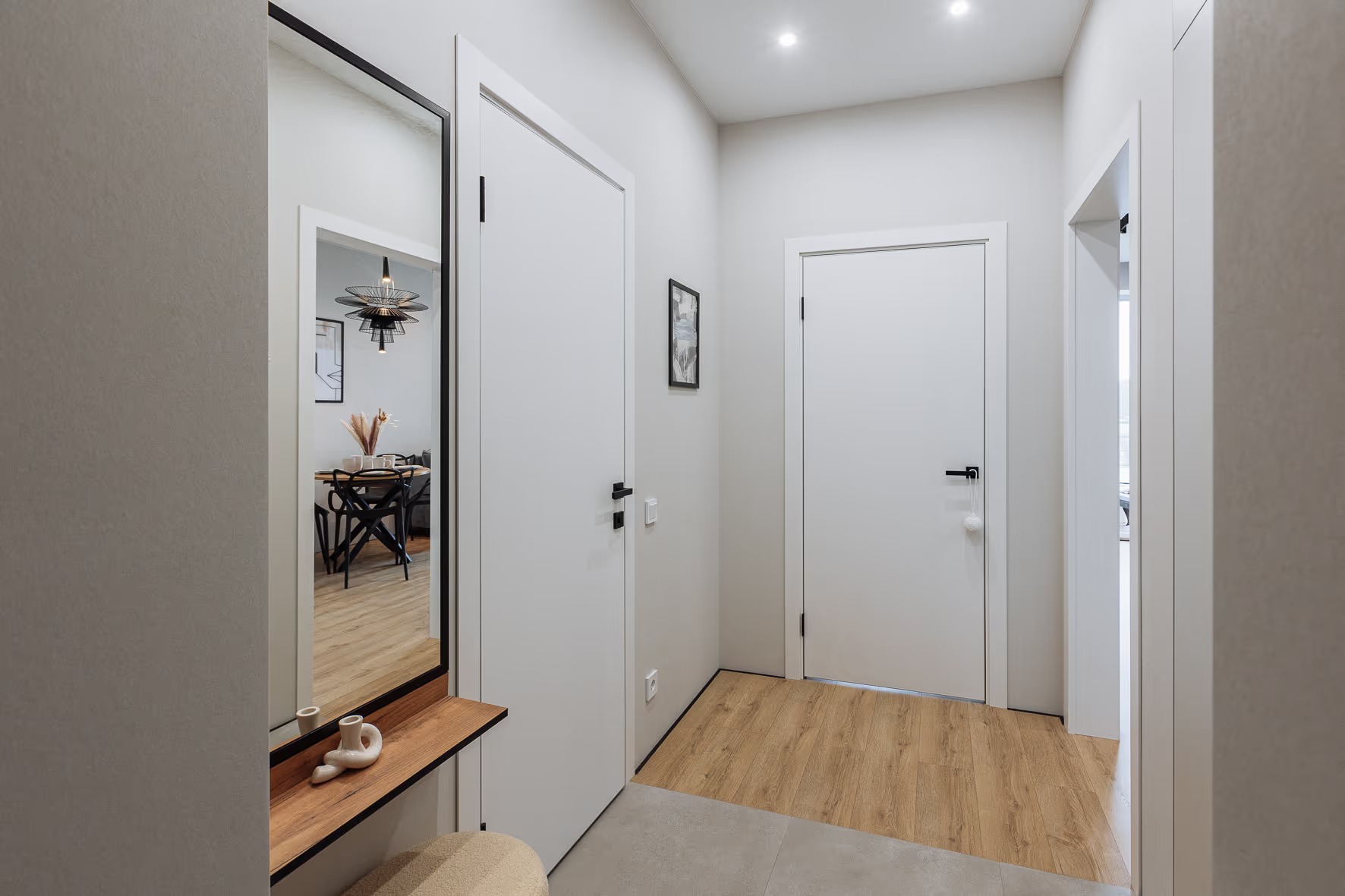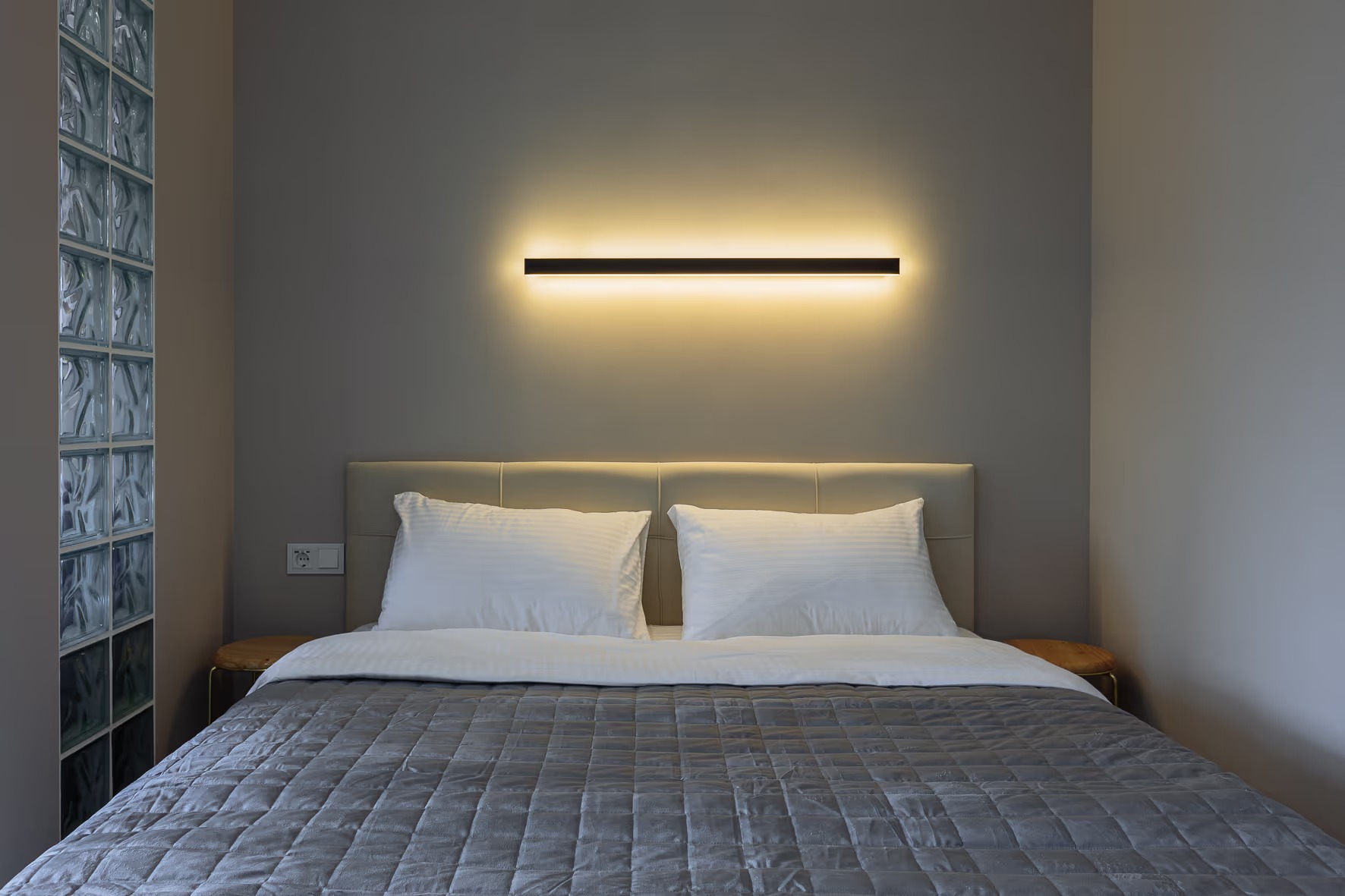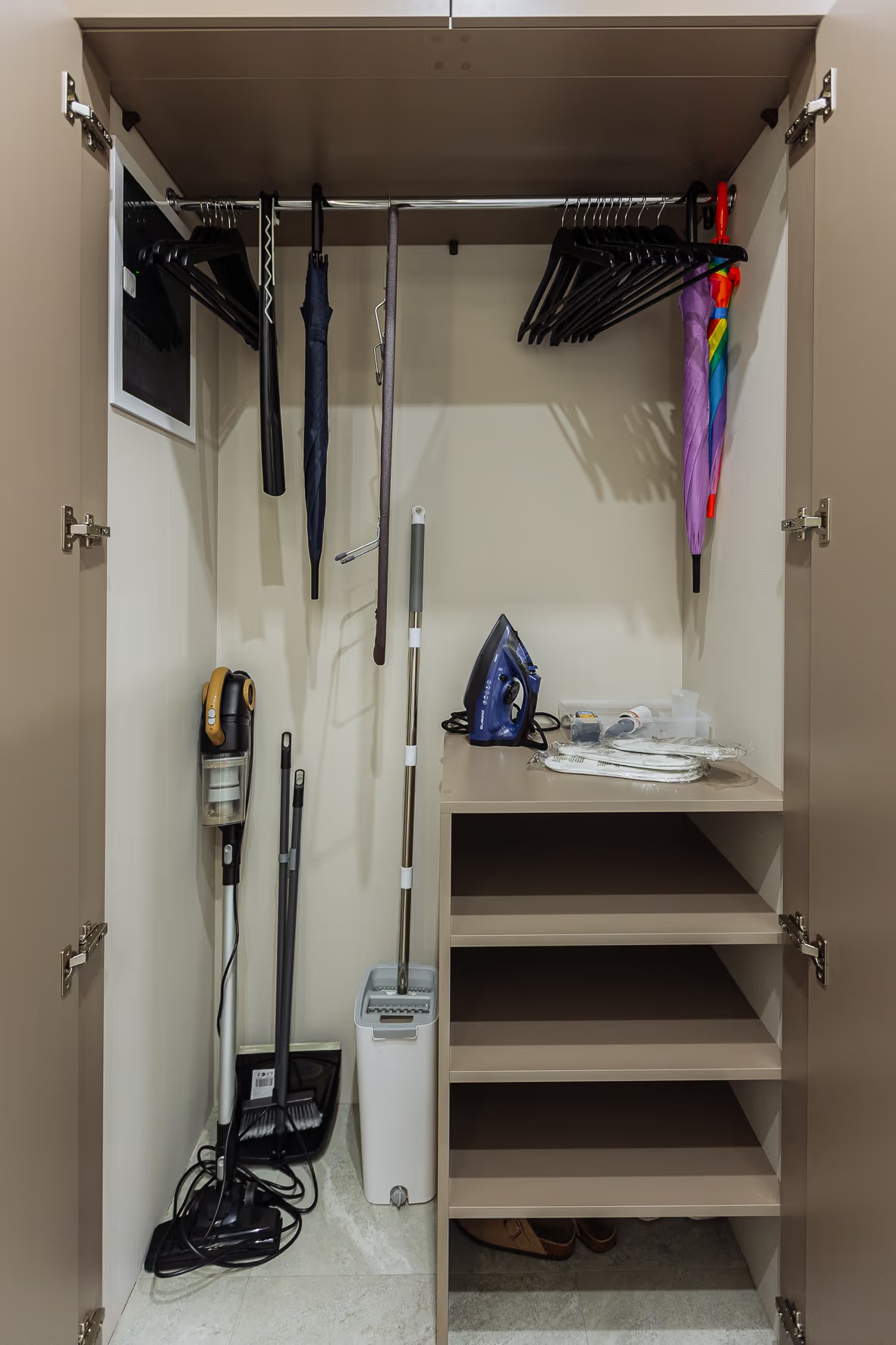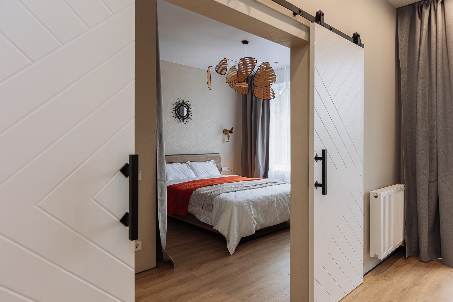 В номере: вешалка, диван, зеркало, кровать двуспальная, прикроватные тумбочки, стол, стулья, шкаф, гладильная доска, кондиционер, микроволновая печь, мини-холодильник, набор посуды, плита газовая, плита электрическая, стиральная машина, сушилка для белья, телевизор ЖК, утюг, чайный набор посуды, электрочайник