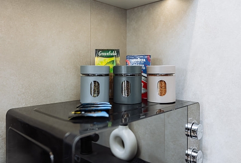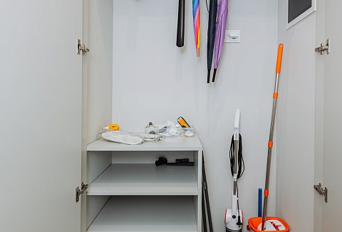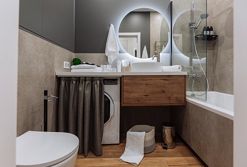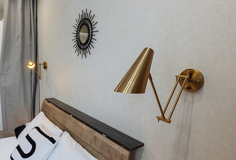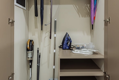 В номере: вешалка, диван, зеркало, кровать двуспальная, прикроватные тумбочки, стол, стулья, шкаф, гладильная доска, кондиционер, микроволновая печь, мини-холодильник, набор посуды, плита электрическая, стиральная машина, сушилка для белья, телевизор ЖК, утюг, холодильник, чайный набор посуды, электрочайник