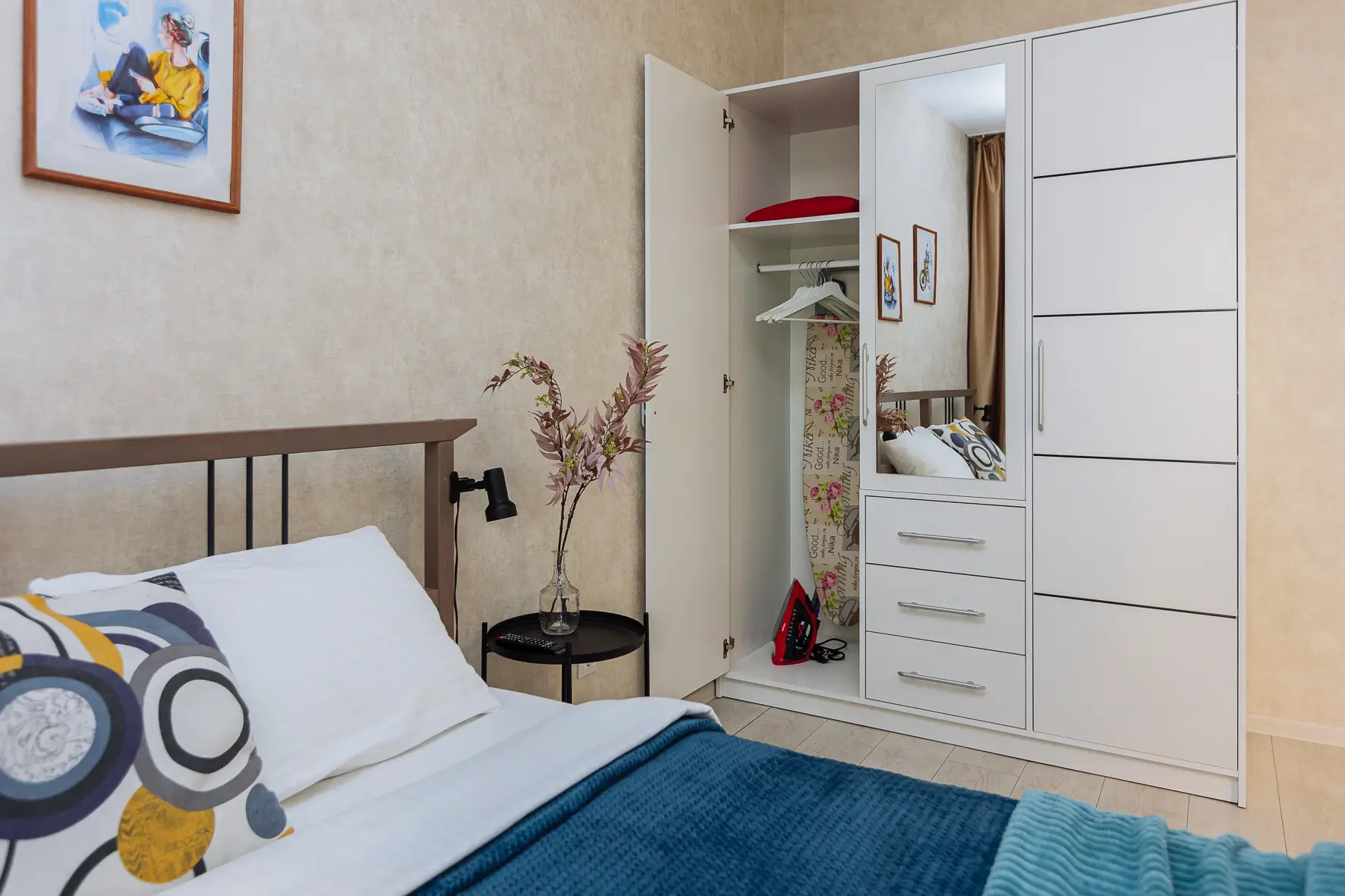 В номере: диван, зеркало, кровать двуспальная, стол, стулья, шкаф, гладильная доска, духовой шкаф, микроволновая печь, набор посуды, плита газовая, стиральная машина, сушилка для белья, телевизор ЖК, утюг, холодильник, чайный набор посуды, электрочайник