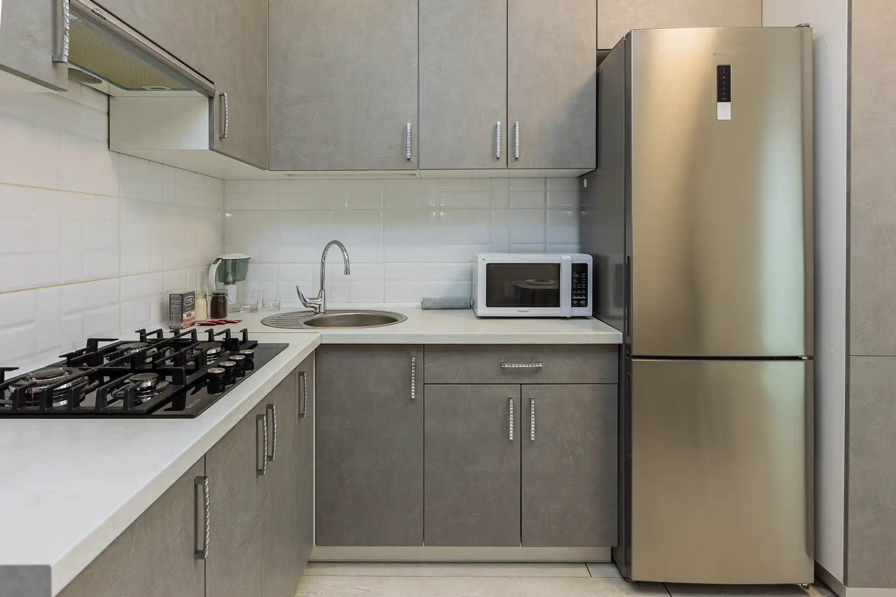 Вся необходимая бытовая техника и кондиционер, необходимый набор посуды. По два полотенца для каждого гостя, одноразовые средства личной гигиены, одноразовые тапочки, качественный ортопедический матрас.Апартаменты расположены в тихом районе с развитой инфраструктурой, рядом магазины, супермаркеты, кафе и рестораны.Общественная парковка рядом с домом сделают пребывание еще более комфортным.