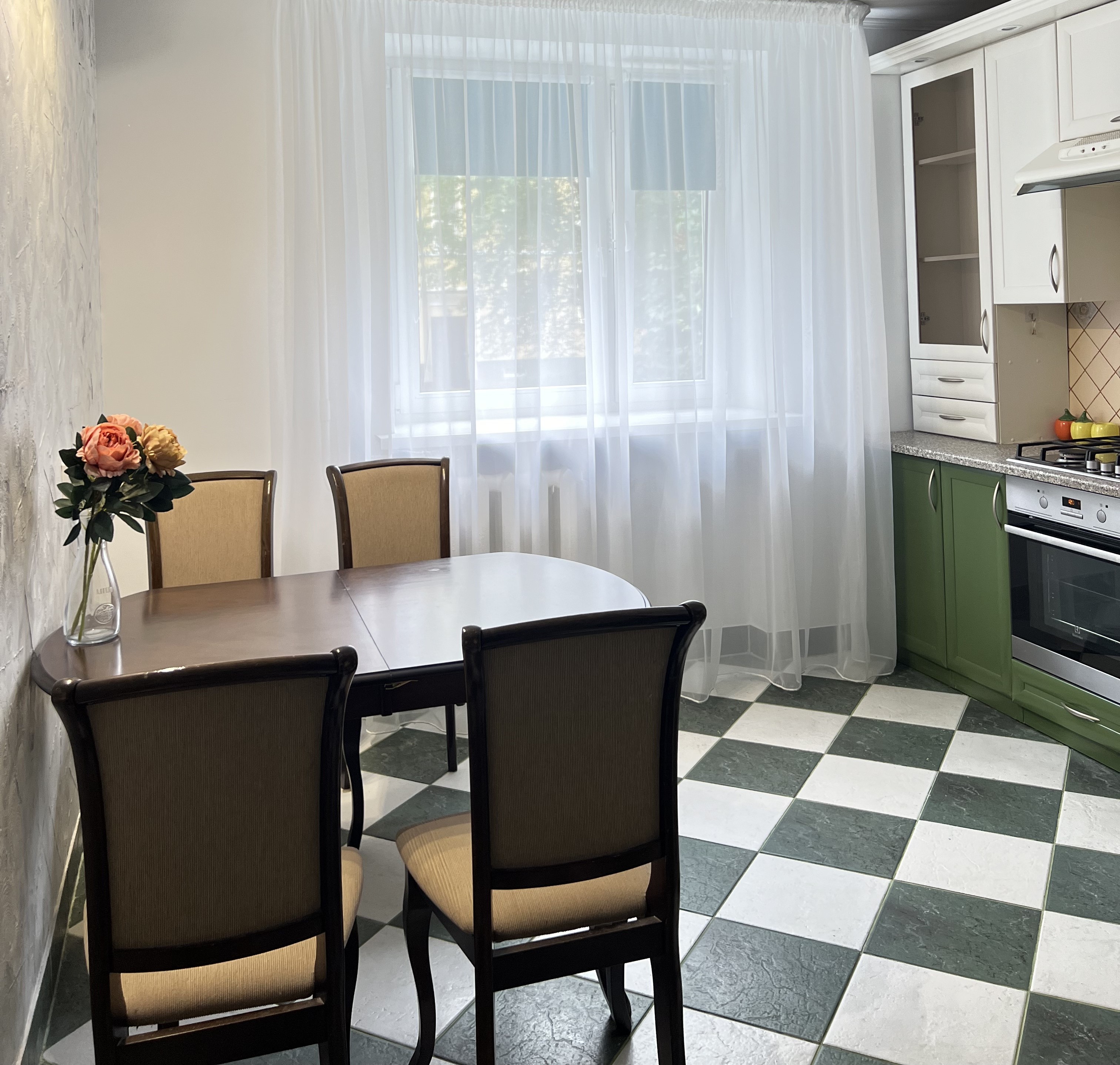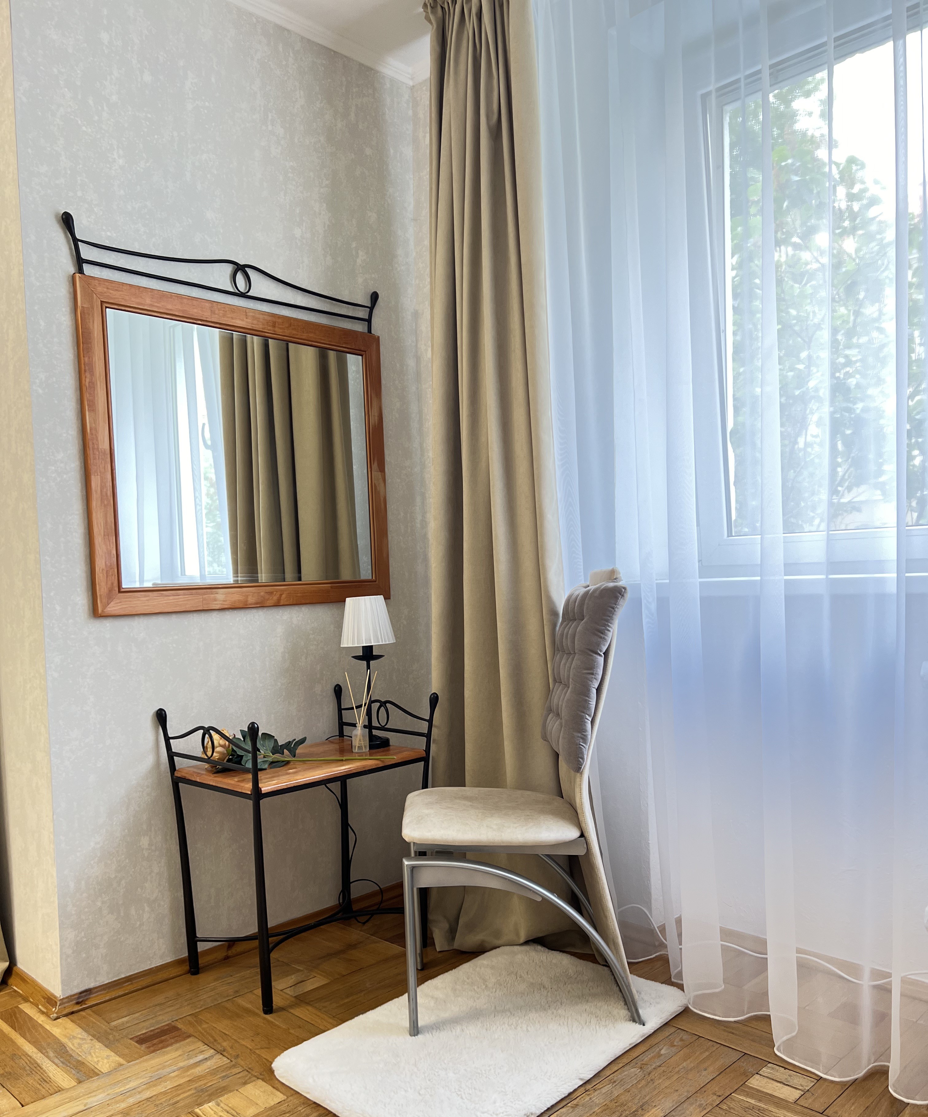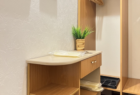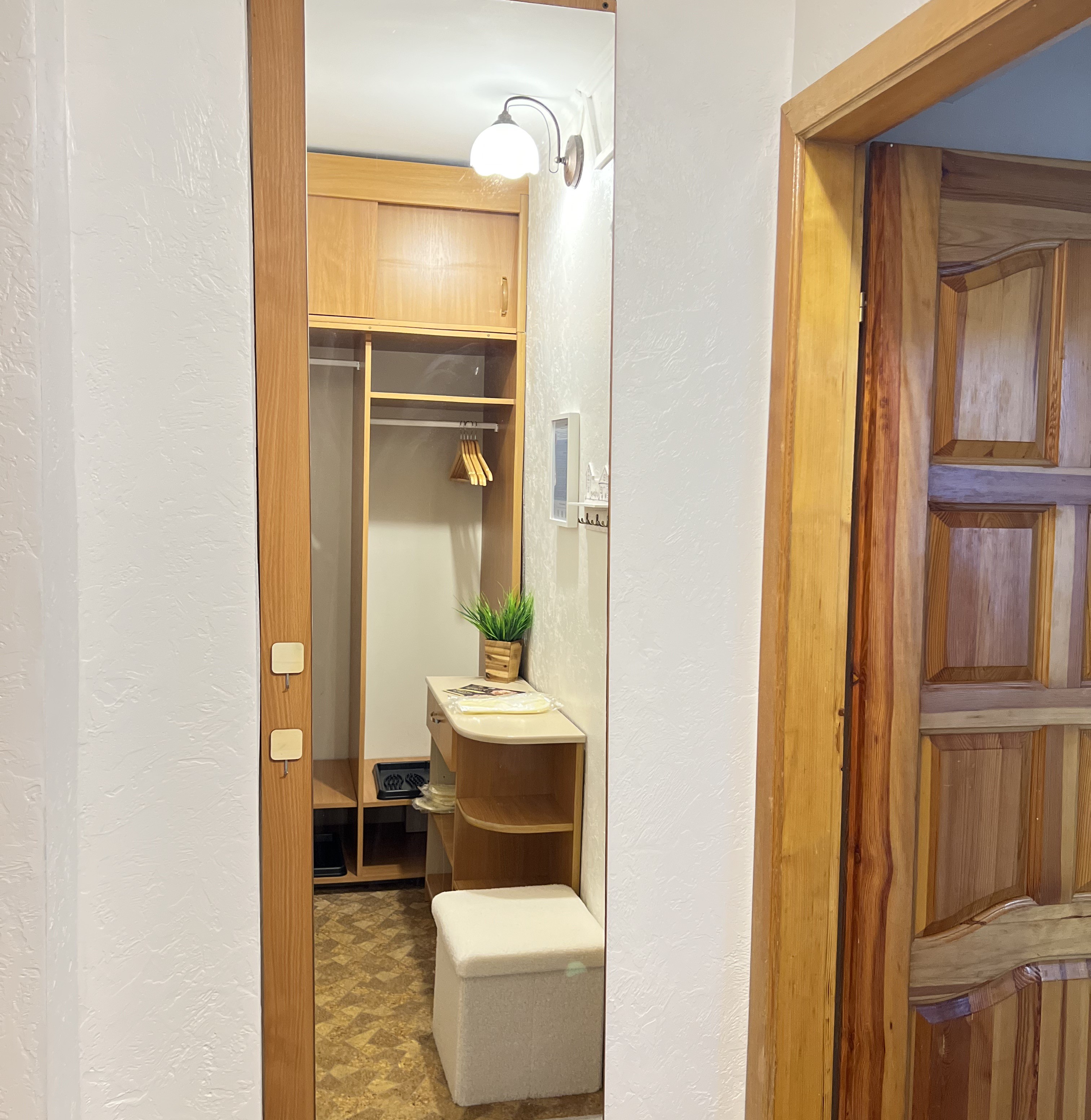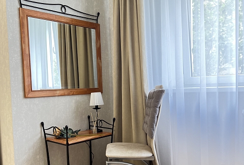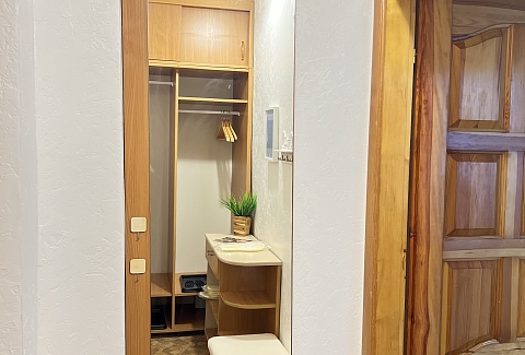 В номере: вешалка, диван, зеркало, кровать двуспальная, прикроватные тумбочки, стол, стулья, шкаф, гладильная доска, набор посуды, плита электрическая, стиральная машина, сушилка для белья, телевизор ЖК, утюг, холодильник, чайный набор посуды, электрочайник