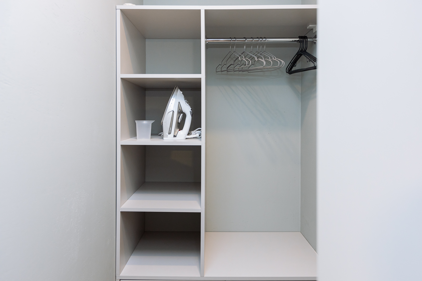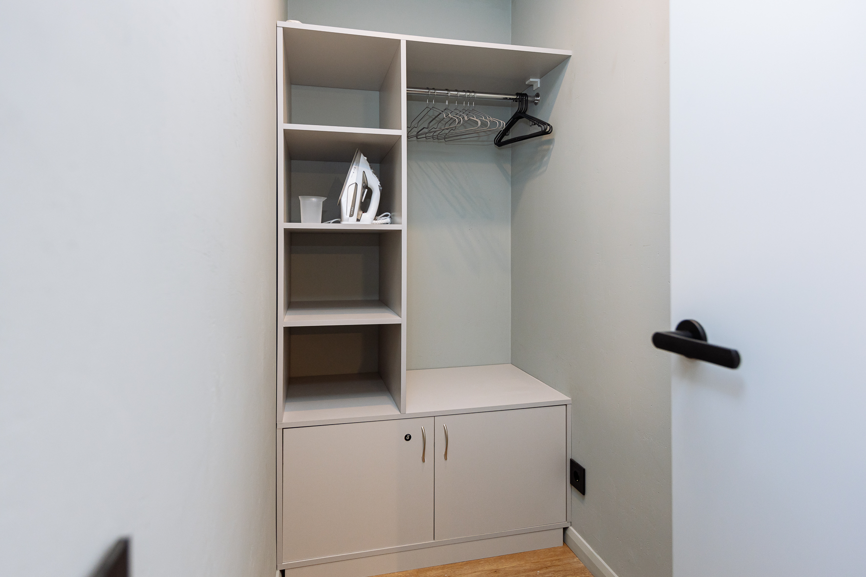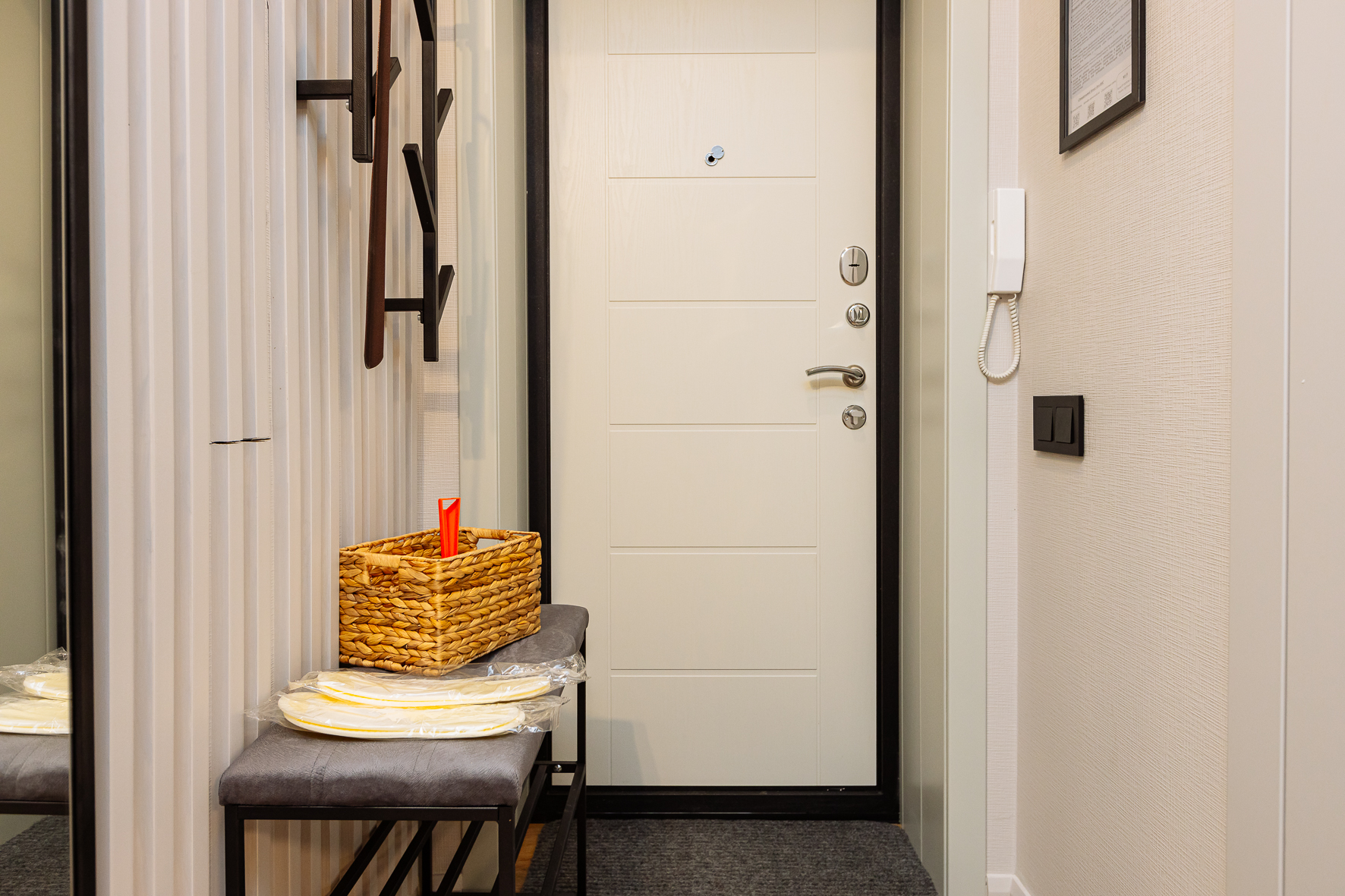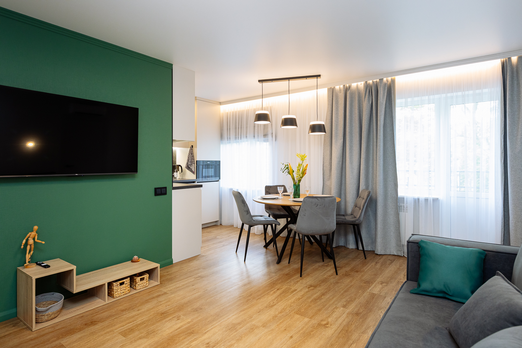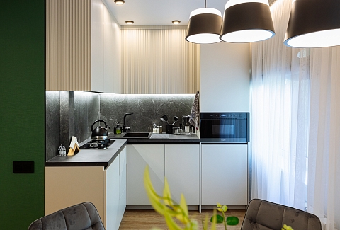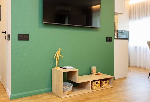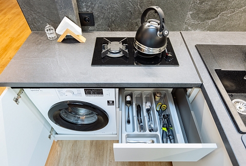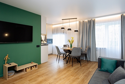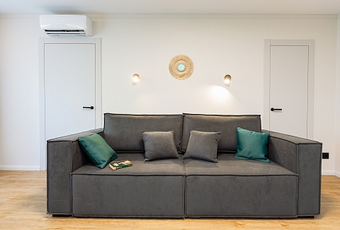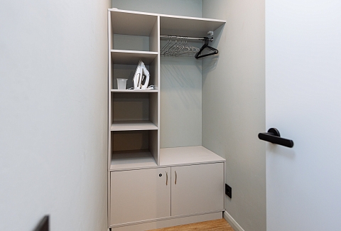 В номере: вешалка, диван, зеркало, кровать двуспальная, прикроватные тумбочки, стол, стулья, шкаф, гладильная доска, кондиционер, микроволновая печь, набор посуды, плита электрическая, стиральная машина, сушилка для белья, телевизор ЖК, утюг, холодильник, чайный набор посуды, электрочайник