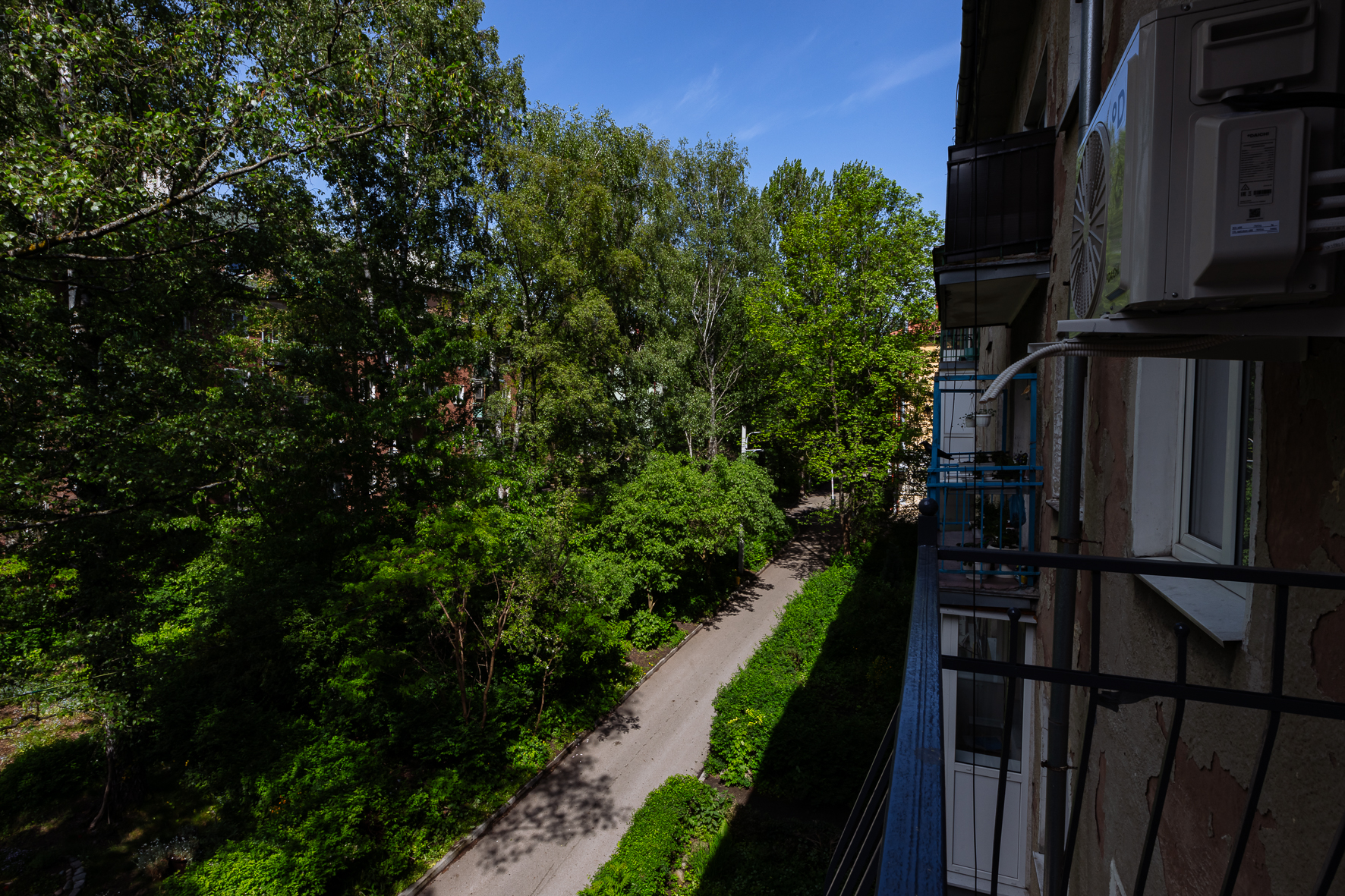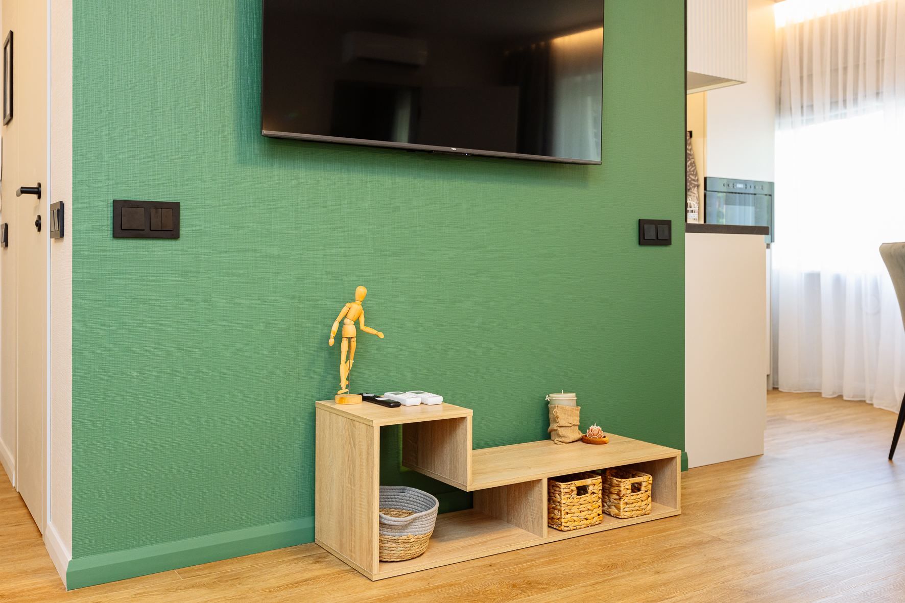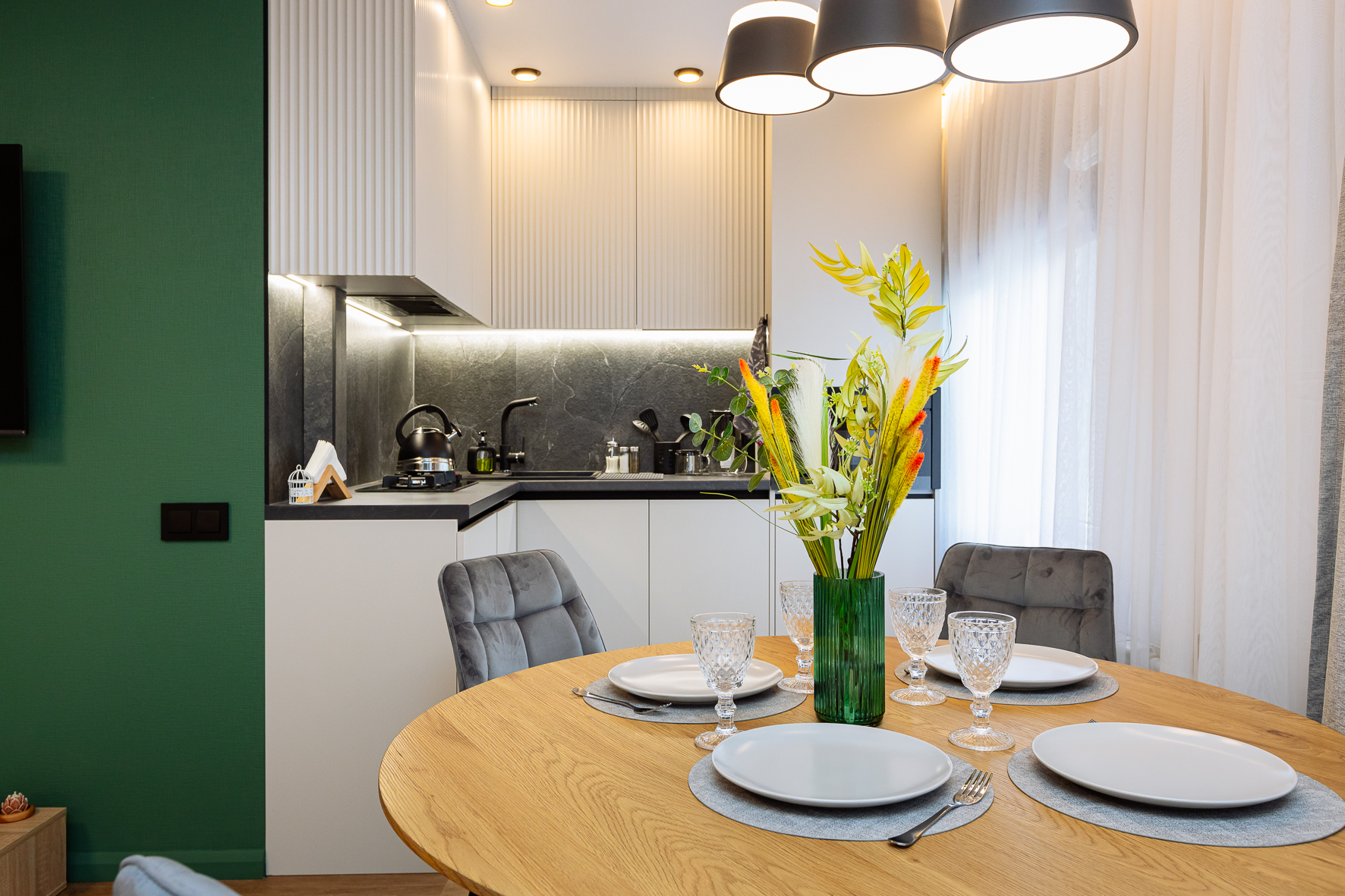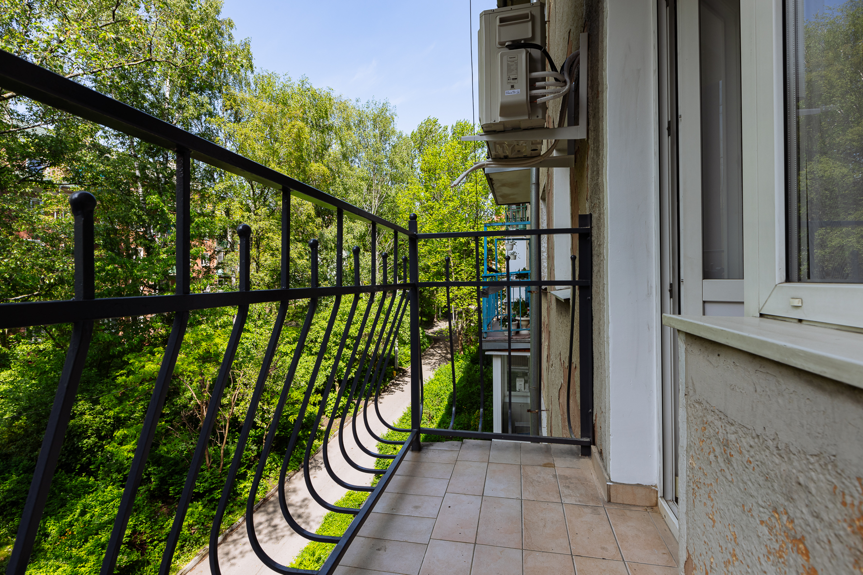 В номере: вешалка, диван, зеркало, кровать двуспальная, прикроватные тумбочки, стол, стулья, шкаф, гладильная доска, кондиционер, микроволновая печь, набор посуды, плита электрическая, стиральная машина, сушилка для белья, телевизор ЖК, утюг, холодильник, чайный набор посуды, электрочайник