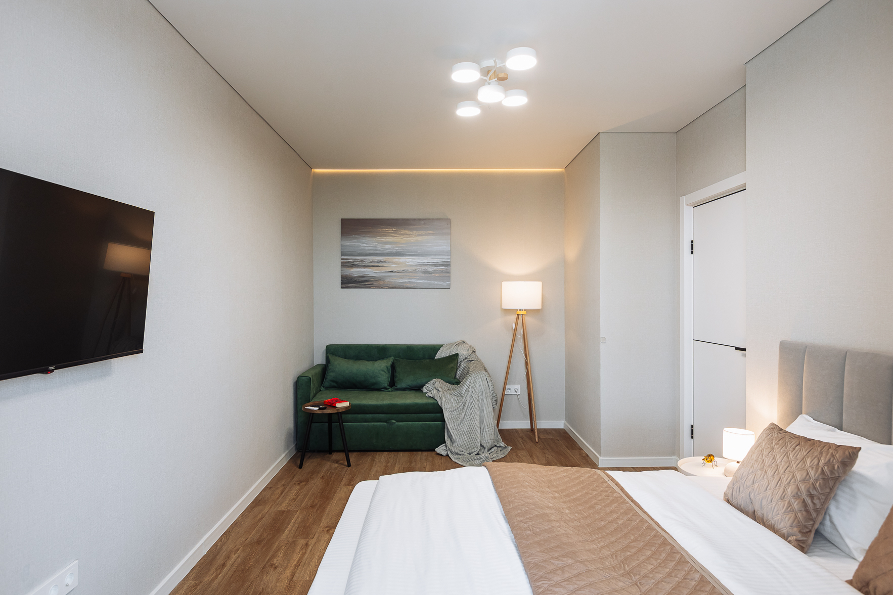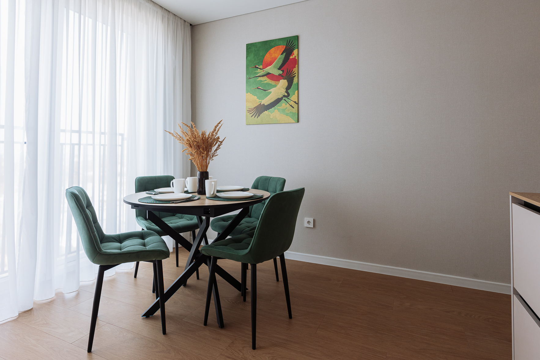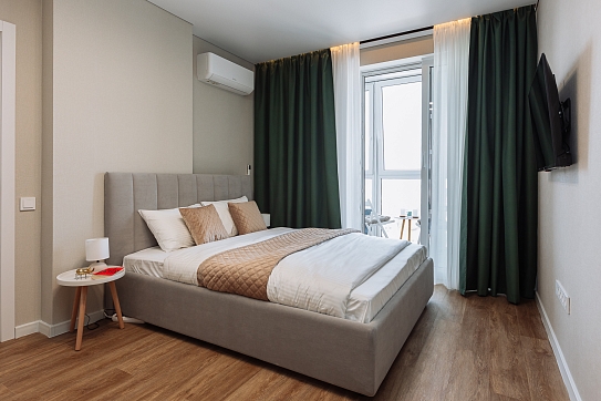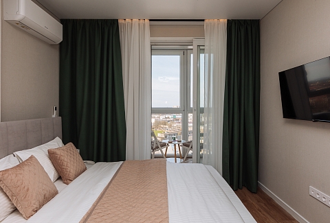 Прямо в доме работают кафе, пункты выдачи заказов и банк. Рядом находятся модный гастрорынок, кинотеатр, фитнес-центр, МФЦ и торговые центры. До центра города на машине около 10–15 минут, до аэропорта — примерно 20 минут. Для гостей на автомобиле предусмотрена парковка. Пространство рассчитано на комфортное размещение трёх гостей: здесь есть большая кровать и удобный раскладной диван. В наличии кондиционер, быстрый Wi-Fi и Smart TV. В ванной комнате — ванна, стиральная машина, фен, набор мягких полотенец, белые халаты и гигиенические принадлежности. Кухня полностью оборудована техникой и посудой, включая посудомоечную машину. Приятные мелочи: кофемашина, чай, кофе, базовые продукты и бутилированная вода. Из панорамных окон на 16 этаже открывается спокойный вид без городского шума. Для семей с детьми по запросу предоставляются кроватка, стульчик и коляска. Гостям доступна закрытая территория комплекса с дворами без машин и зонами отдыха. В самом доме работают кафе и сервисные службы. Также предусмотрены бесконтактное заселение и возможность размещения с животными по предварительному согласованию. Редкое сочетание городского комфорта и лёгкого доступа к морскому отдыху без лишнего стресса. Здесь царит чистая, спокойная и продуманная атмосфера, которая идеально подойдёт парам, семьям с детьми и деловым путешественникам. Для командированных гостей предоставляются все необходимые документы и чеки, а быстрый заезд без ожидания делает этот вариант особенно удобным для тех, кто ценит своё время.
