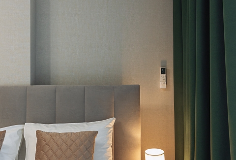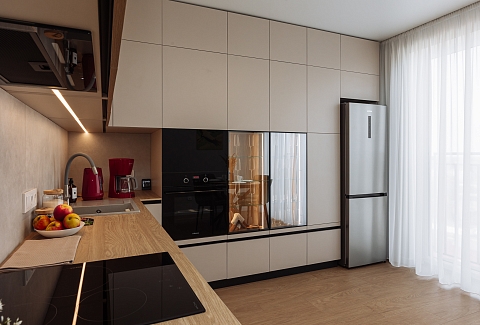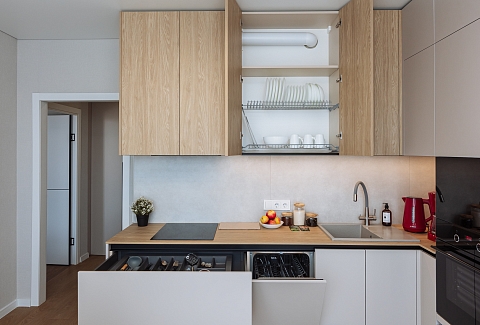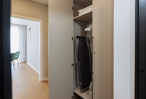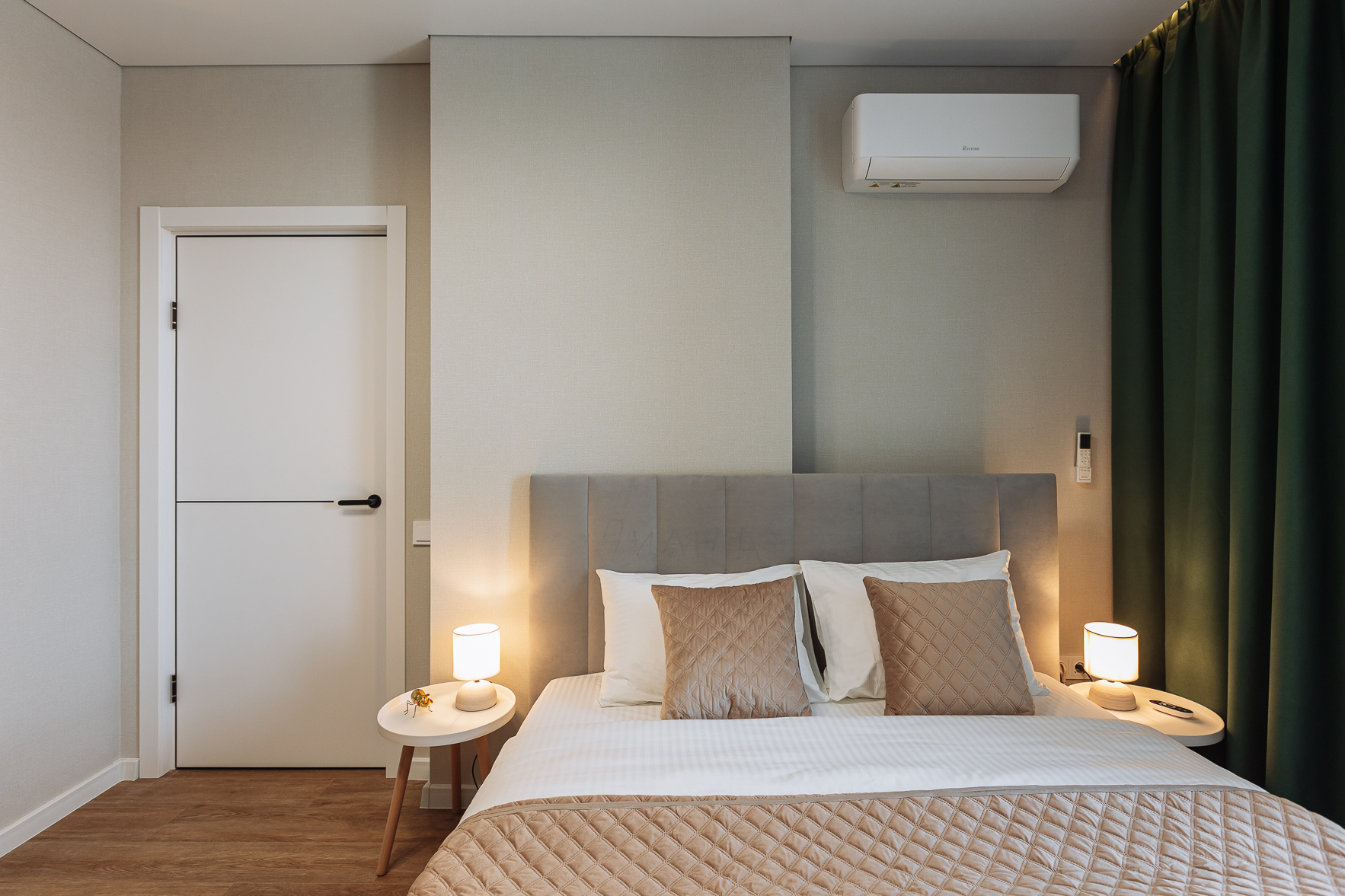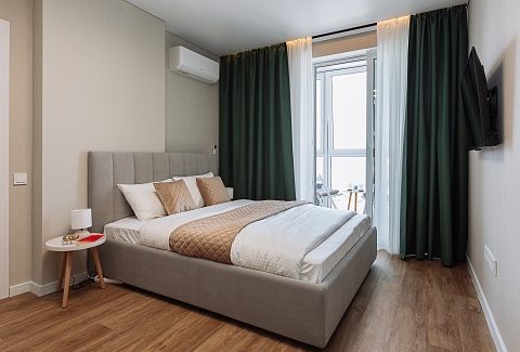 В номере: диван, зеркало, кровать двуспальная, стол, стулья, шкаф, кондиционер, микроволновая печь, набор посуды, плита, посудомоечная машина, стиральная машина, сушилка для белья, телевизор ЖК, утюг, холодильник, чайный набор посуды, электрочайник