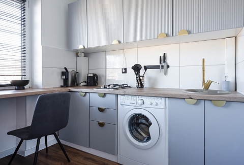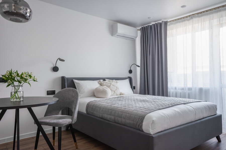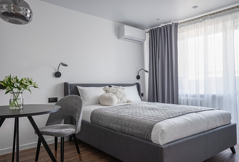В номере: диван, зеркало, кровать двуспальная, прикроватные тумбочки, стол, стулья, шкаф, гладильная доска, духовой шкаф, кондиционер, микроволновая печь, набор посуды, плита электрическая, стиральная машина, сушилка для белья, телевизор ЖК, утюг, холодильник, чайный набор посуды, электрочайник