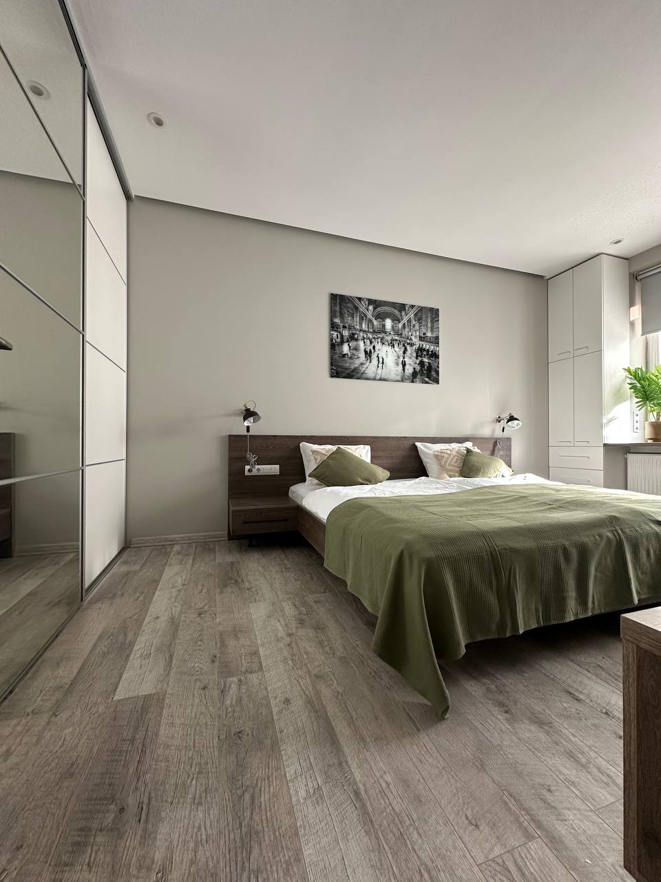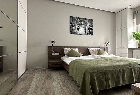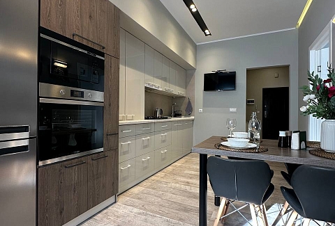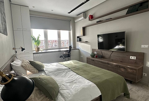 В номере: диван, зеркало, кровать двуспальная, стол, стулья, шкаф, гладильная доска, духовой шкаф, кондиционер, микроволновая печь, набор посуды, плита электрическая, стиральная машина, сушилка для белья, телевизор ЖК, утюг, холодильник, чайный набор посуды, электрочайник