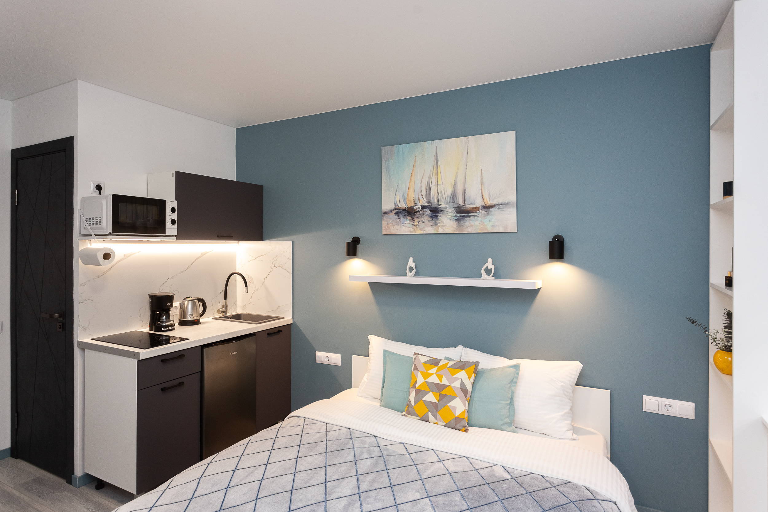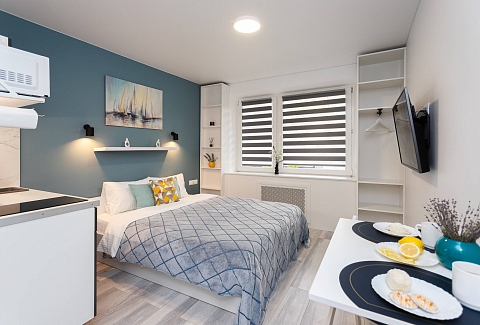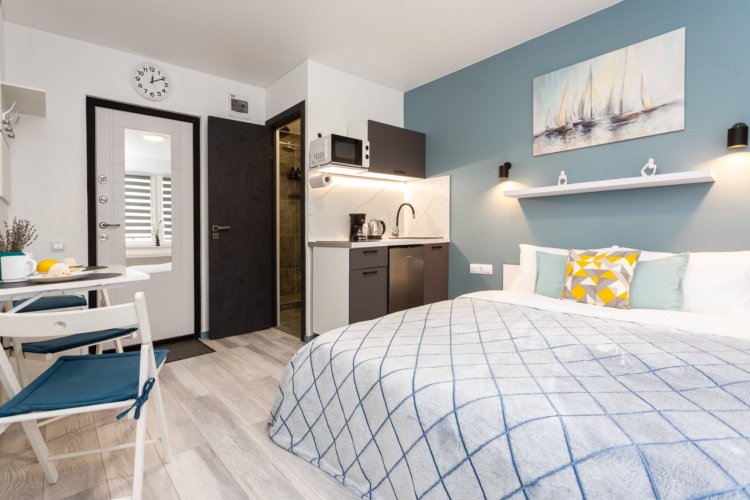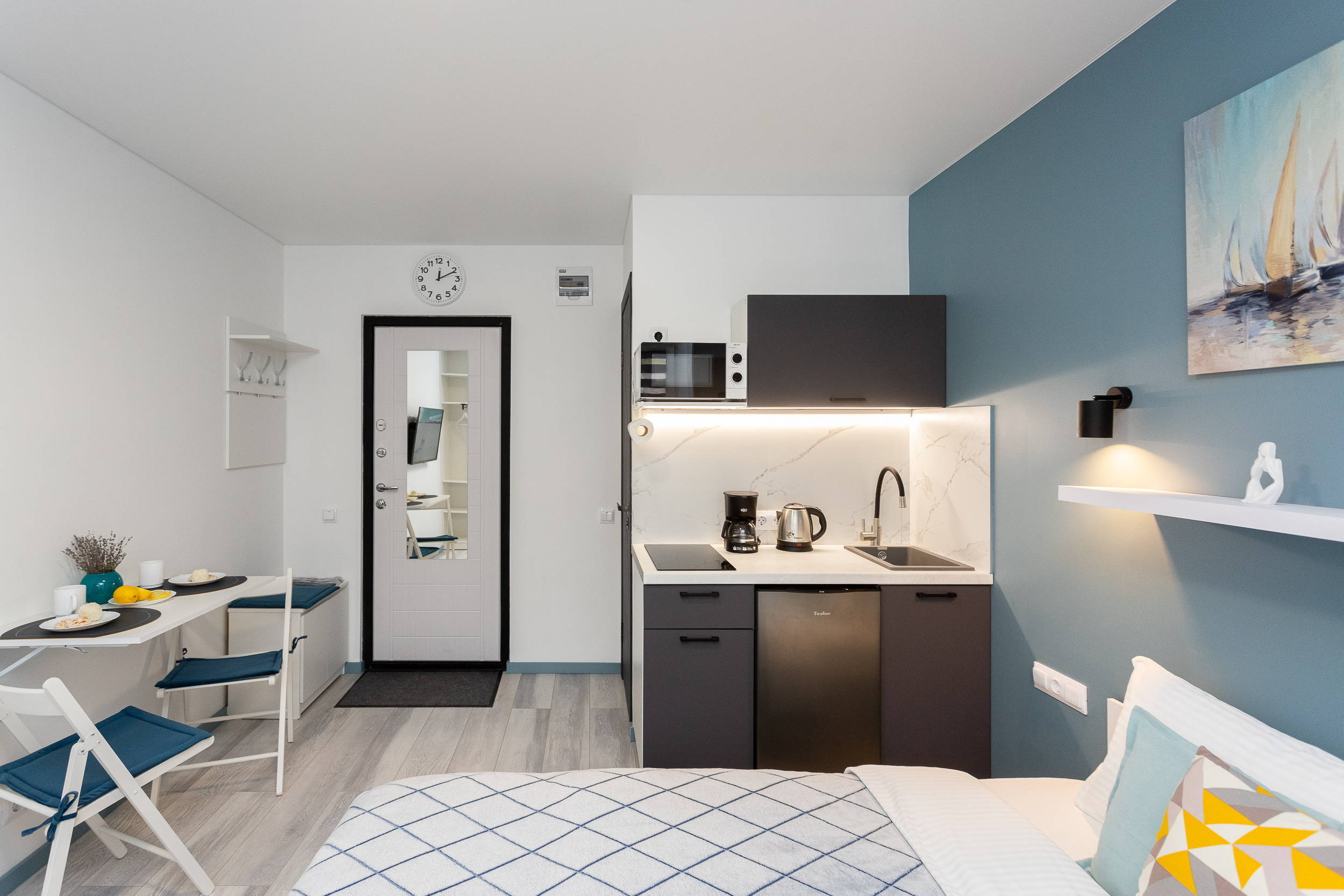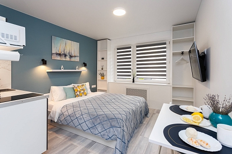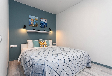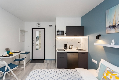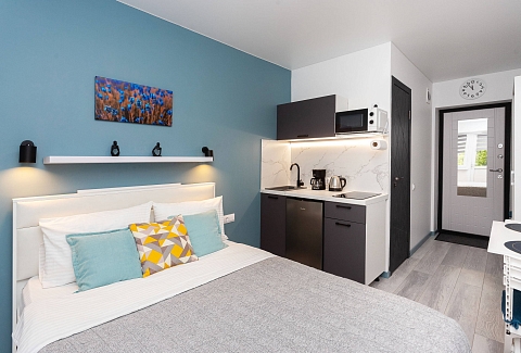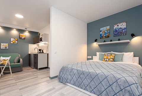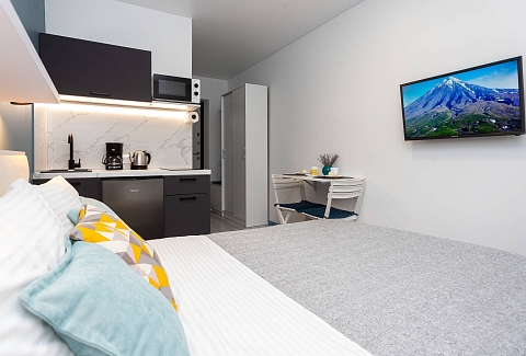 В номере: вешалка, диван раскладной, зеркало, кровать двуспальная, стол, стулья, шкаф, кондиционер, микроволновая печь, мини-холодильник, набор посуды, плита электрическая, стиральная машина, сушилка для белья, телевизор, утюг, холодильник, электрочайник