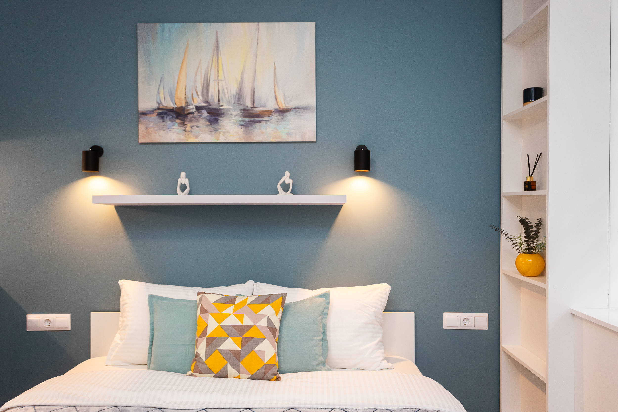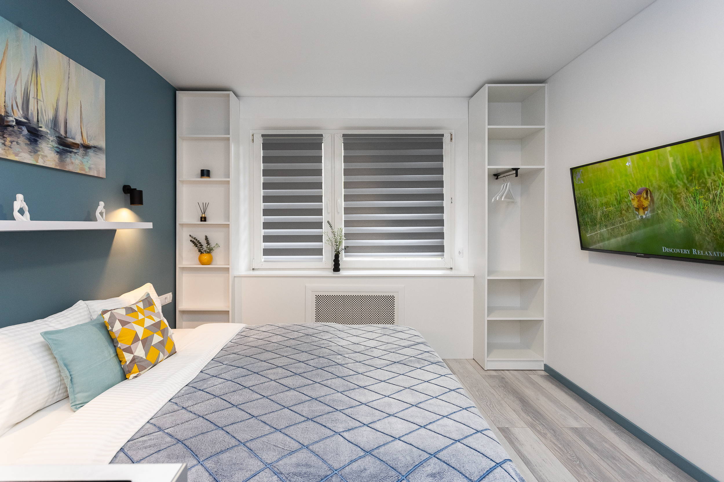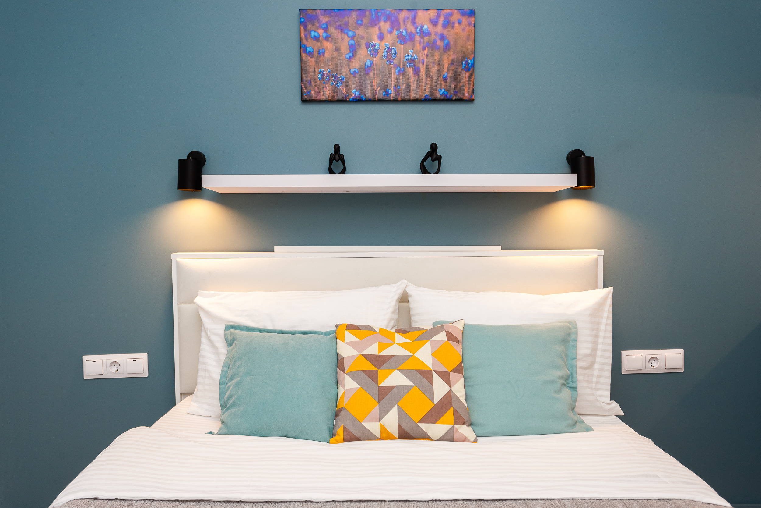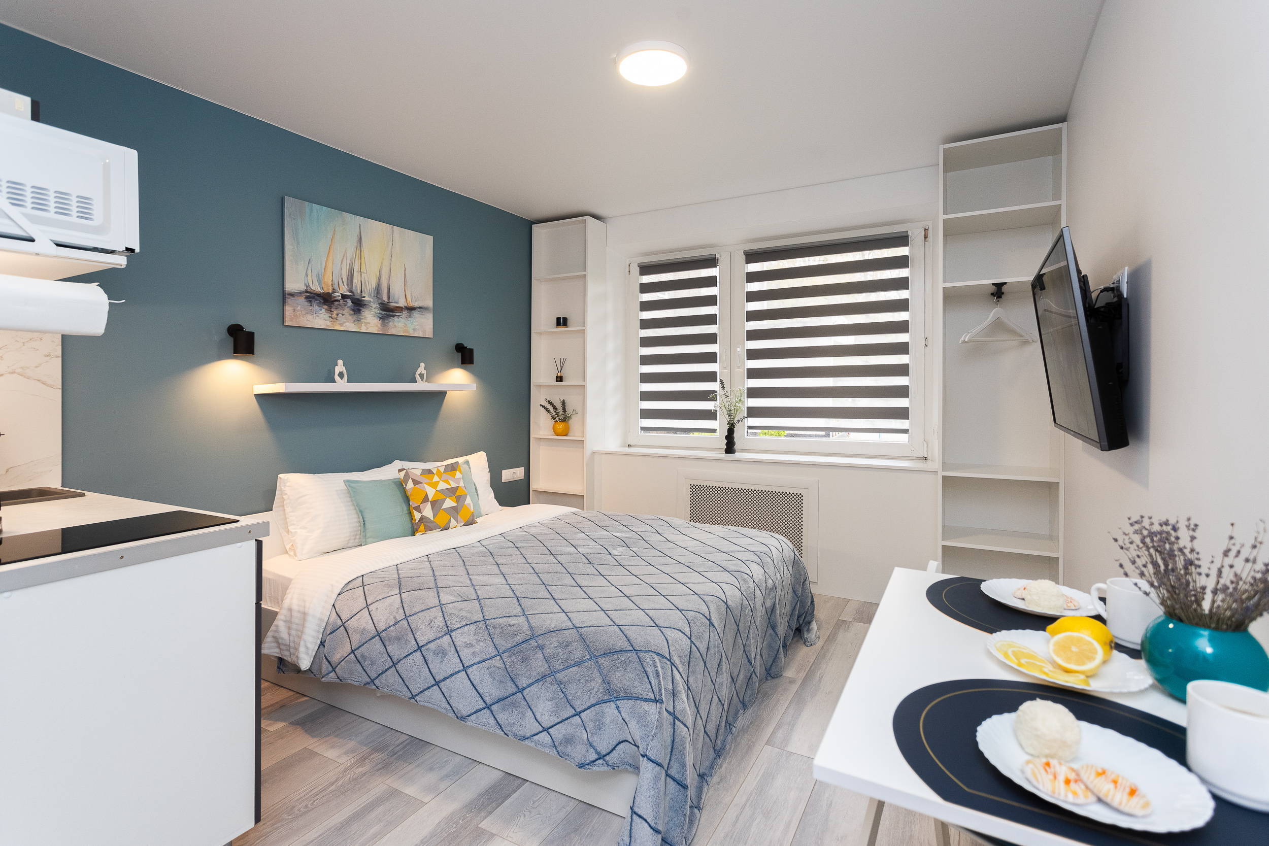 В номере: вешалка, диван раскладной, зеркало, кровать двуспальная, стол, стулья, шкаф, кондиционер, микроволновая печь, мини-холодильник, набор посуды, плита электрическая, стиральная машина, сушилка для белья, телевизор, утюг, холодильник, электрочайник