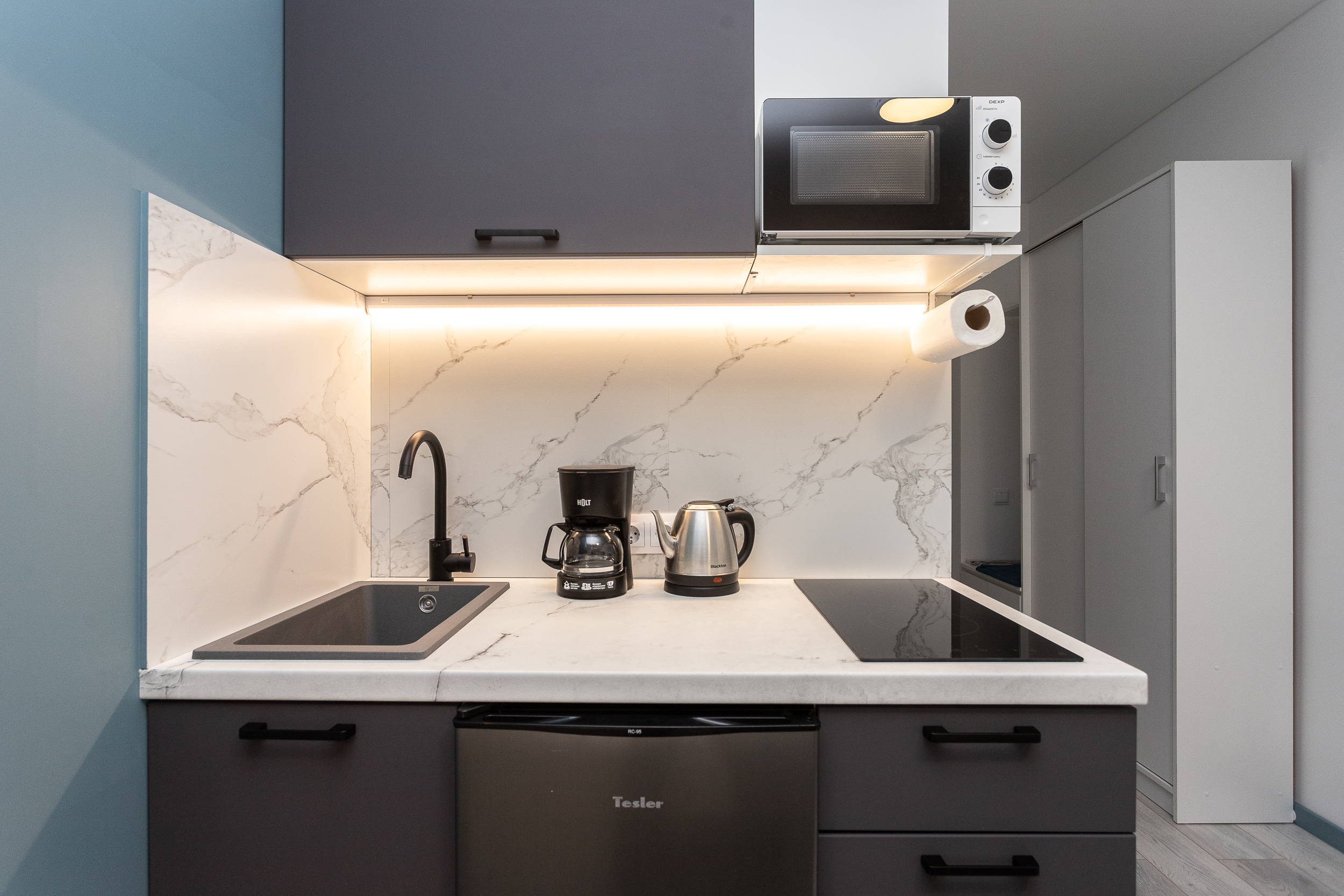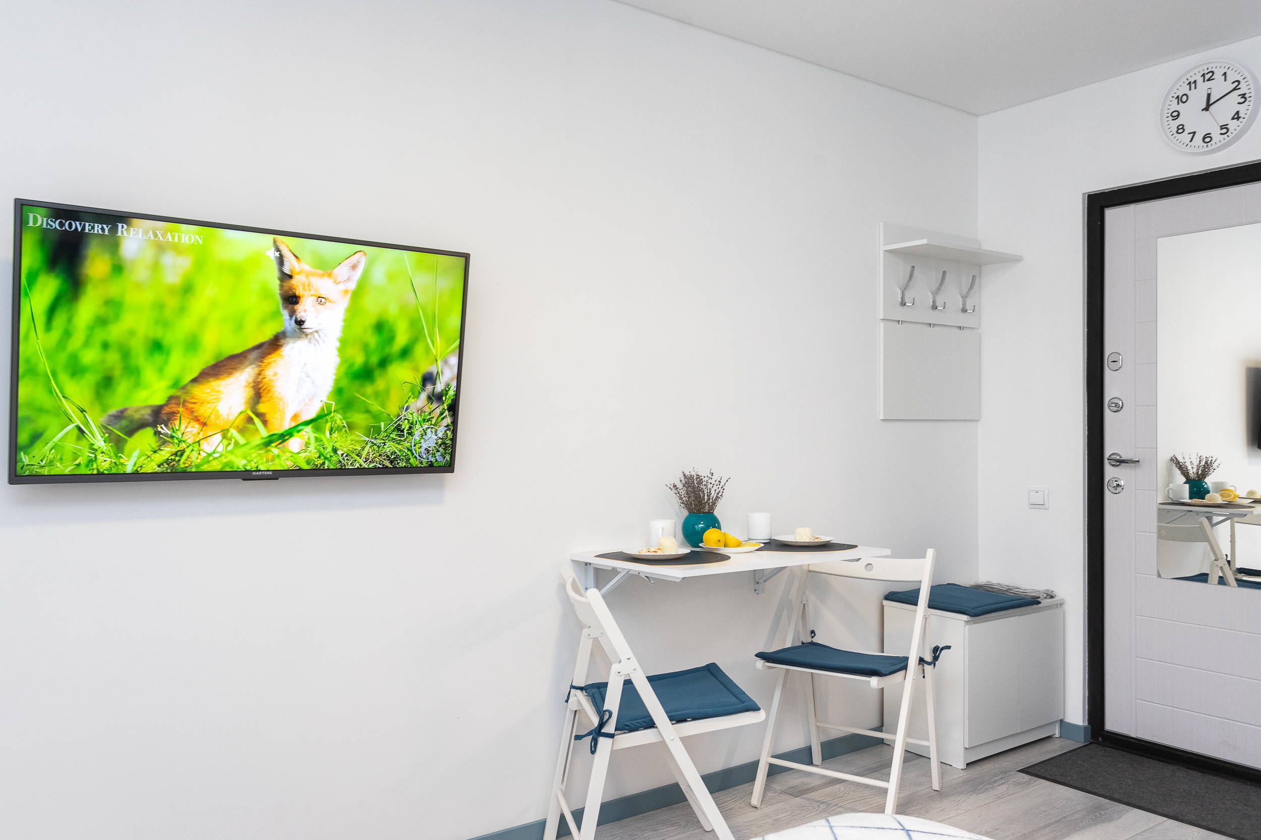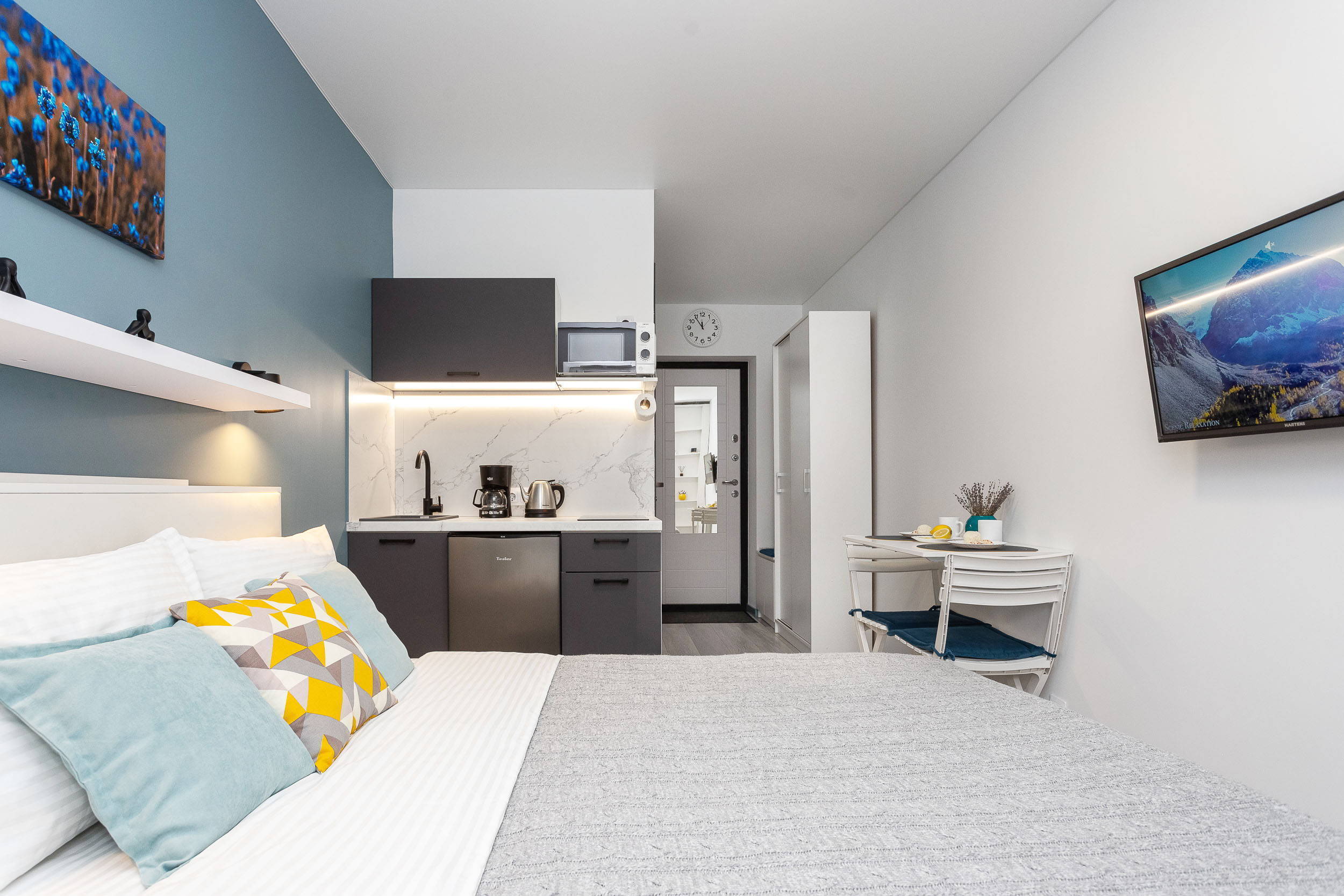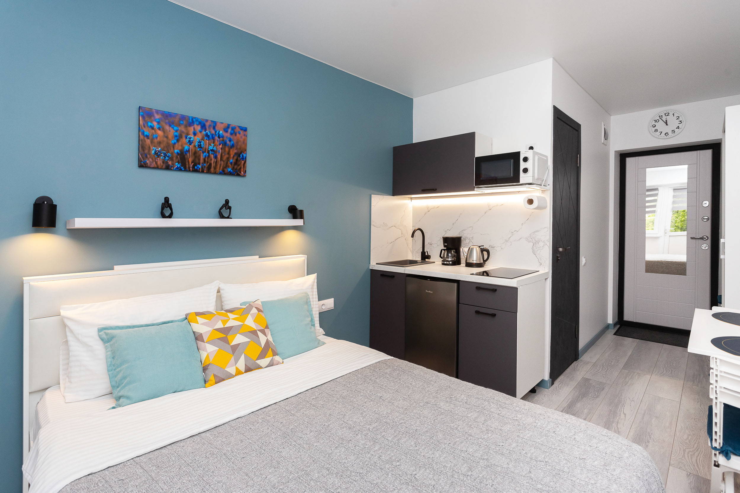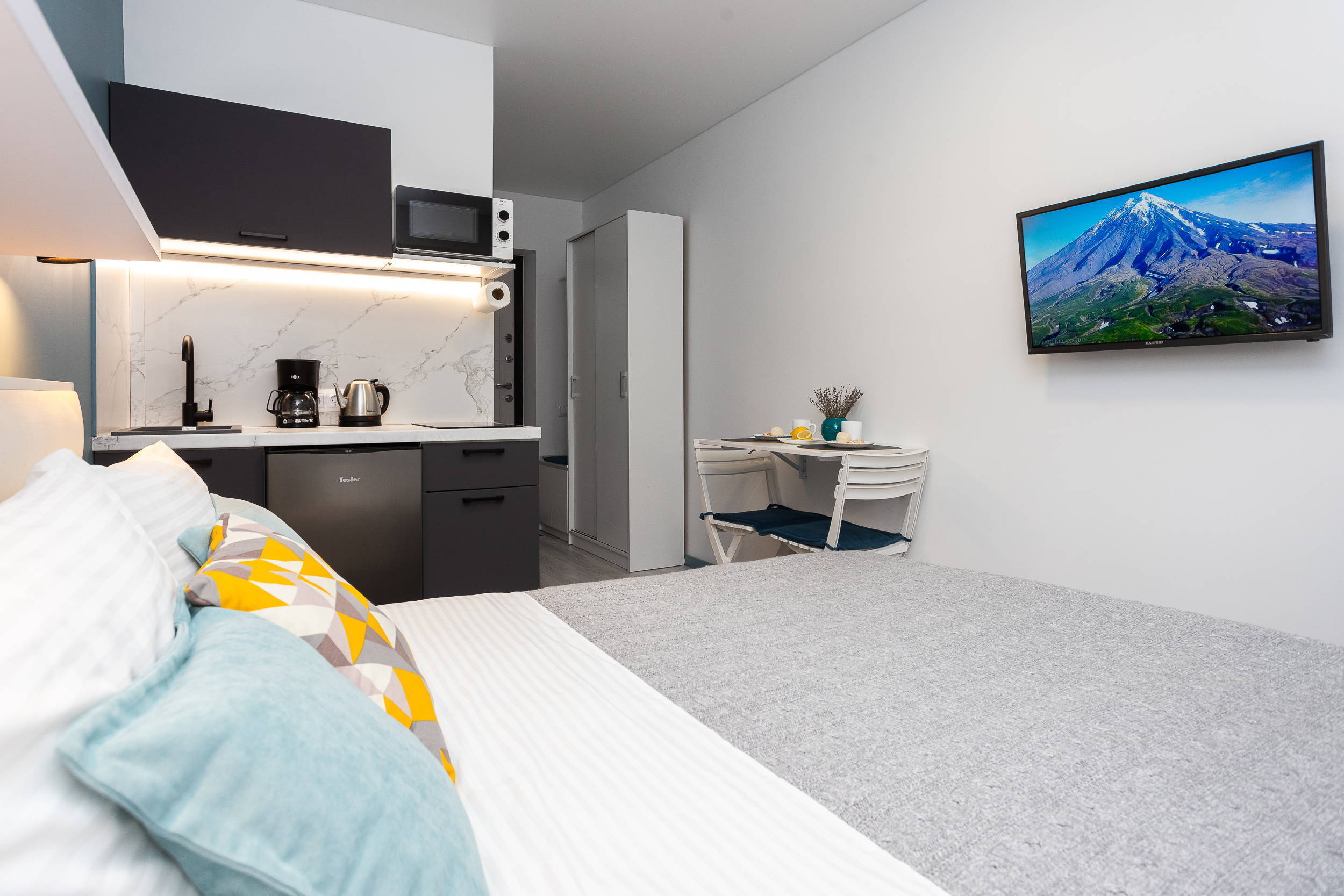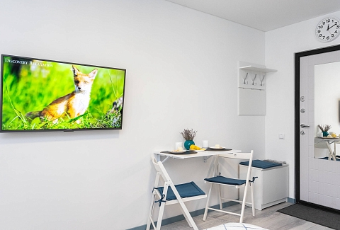 В номере: вешалка, зеркало, кровать двуспальная, стол, стулья, шкаф, гладильная доска, микроволновая печь, мини-холодильник, набор посуды, плита электрическая, стиральная машина, сушилка для белья, телевизор, утюг, холодильник, электрочайник