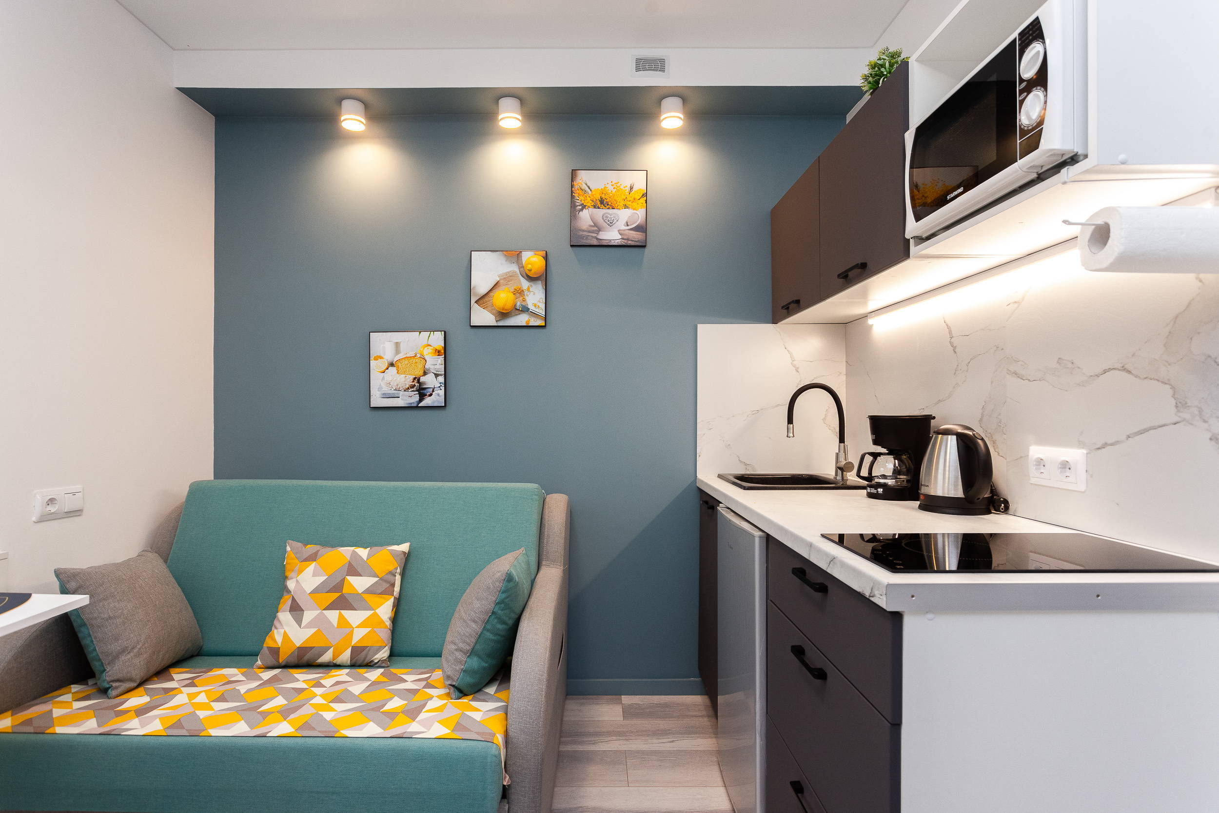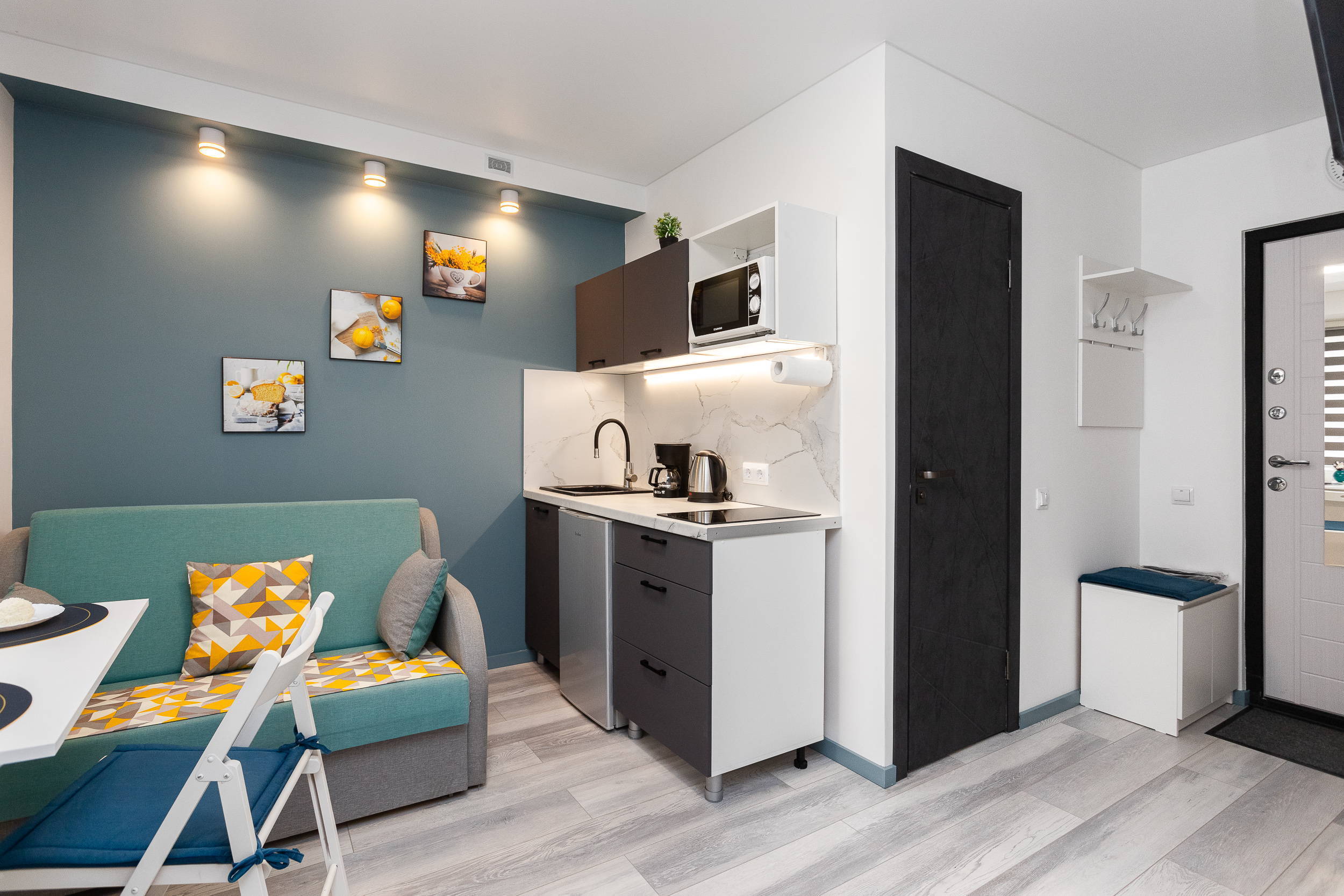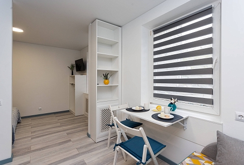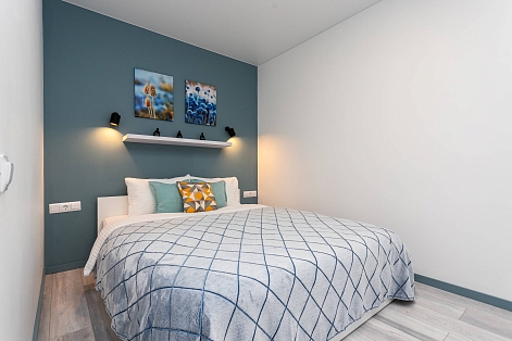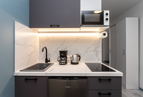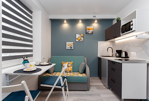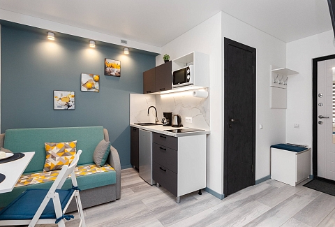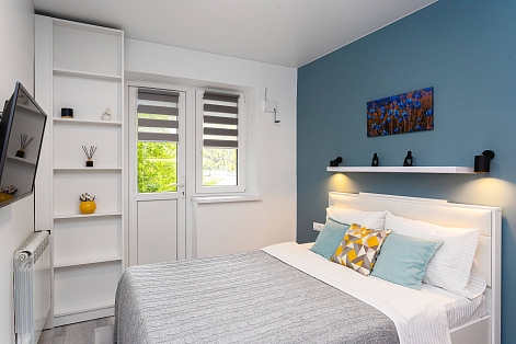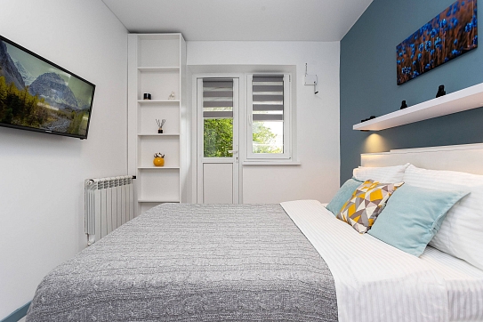 Для гостей, путешествующих на автомобиле, предусмотрена удобная парковка.Внутреннее пространство грамотно организовано для отдыха четырех гостей. Предусмотрены двуспальная кровать шириной 160 сантиметров и компактный диван. В распоряжении гостей современная бытовая техника: варочная панель, мини-холодильник, СВЧ-печь, электрочайник, стиральная машина и всё необходимое для глажки. Кухонная зона полностью укомплектована посудой и принадлежностями для приготовления еды. В ванной комнате с душевой кабиной всегда есть горячая вода, а для комфорта предусмотрен фен. К приятным мелочам относятся свежее постельное белье, полотенца, тапочки, а также стартовый набор гигиенических средств, чай, кофе и сахар. В апартаментах работает бесплатный беспроводной интернет и есть телевизор с плоским экраном.Это уютное пространство на первом этаже станет надежным убежищем в ритме большого города: здесь гарантирована тишина, тщательная дезинфицирующая уборка после каждого выезда и круглосуточная возможность самостоятельного заезда без лишних контактов.