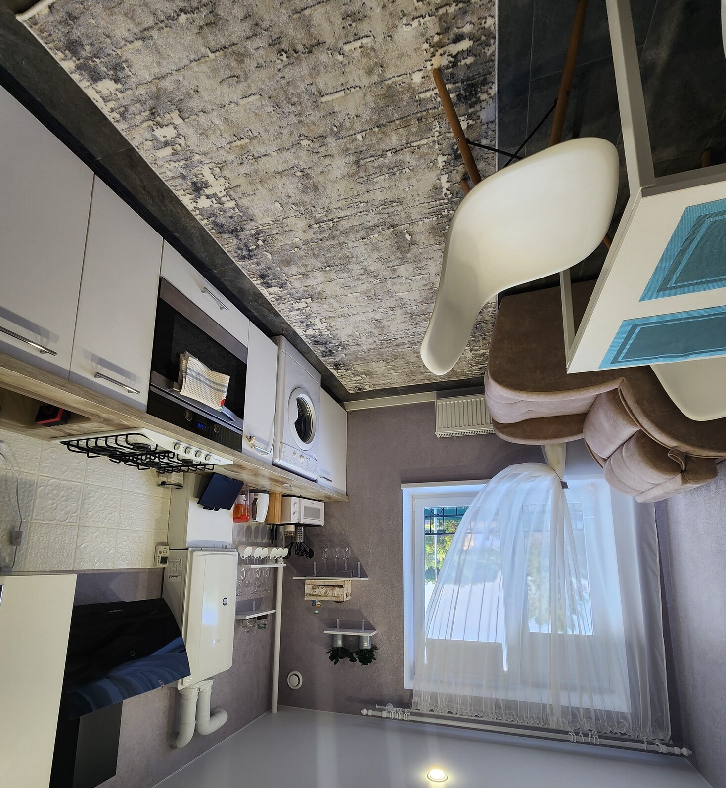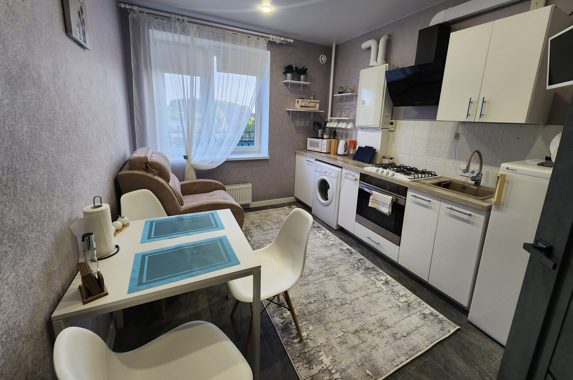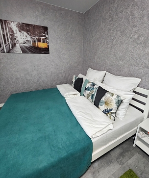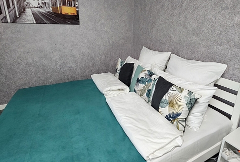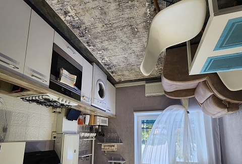 В номере: вешалка, диван, зеркало, кровать двуспальная, прикроватные тумбочки, стол, стулья, шкаф, гладильная доска, кондиционер, микроволновая печь, мини-холодильник, набор посуды, плита газовая, стиральная машина, сушилка для белья, телевизор ЖК, утюг, холодильник, чайный набор посуды, электрочайник
