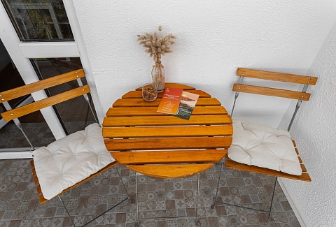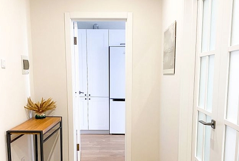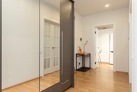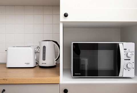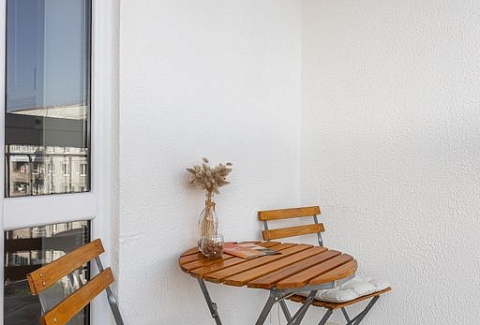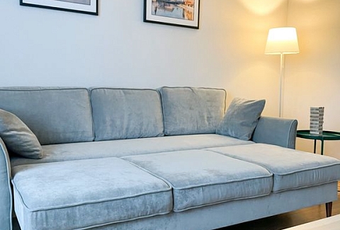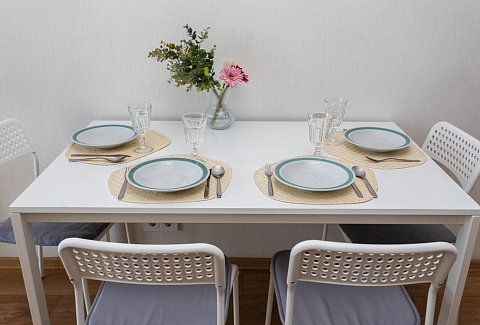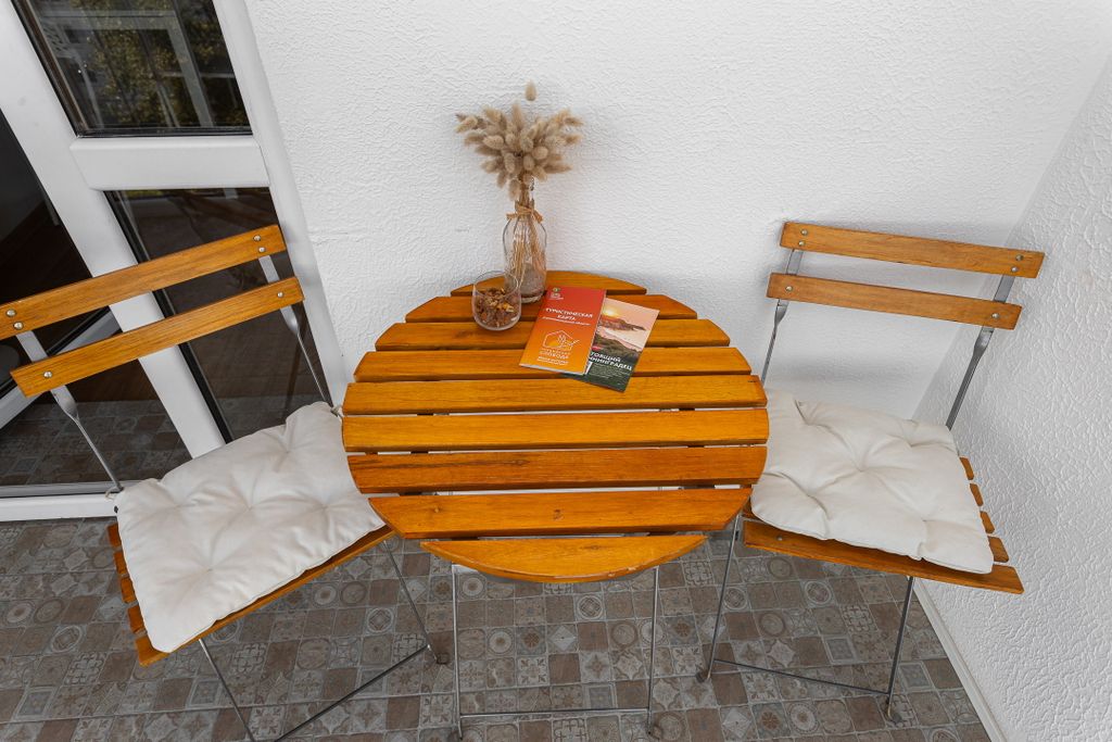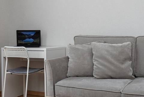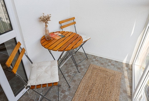 В номере: вешалка, диван, зеркало, кровать двуспальная, стол, стулья, шкаф, гладильная доска, кондиционер, микроволновая печь, набор посуды, плита электрическая, стиральная машина, сушилка для белья, телевизор ЖК, утюг, холодильник, чайный набор посуды, электрочайник
