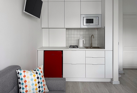 В номере: диван, зеркало, кровать двуспальная, стол, стулья, шкаф, микроволновая печь, набор посуды, плита электрическая, стиральная машина, телевизор ЖК, утюг, холодильник, чайный набор посуды, электрочайник