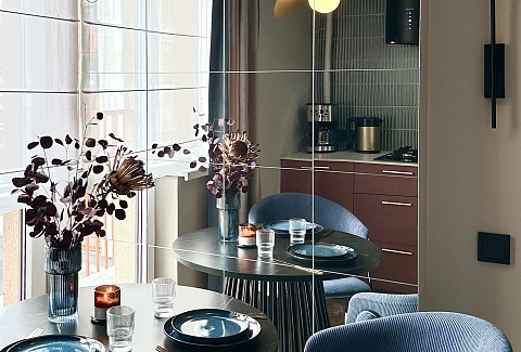 В номере: диван, зеркало, кровать двуспальная, стол, стулья, шкаф, микроволновая печь, набор посуды, плита электрическая, посудомоечная машина, стиральная машина, телевизор, утюг, холодильник, чайный набор посуды, электрочайник
