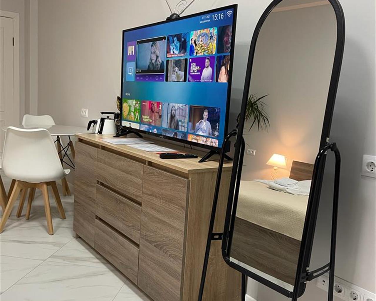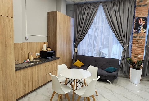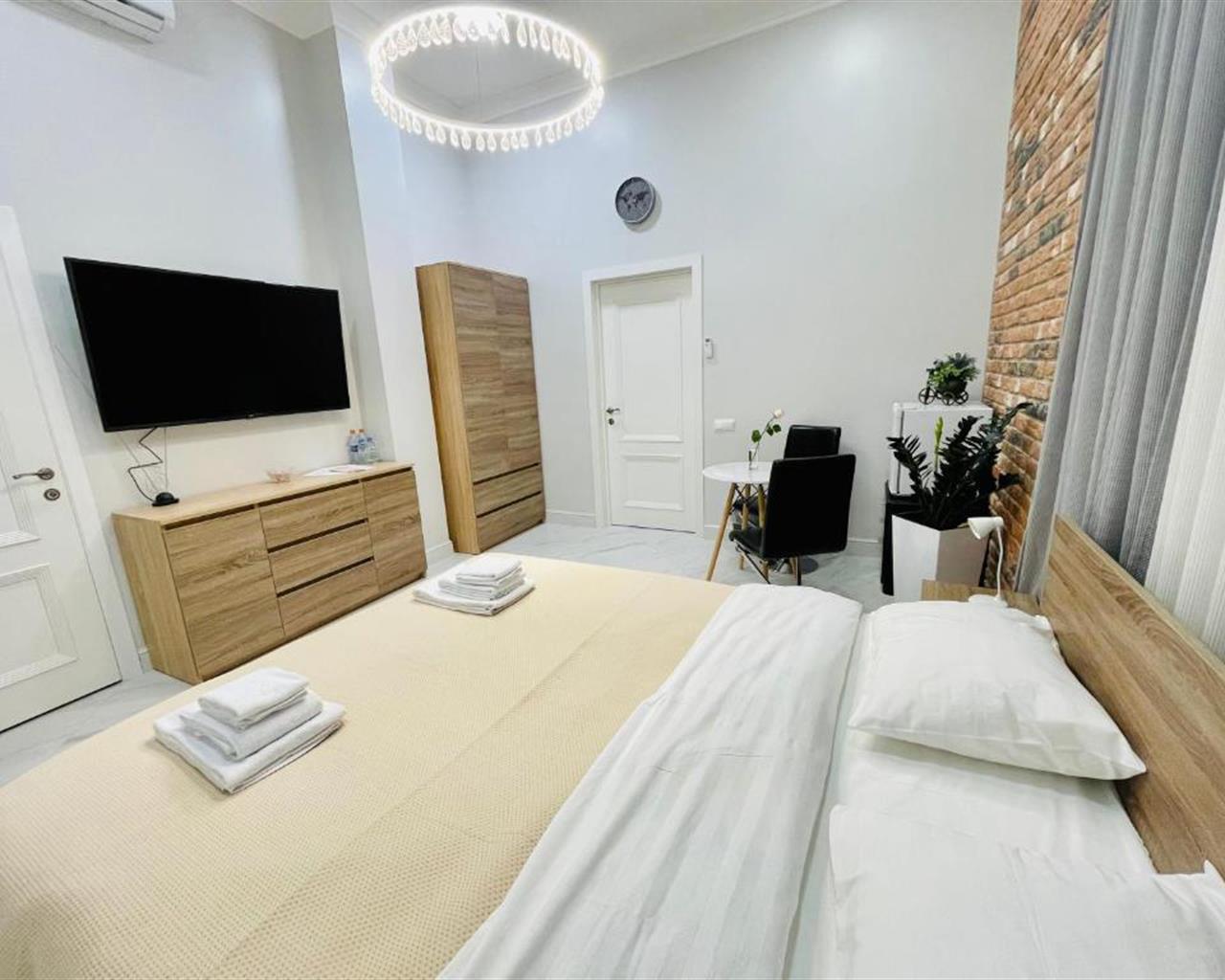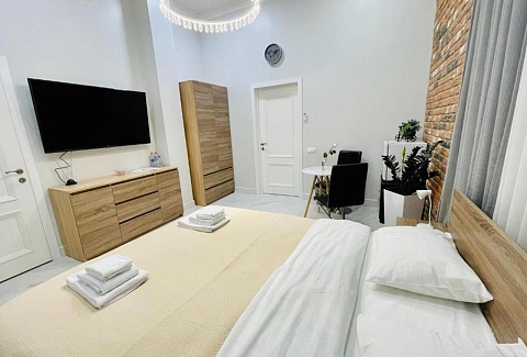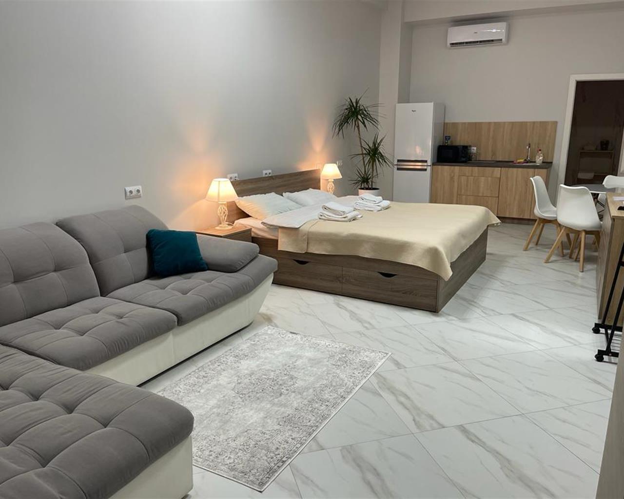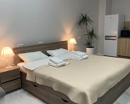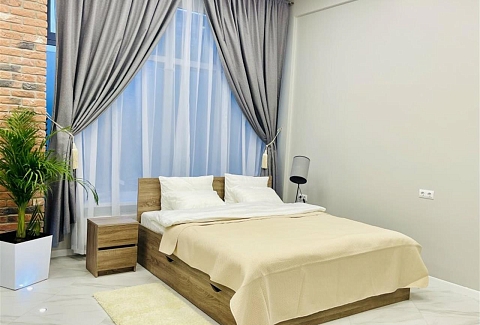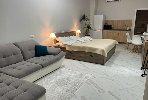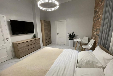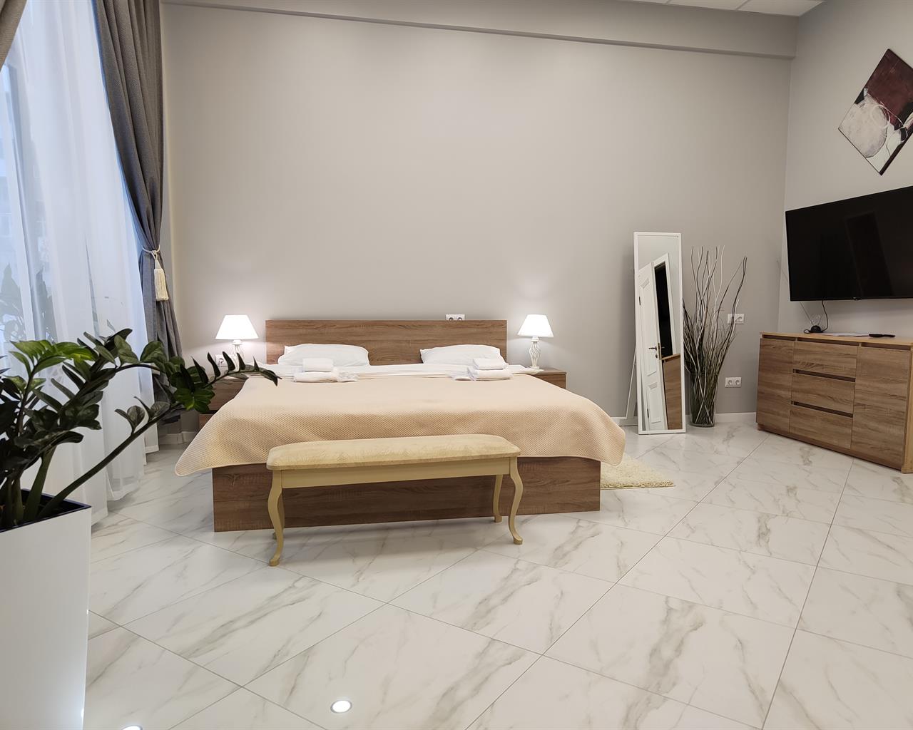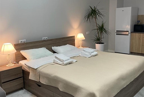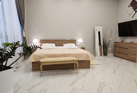 В номере: вешалка, гардеробная, диван раскладной, зеркало, кровать двуспальная, кухонная мебель, прикроватные тумбочки, стол, стулья, тумба под телевизор, шкаф, гладильная доска, кондиционер, кофемашина, микроволновая печь, набор посуды, телевизор ЖК, утюг, холодильник, электрочайник