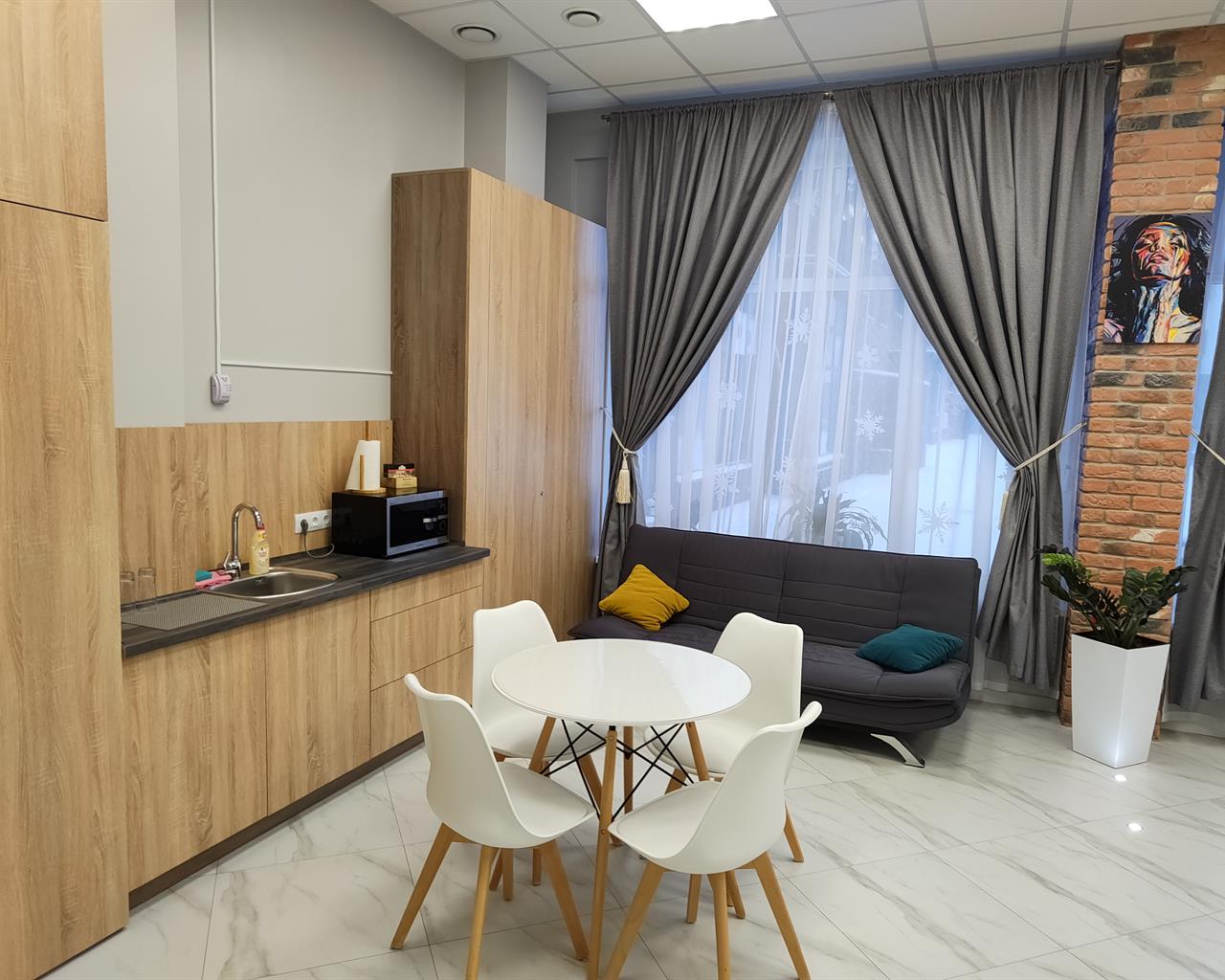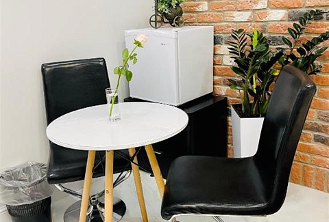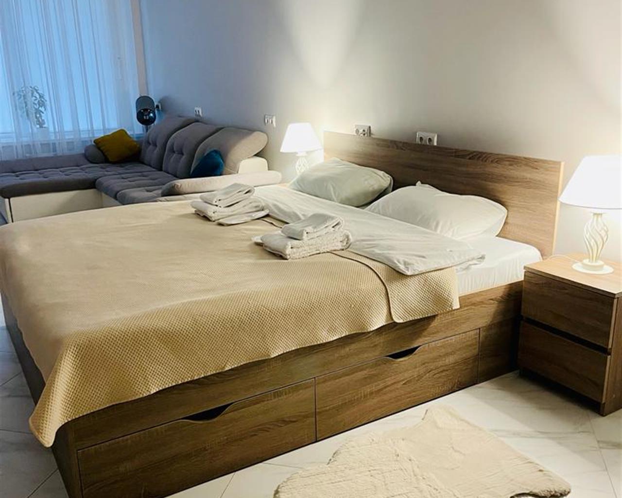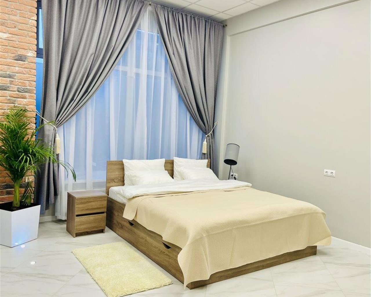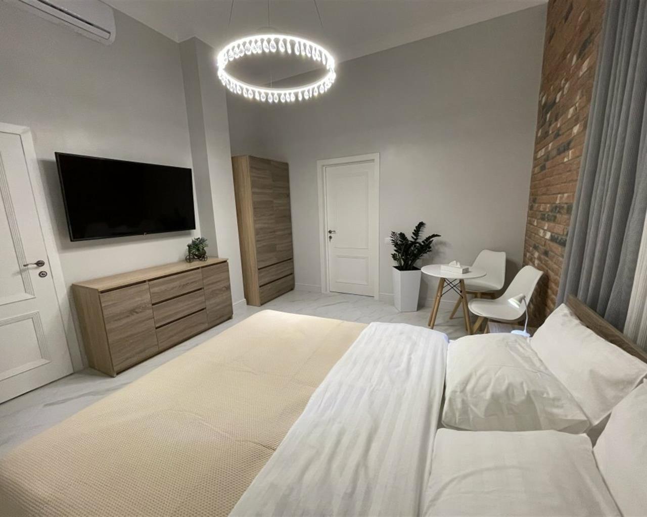 В номере: вешалка, гардеробная, диван раскладной, зеркало, кровать двуспальная, кухонная мебель, прикроватные тумбочки, стол, стулья, тумба под телевизор, шкаф, гладильная доска, кондиционер, кофемашина, микроволновая печь, набор посуды, телевизор ЖК, утюг, холодильник, электрочайник