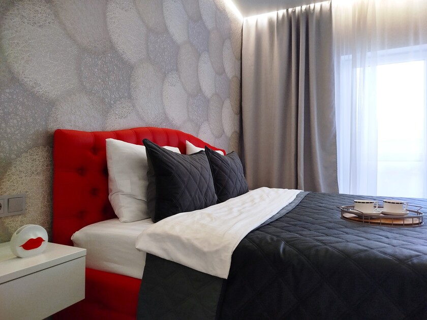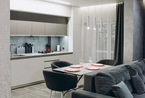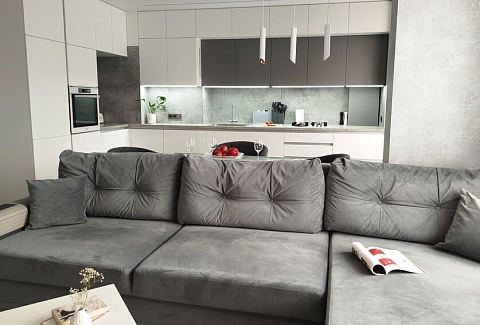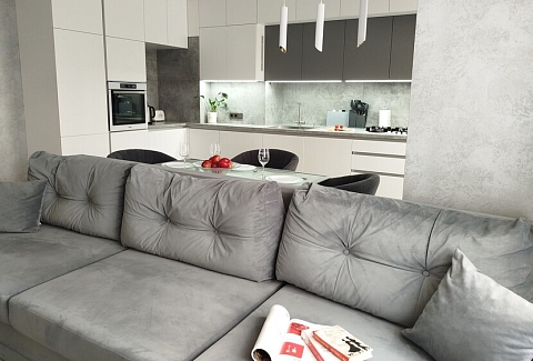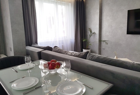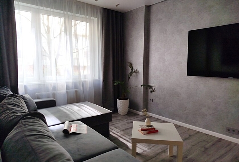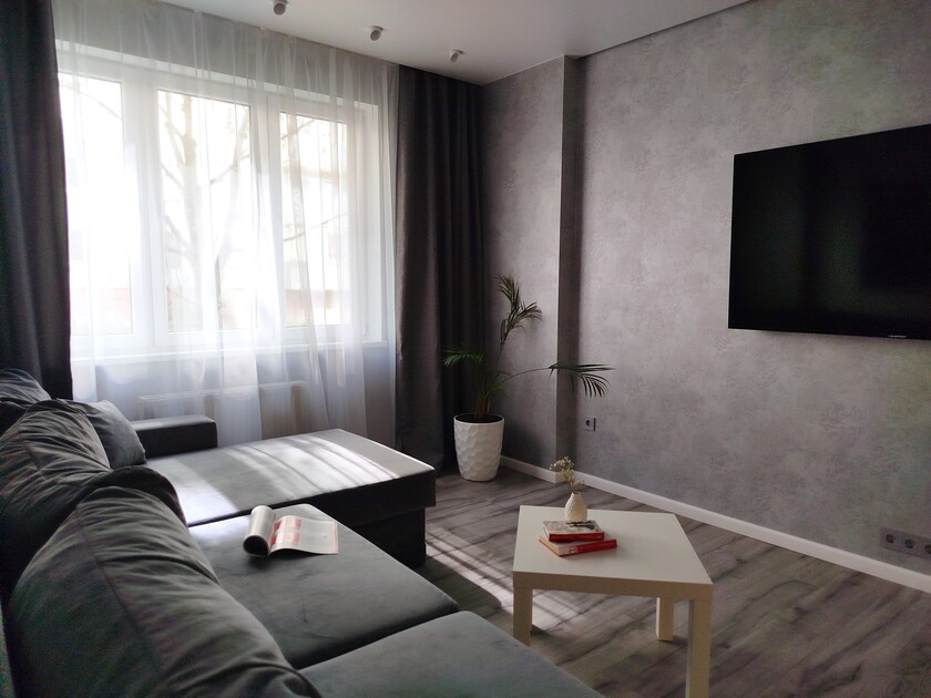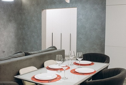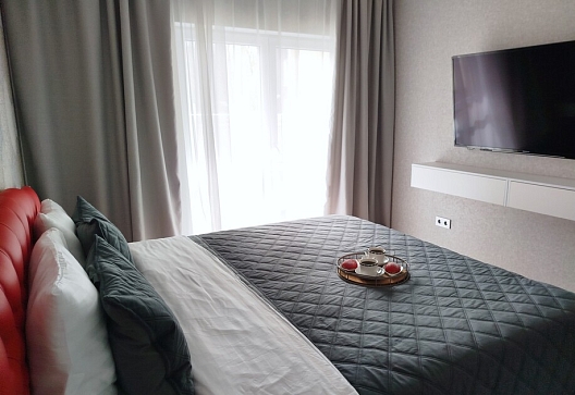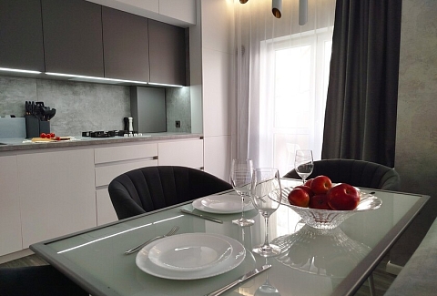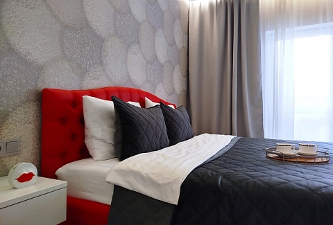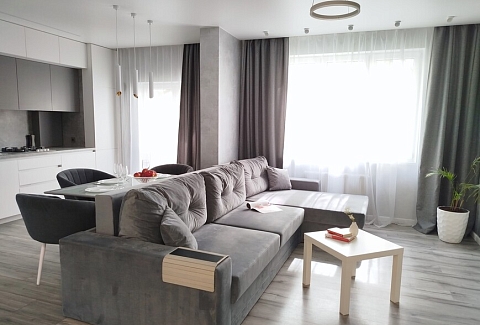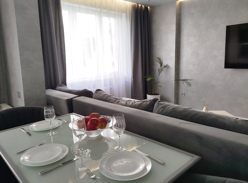 Апартаменты предоставляют гостям функциональное пространство для проживания. В соответствии со стандартами обслуживания, после каждого отъезда проводится влажная уборка, а для гостей предоставляется свежее постельное белье из профессиональной прачечной. В помещении оборудовано всё необходимое для быта, включая базовые средства гигиены, комплект посуды и бытовую технику.Интерьер выполнен в современном стиле, обеспечивая практичность и комфорт.