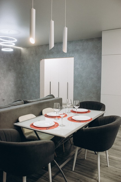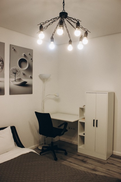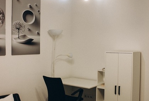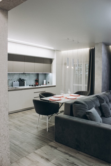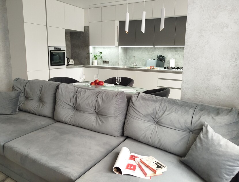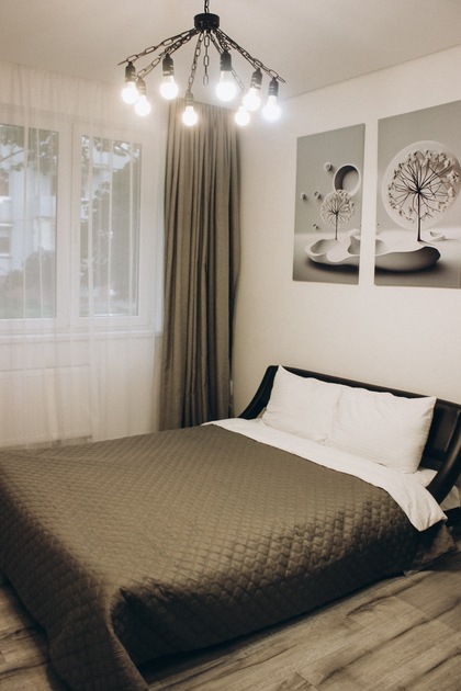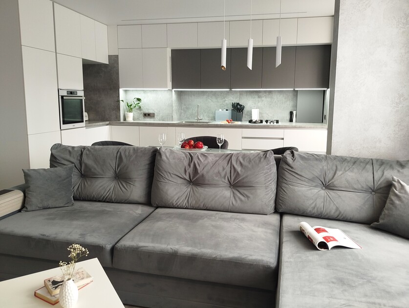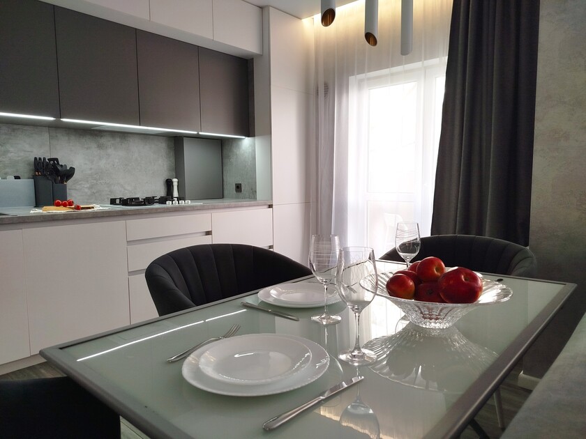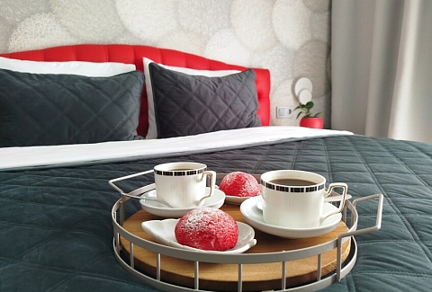 Апартаменты предоставляют гостям функциональное пространство для проживания. В соответствии со стандартами обслуживания, после каждого отъезда проводится влажная уборка, а для гостей предоставляется свежее постельное белье из профессиональной прачечной. В помещении оборудовано всё необходимое для быта, включая базовые средства гигиены, комплект посуды и бытовую технику.Интерьер выполнен в современном стиле, обеспечивая практичность и комфорт.