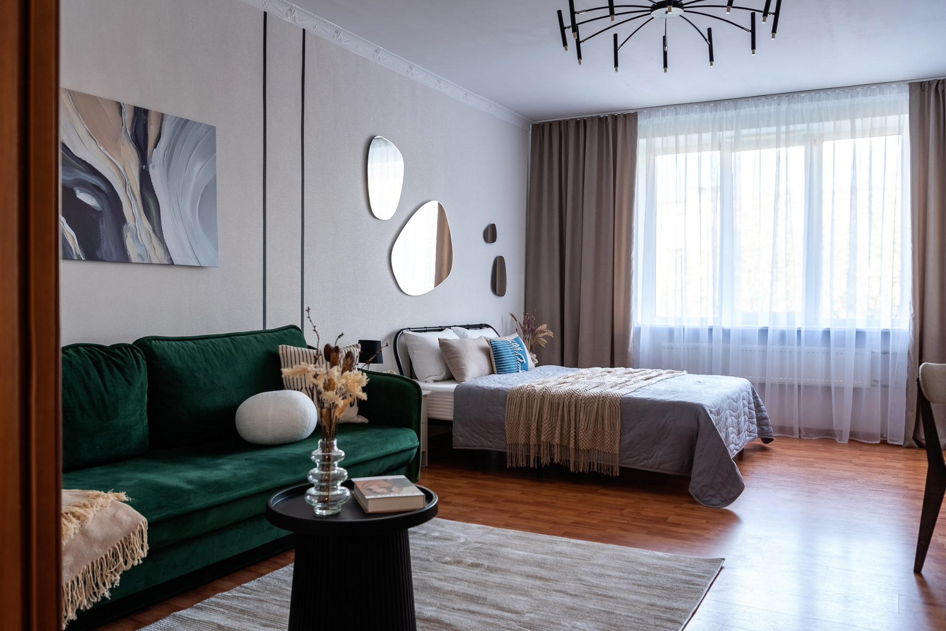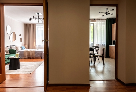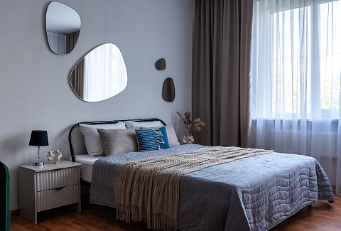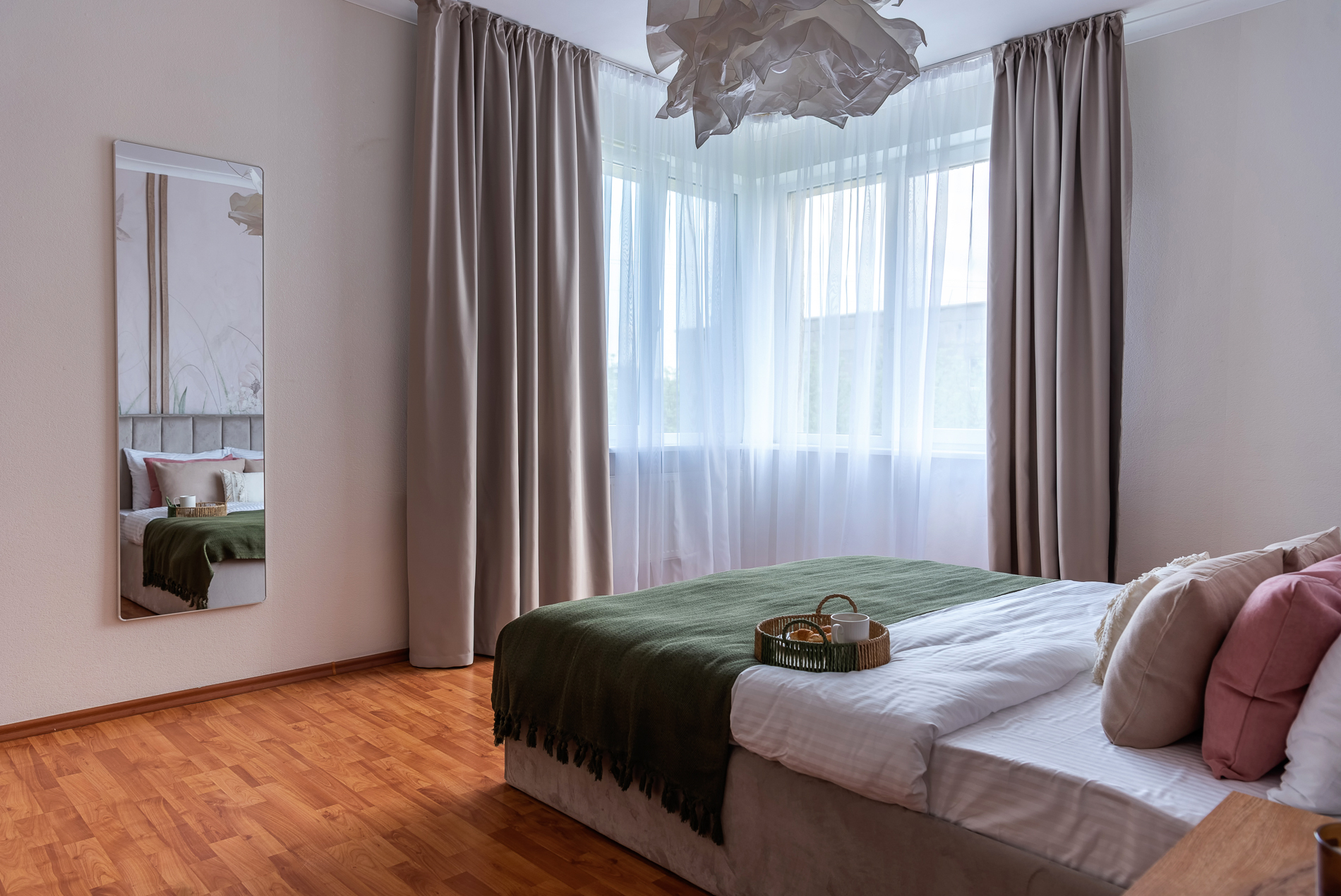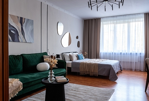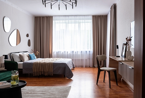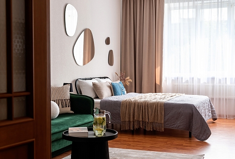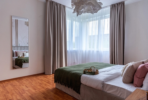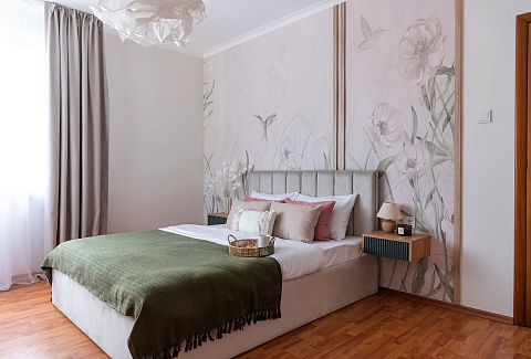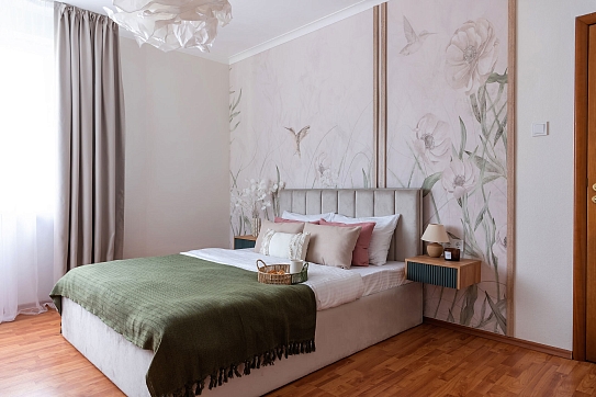 Апартаменты «Флора» расположены в центре Калининграда, в доме с закрытой огороженной территорией и детской площадкой. Тихий зелёный двор гарантирует спокойный сон — до Южного вокзала и Бранденбургских ворот идти 5 минут, до Острова Канта 10 минут, а до Музея Мирового океана 15. Рядом есть продуктовый магазин, пекарня и рестораны.Внутри — две изолированные спальни, два санузла (один с ванной, второй с гигиеническим душем) и лоджия с креслом-качелью.