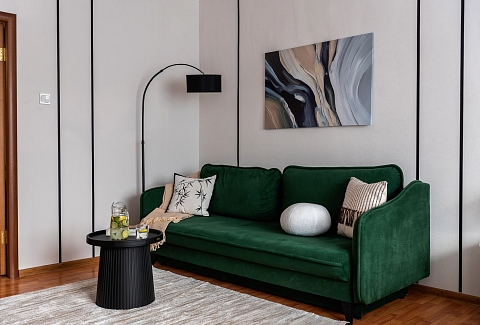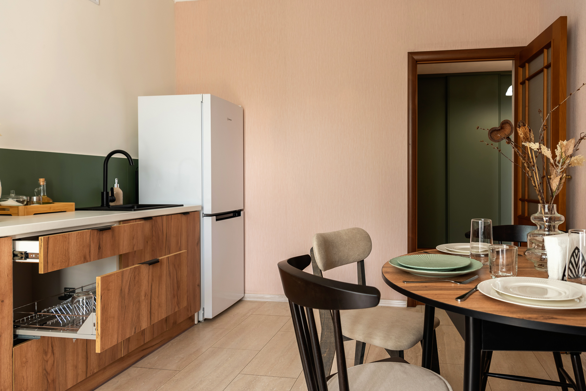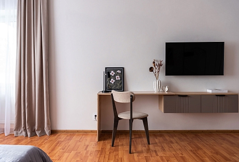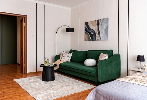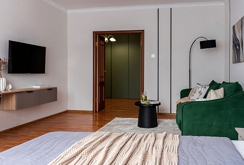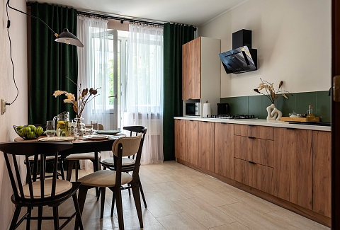 Гостей разместятся на двух двуспальных кроватях 160×200 и удобном диване-книжке (до 6 человек). Кухня полностью оборудована: газовая плита, холодильник, микроволновка, фильтр для воды и посуда. Есть стиральная машина, фен, утюг с гладильной доской, сушилка для белья, два вентилятора, телевизор и Wi-Fi. Для работы предусмотрен отдельный стол.Всё продумано для комфортной жизни в центре города без лишнего шума.