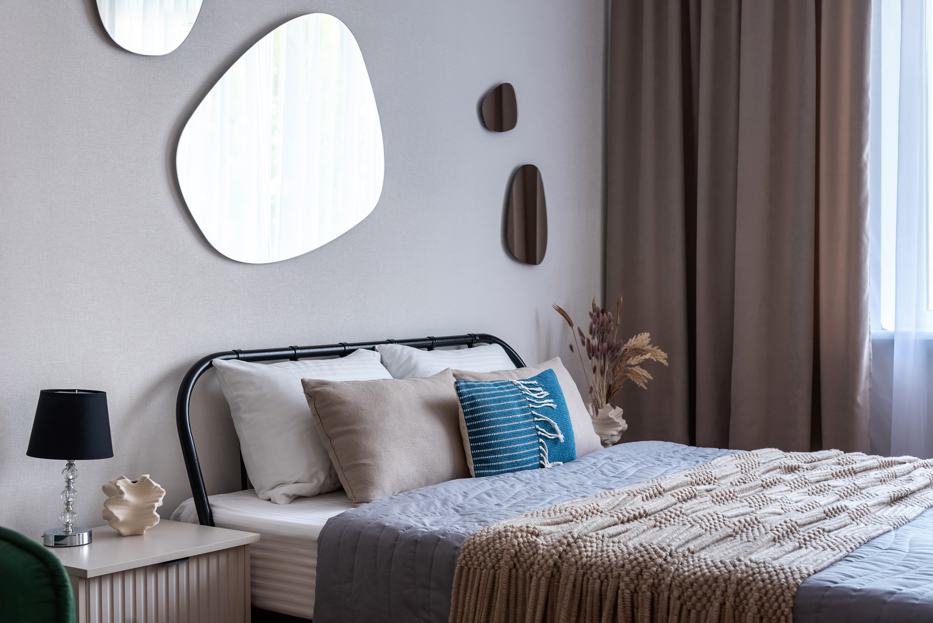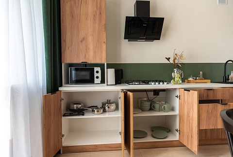 В номере: диван, зеркало, кровать двуспальная, стол, стулья, шкаф, микроволновая печь, набор посуды, плита электрическая, стиральная машина, сушилка для белья, телевизор ЖК, утюг, холодильник, электрочайник