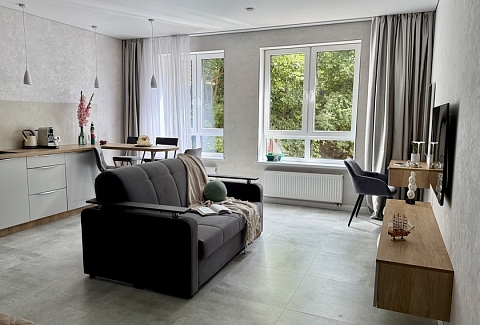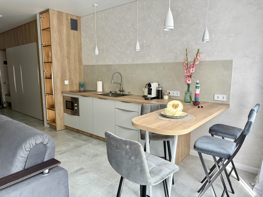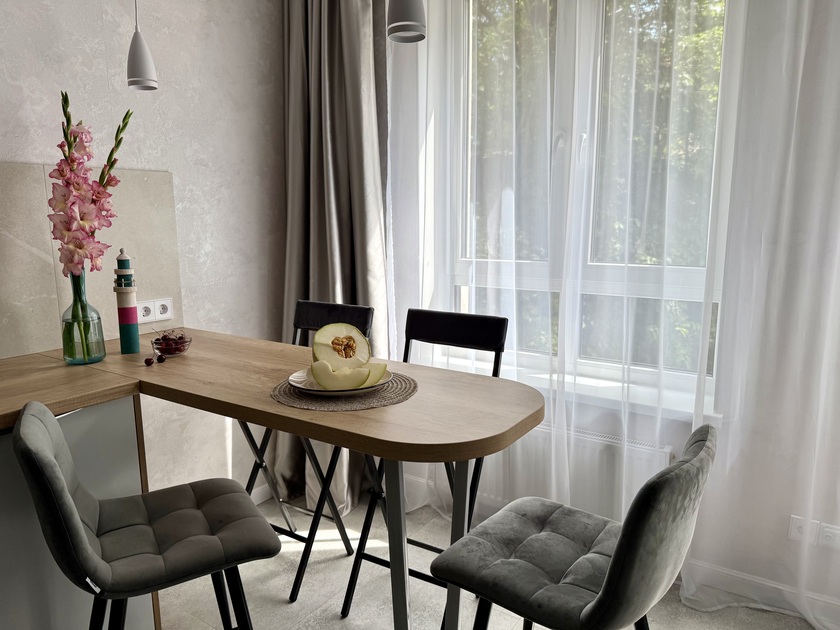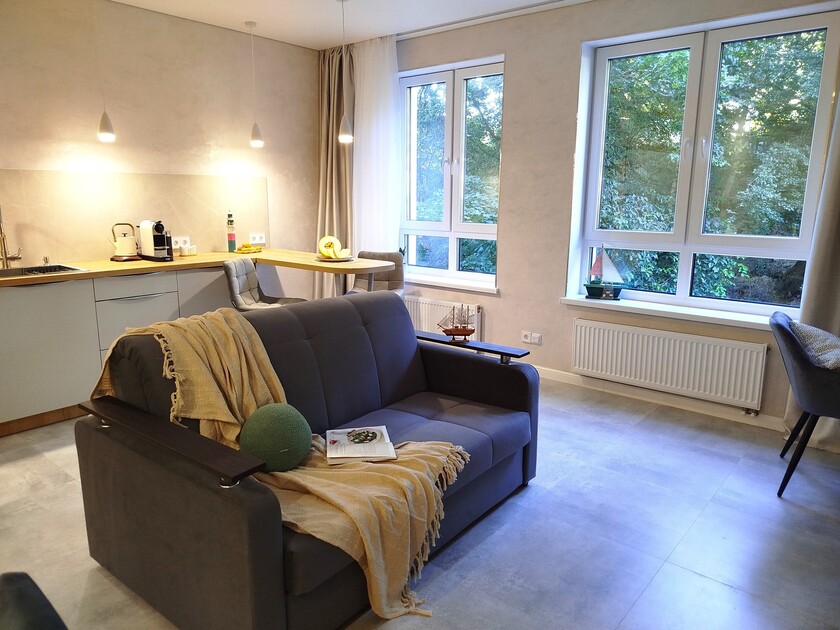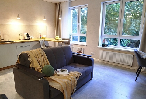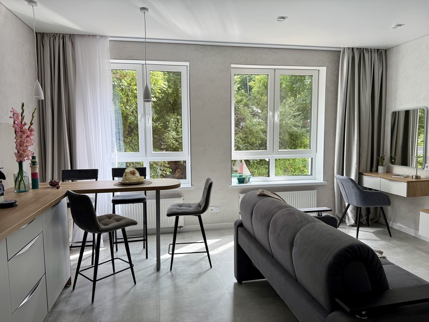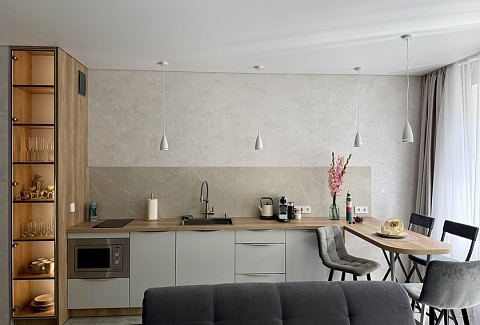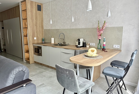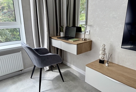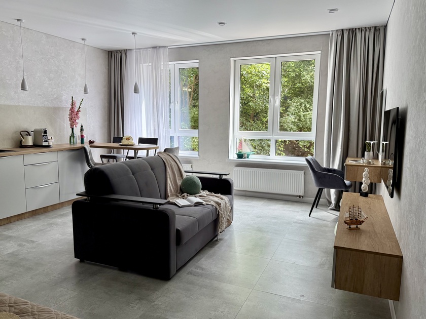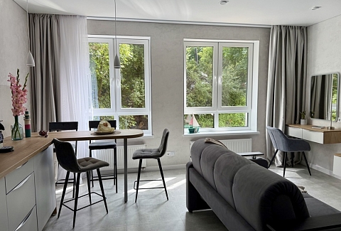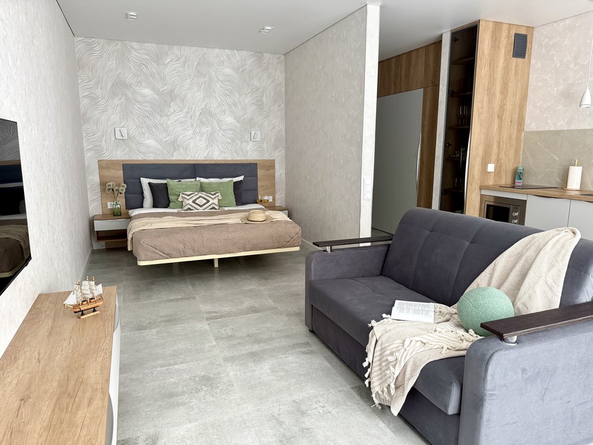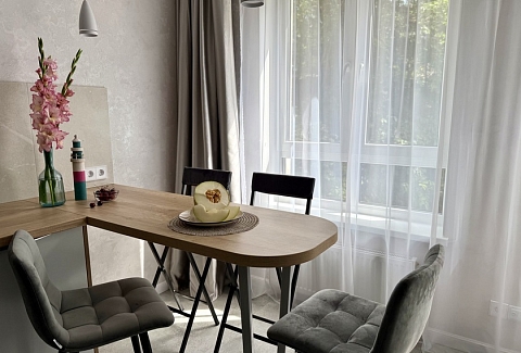Апартаменты предоставляют гостям функциональное пространство для проживания. В соответствии со стандартами обслуживания, после каждого отъезда проводится влажная уборка, а для гостей предоставляется свежее постельное белье из профессиональной прачечной. В помещении оборудовано всё необходимое для быта, включая базовые средства гигиены, комплект посуды и бытовую технику.Интерьер выполнен в современном стиле, обеспечивая практичность и комфорт.