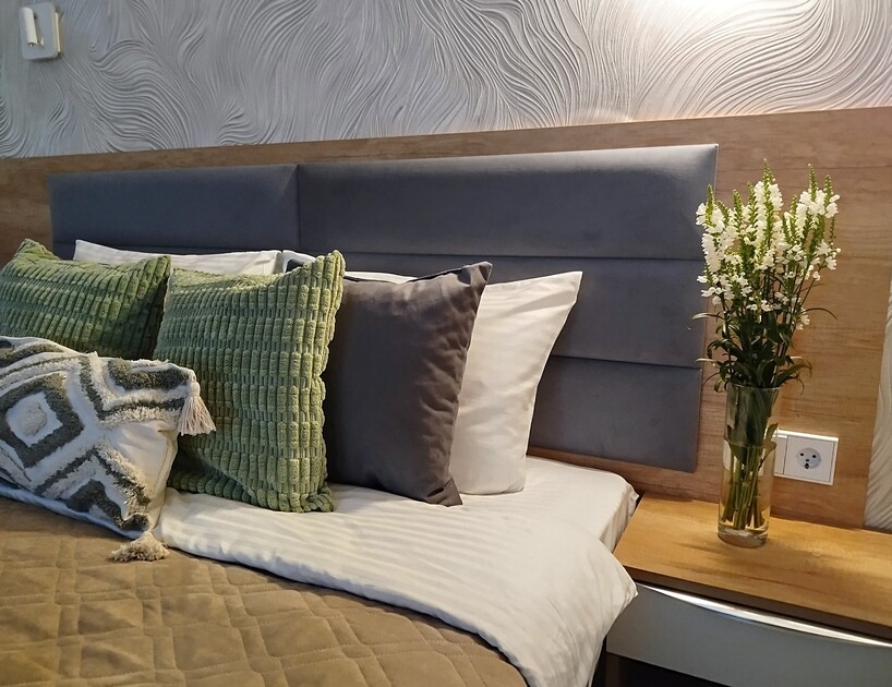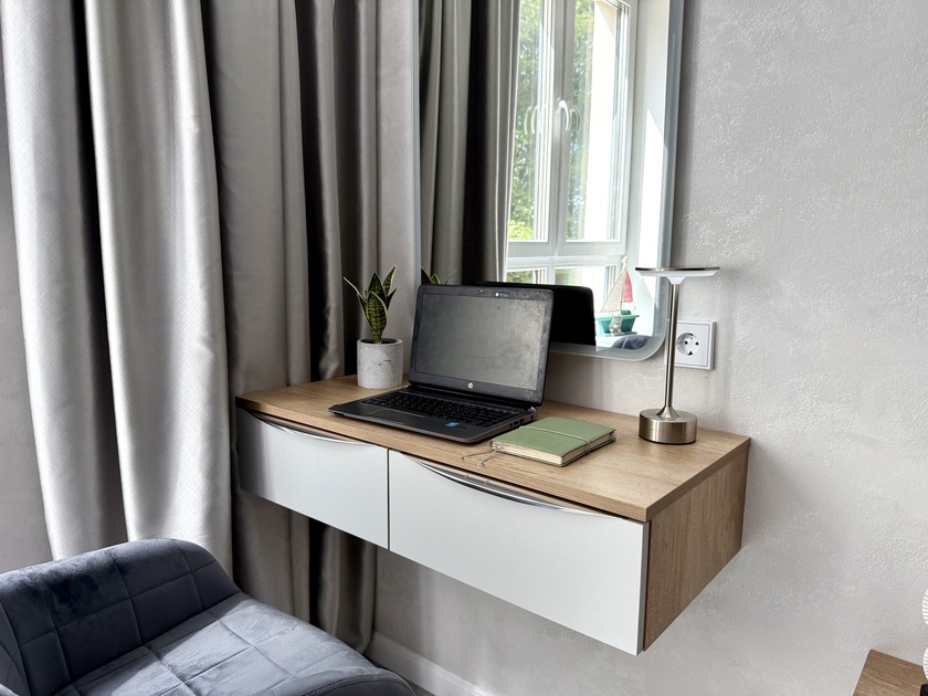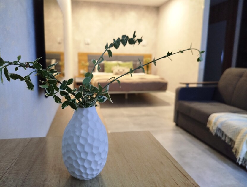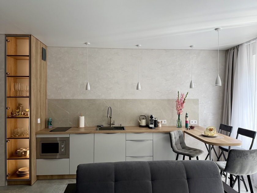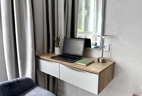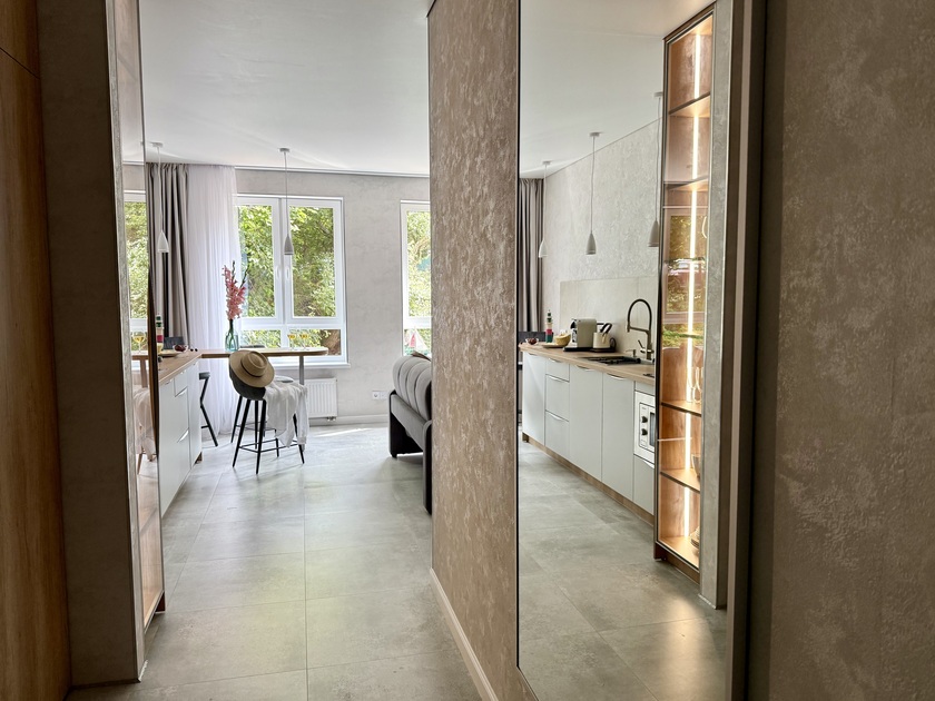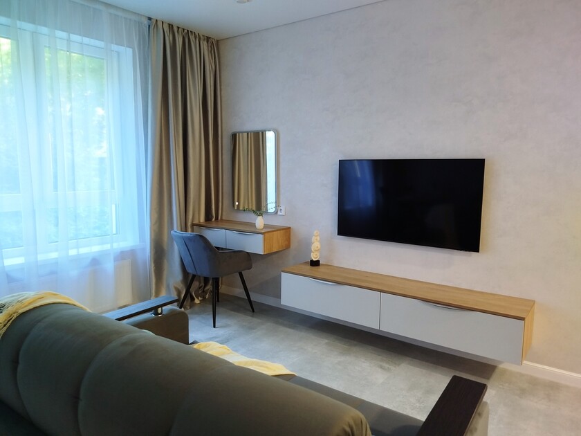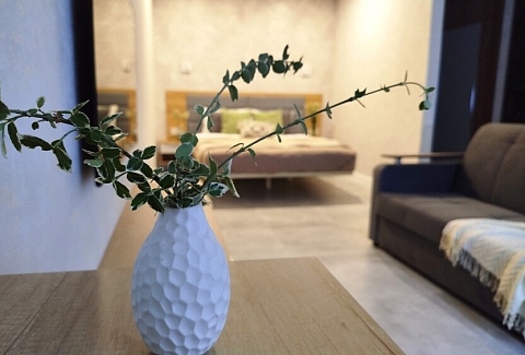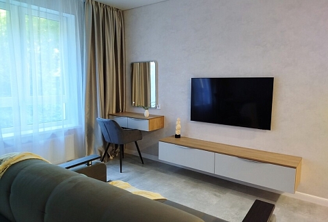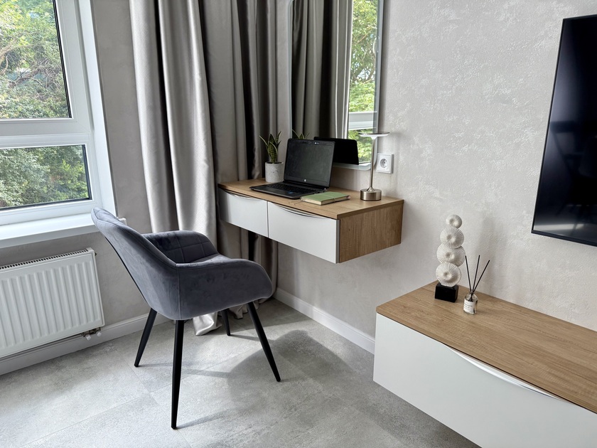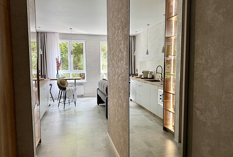 Апартаменты предоставляют гостям функциональное пространство для проживания. В соответствии со стандартами обслуживания, после каждого отъезда проводится влажная уборка, а для гостей предоставляется свежее постельное белье из профессиональной прачечной. В помещении оборудовано всё необходимое для быта, включая базовые средства гигиены, комплект посуды и бытовую технику.Интерьер выполнен в современном стиле, обеспечивая практичность и комфорт.