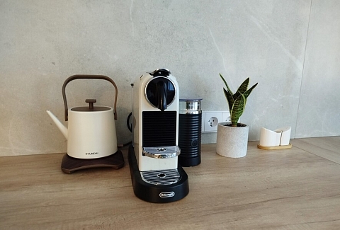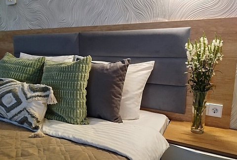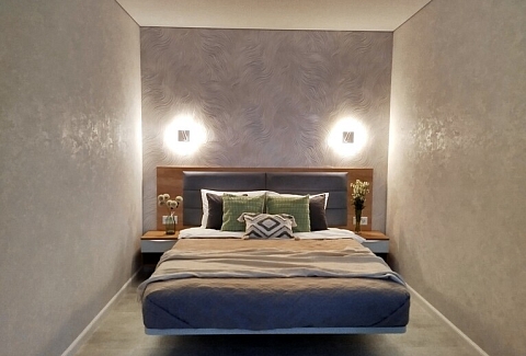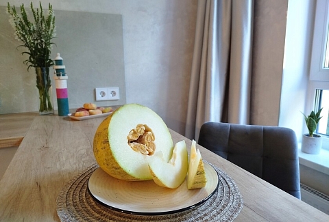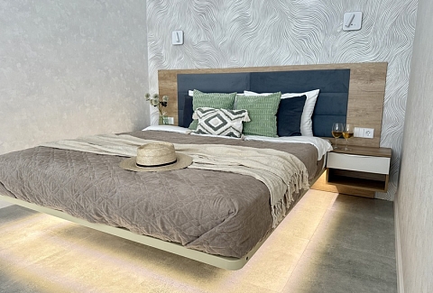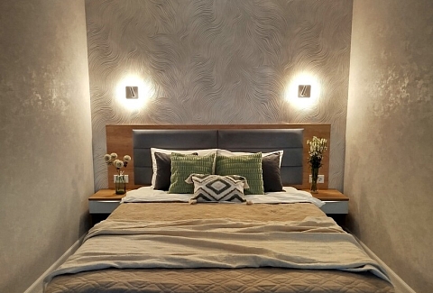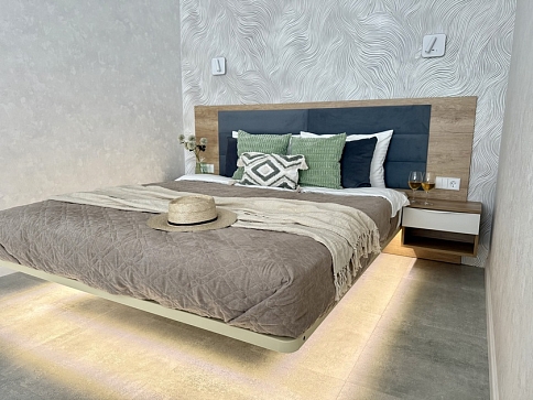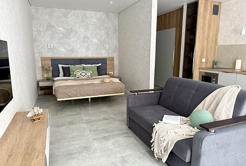 В номере: диван, зеркало, кровать двуспальная, стол, стулья, шкаф, гладильная доска, духовой шкаф, кондиционер, кофемашина, микроволновая печь, мини-холодильник, набор посуды, плита электрическая, посудомоечная машина, стиральная машина, сушилка для белья, телевизор ЖК, утюг, холодильник, чайный набор посуды, электрочайник